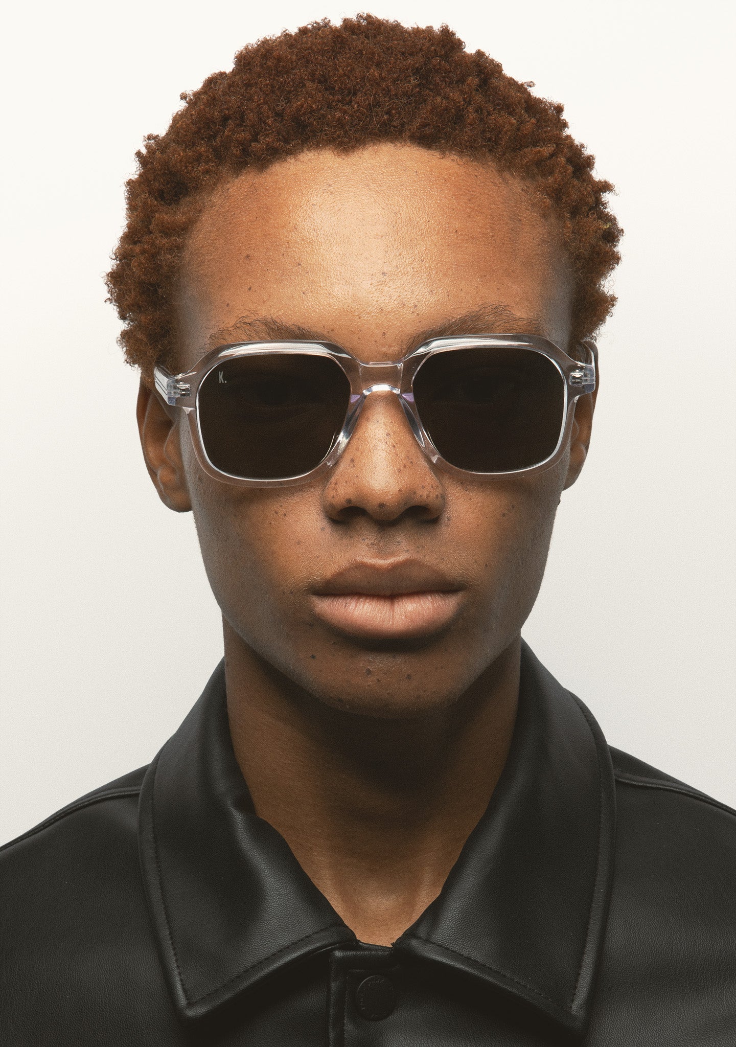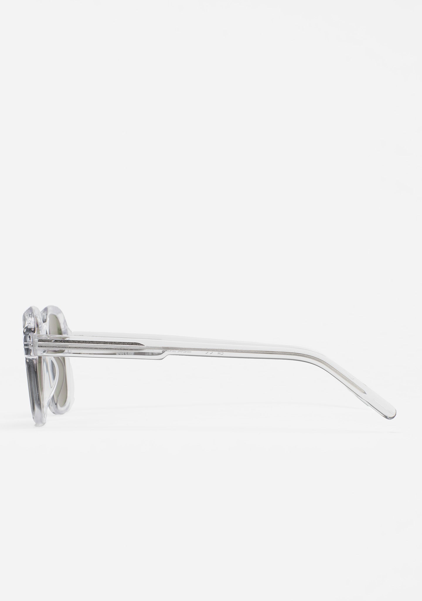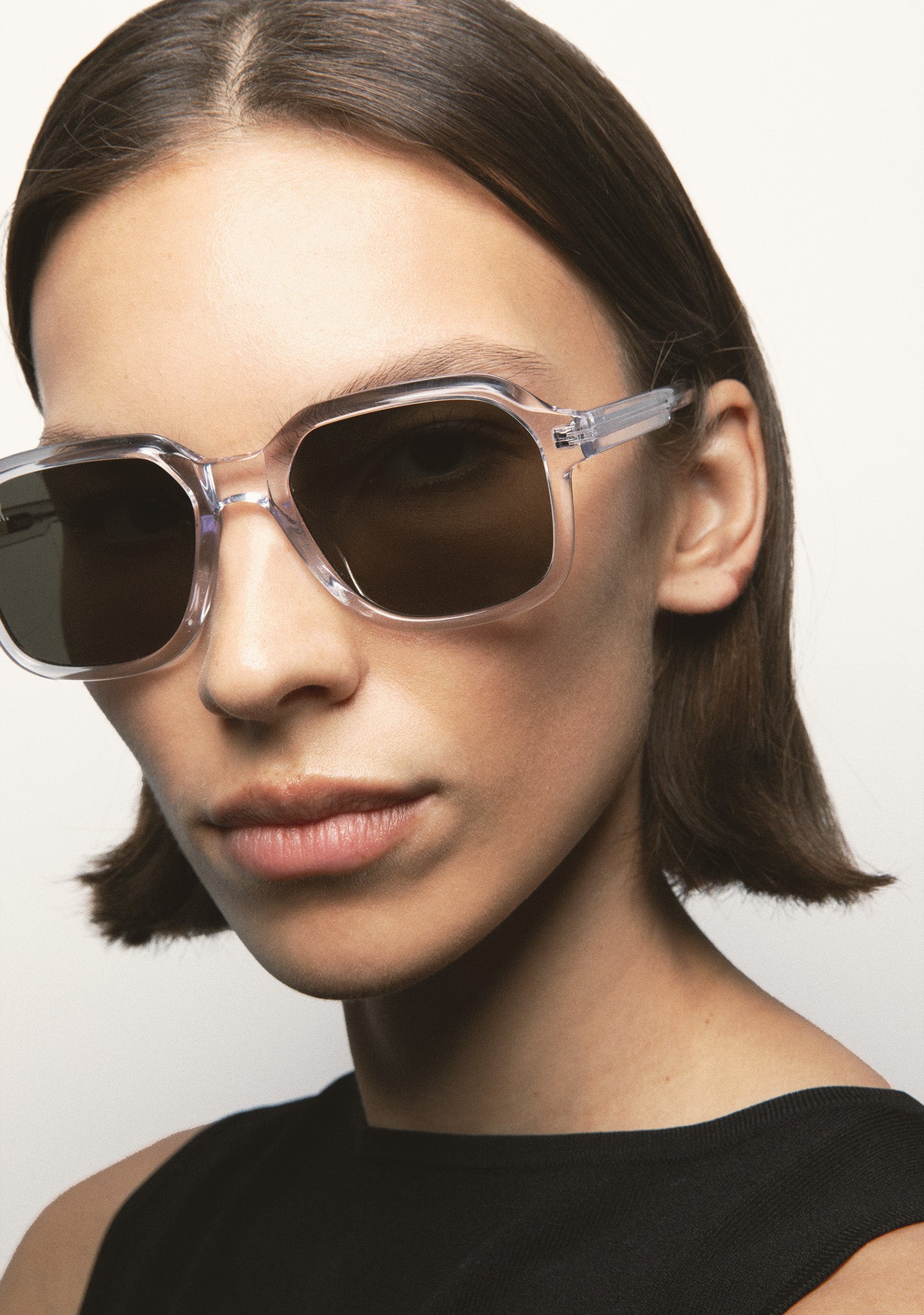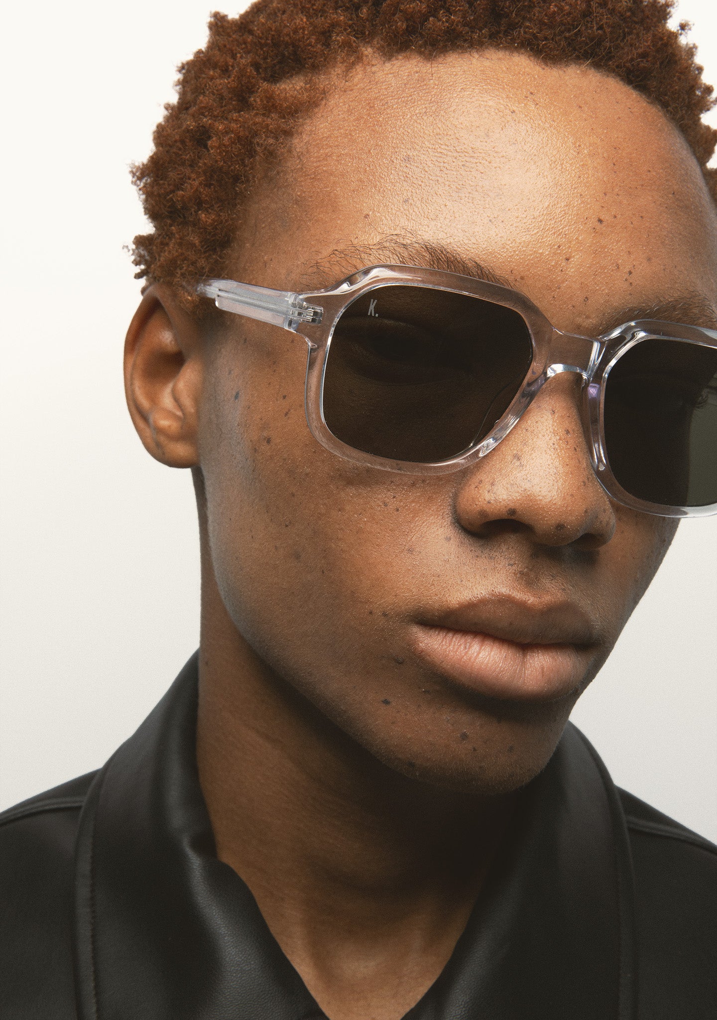 Square-shaped sunglasses with milling around the lenses. Black acetate frame front and temples. Photochromic green lenses, base 2, with UV protection and anti-reflective treatment. Category 1-3 lenses. Built-in acetate nose pads. Handmade.