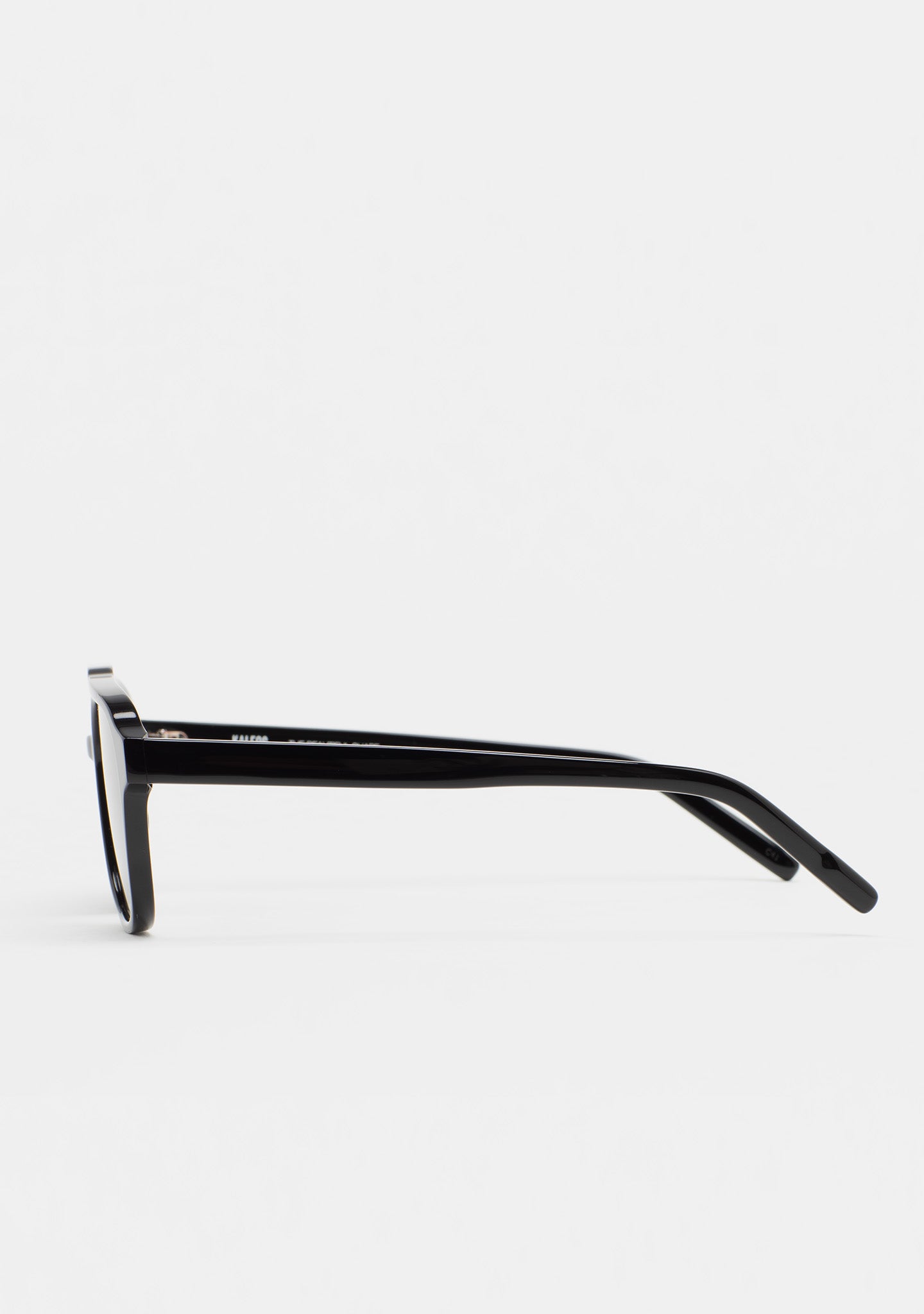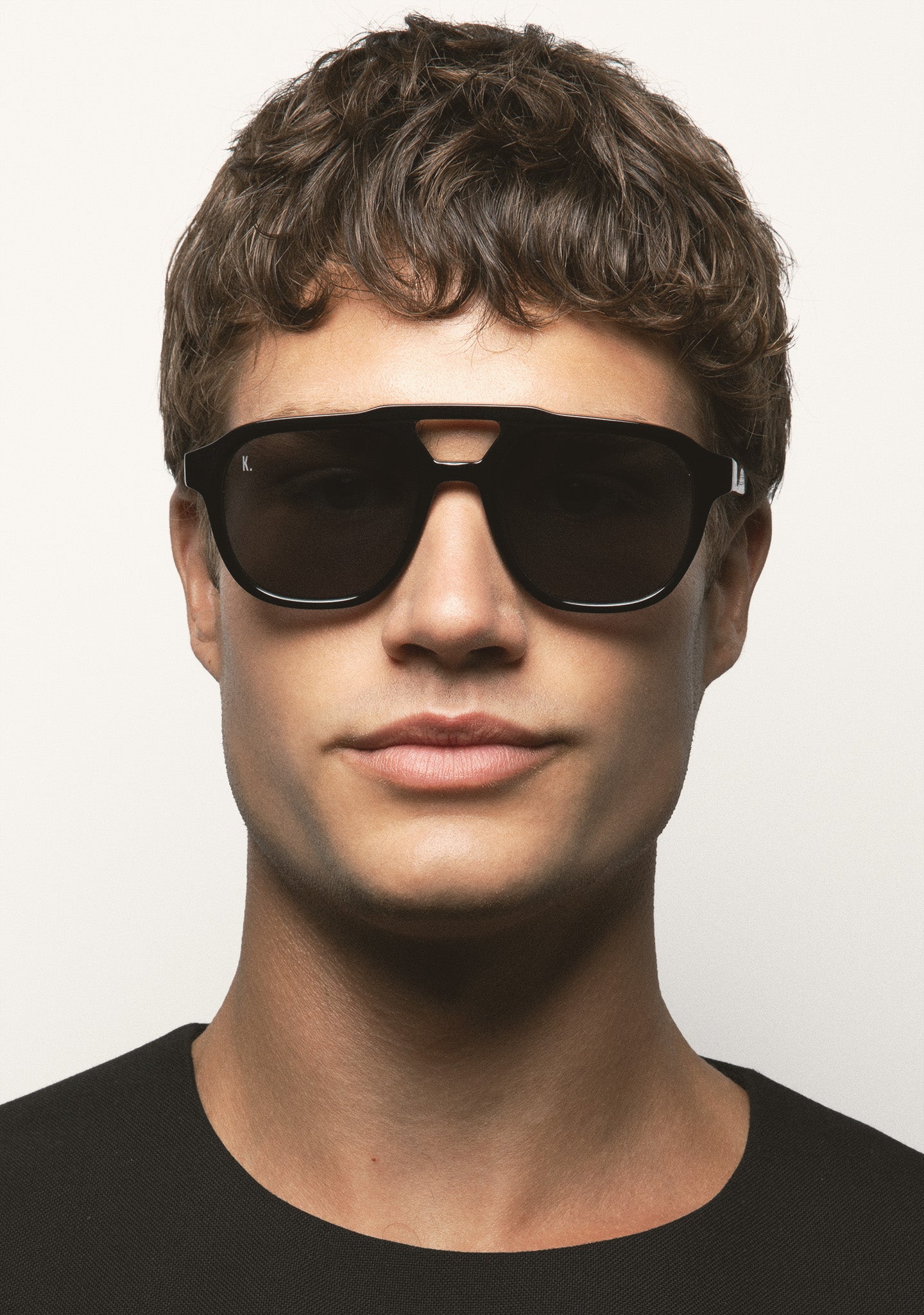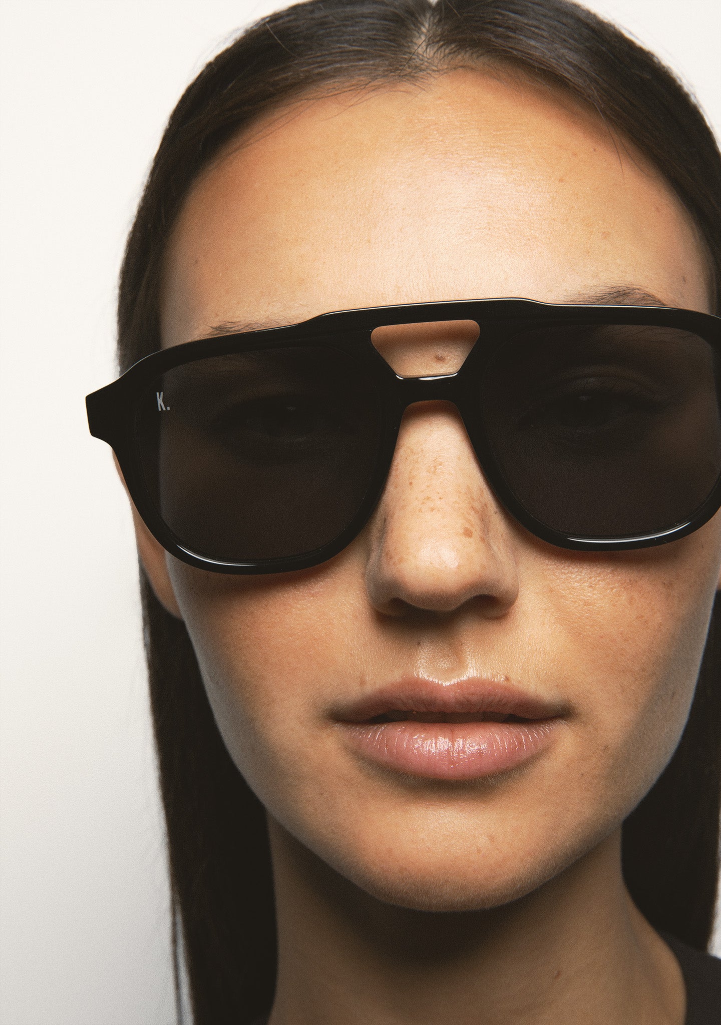 Square sunglasses with double bridge. Honey havana acetate front and temples. Dark green lenses, base 2, with 100% UV protection and anti-reflective coating. Category 3 lenses. Integrated acetate nose pads. Handmade.
