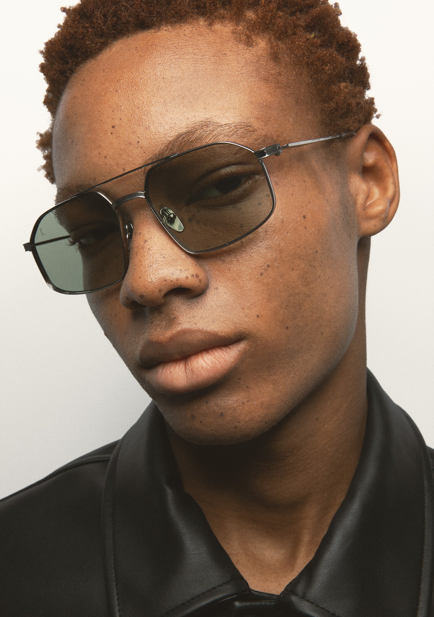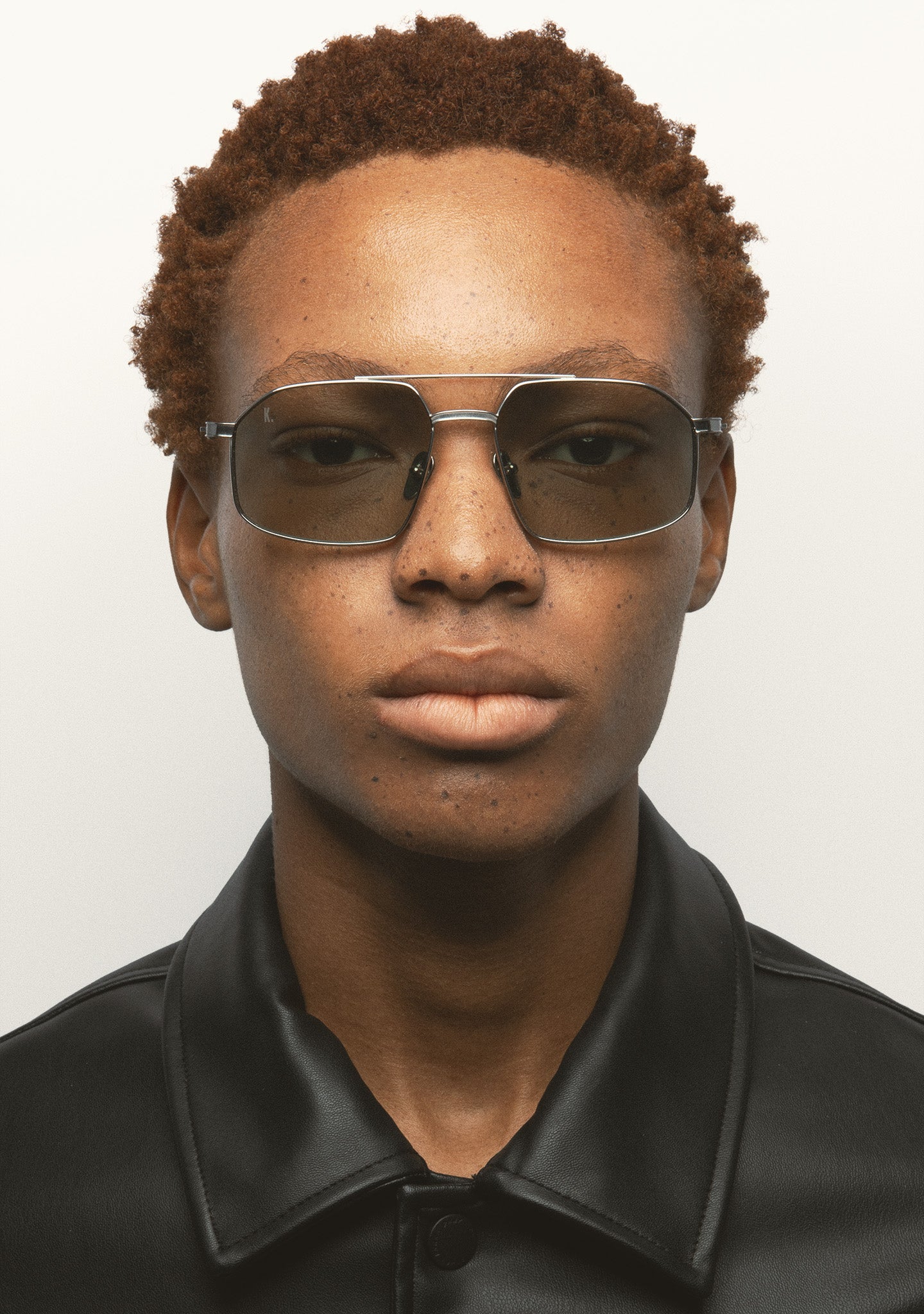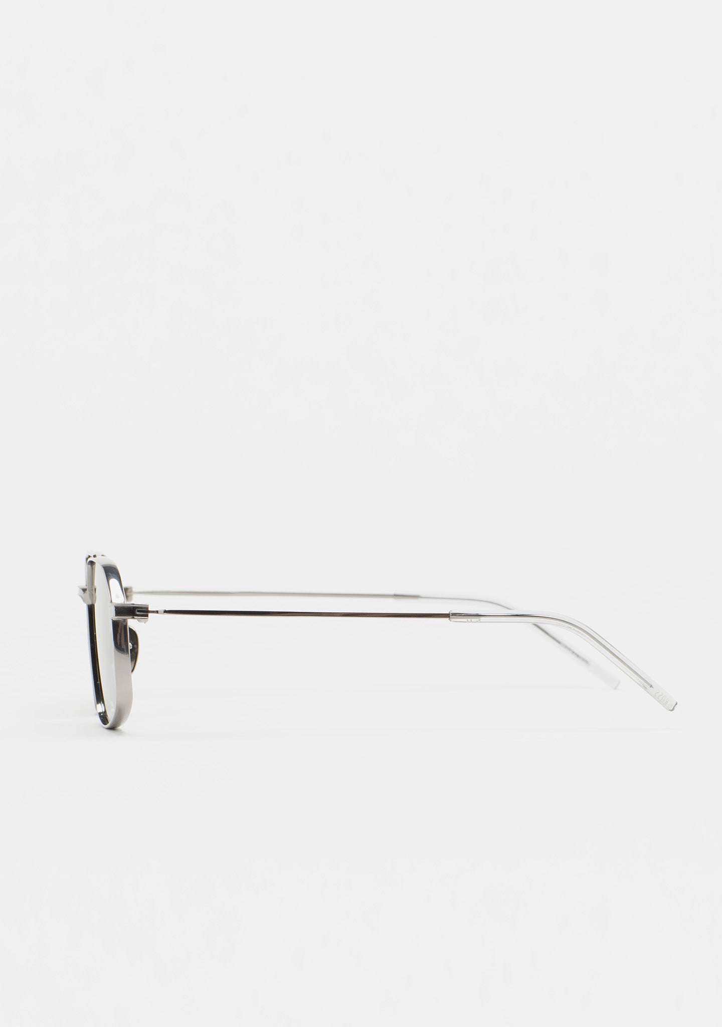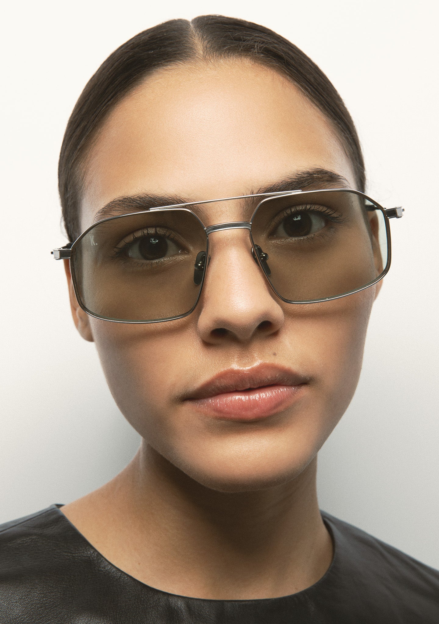 Rectangular sunglasses with double bridge. Silver titanium front and temples. Temples end in transparent gray acetate tips. Green photochromic lenses, base 2, with 100% UV protection and anti-reflective coating. Category 1 3 lenses. Integrated nose pads. Handmade.