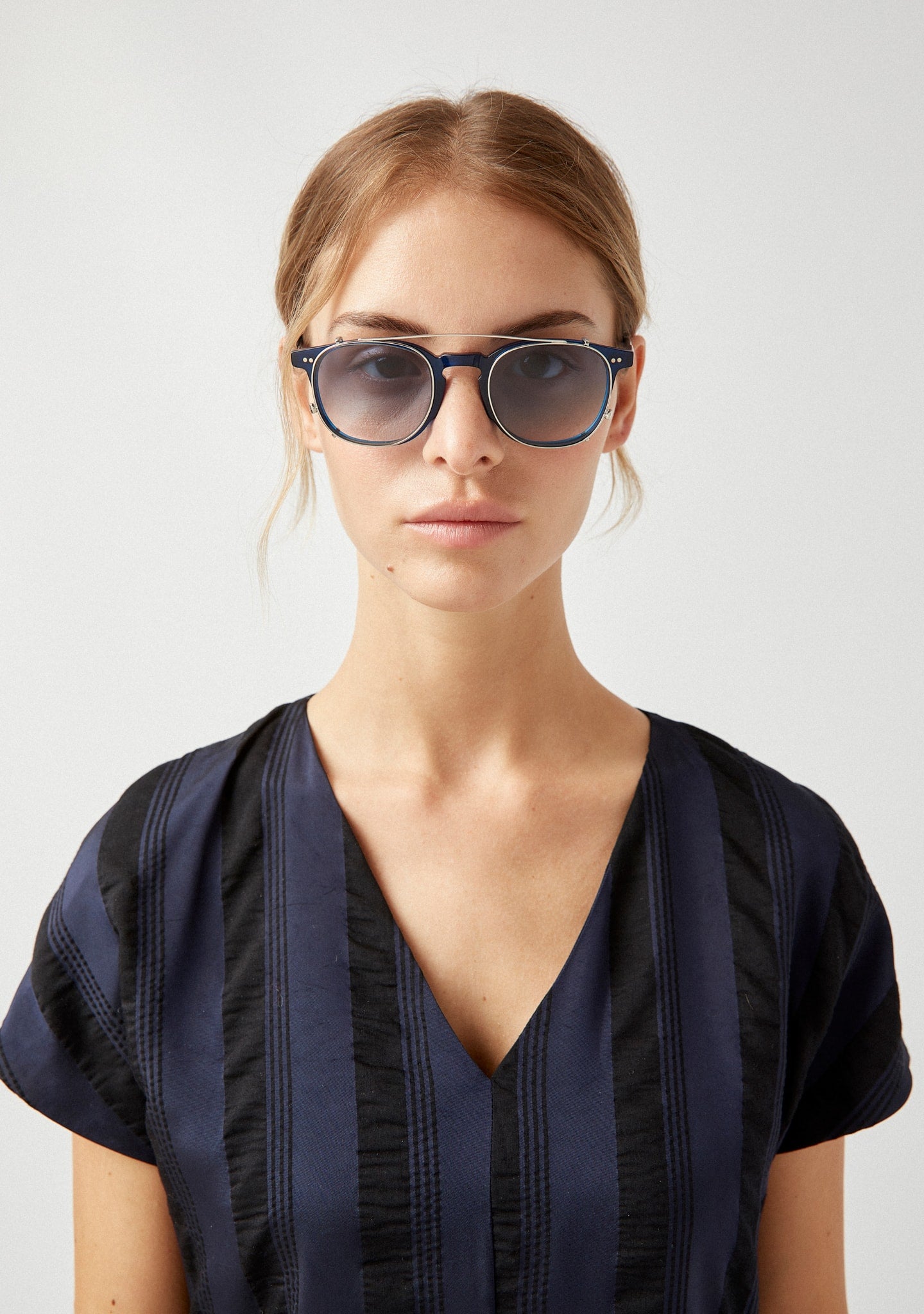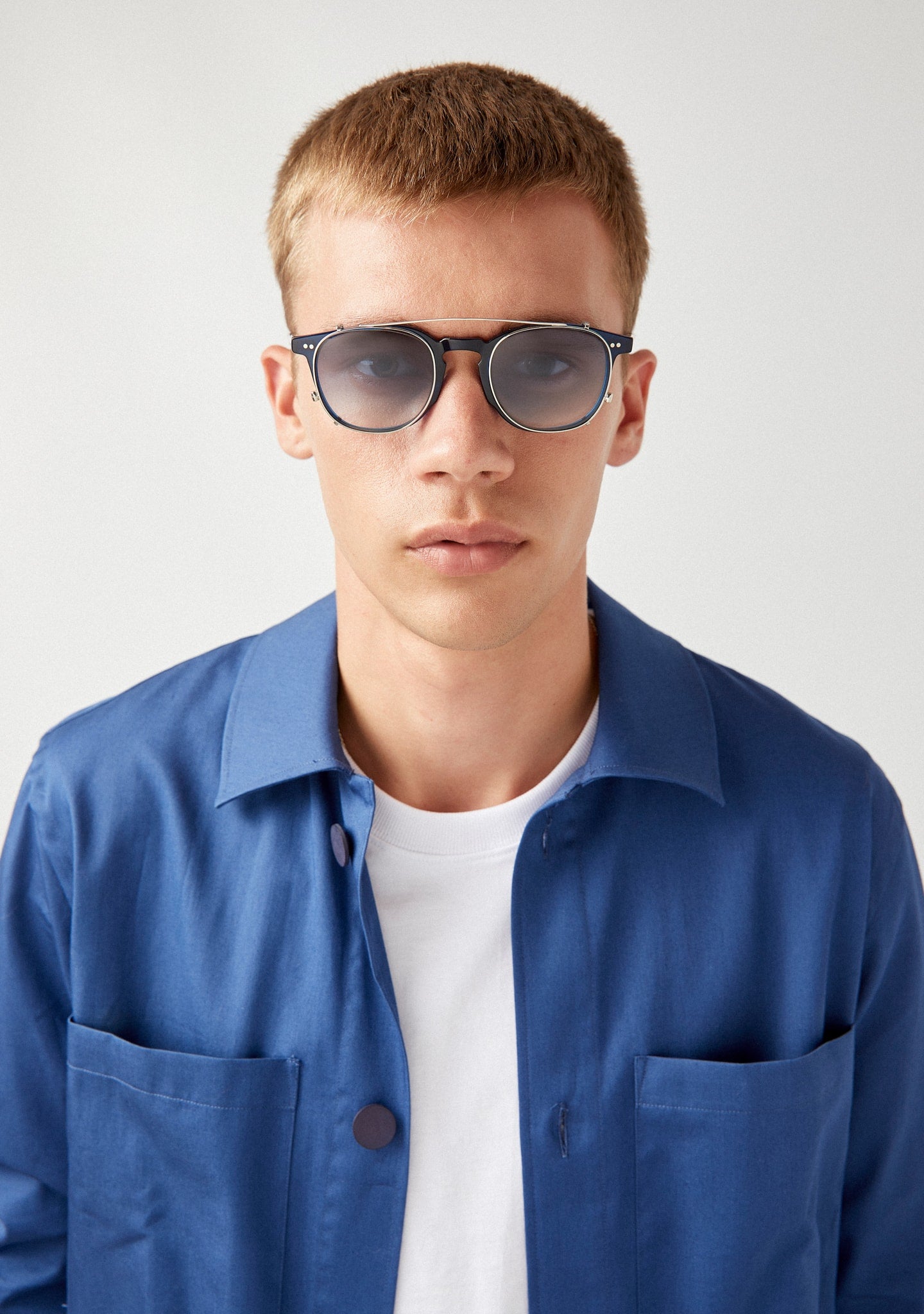 Clip that turns frames into sunglasses, with grey gradient tint lenses and 100% UV protection.