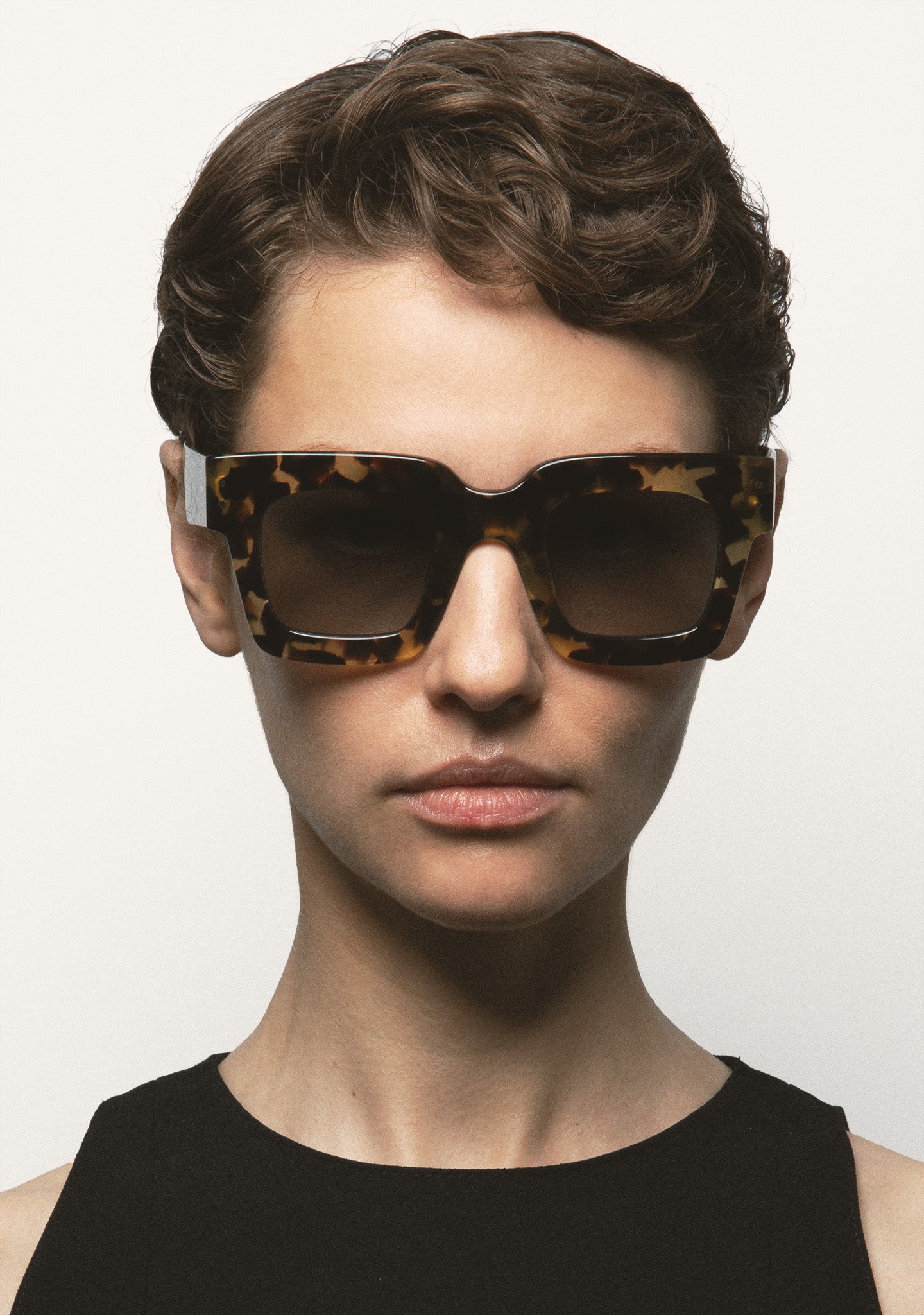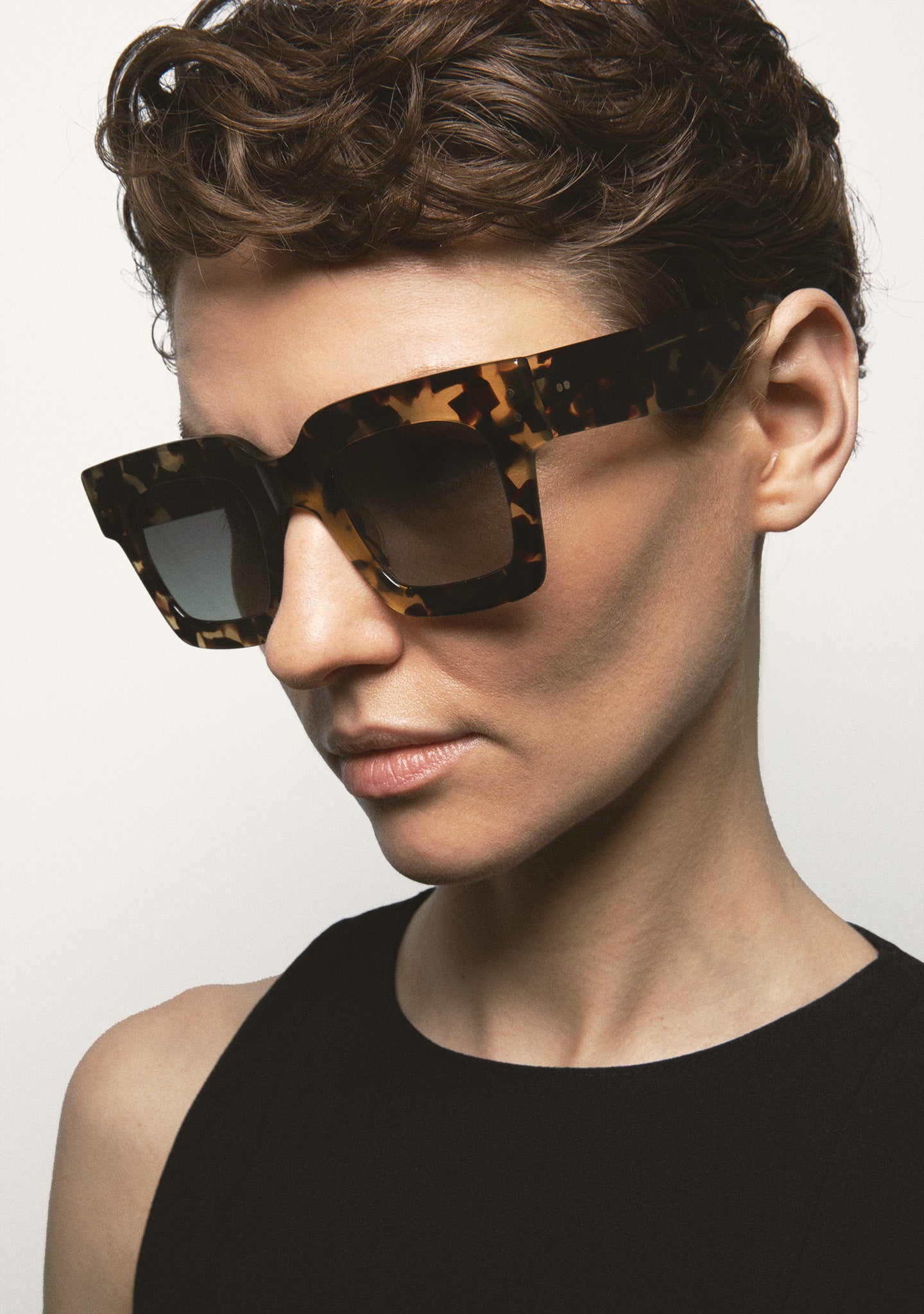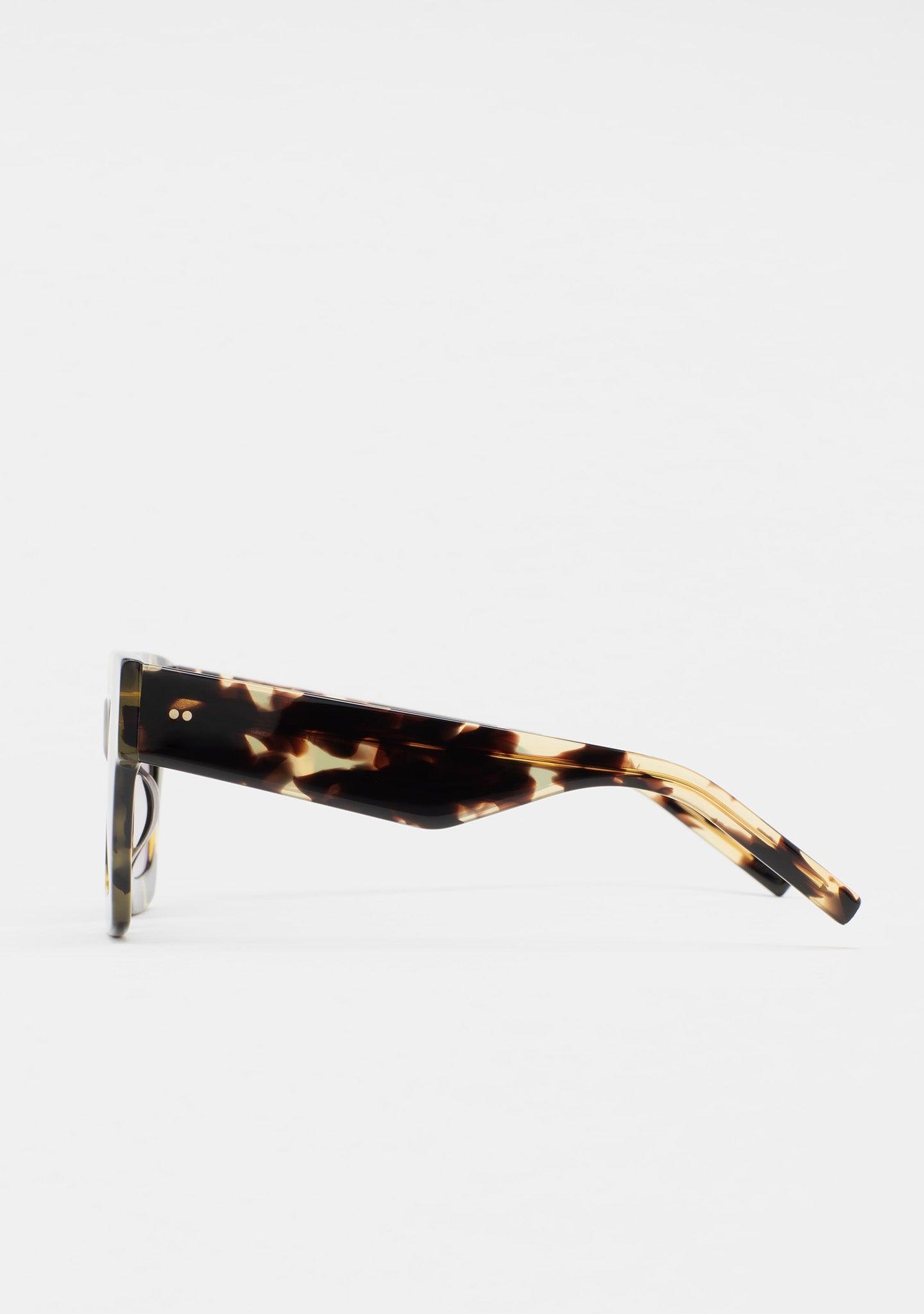 Square-shaped sunglasses. Brown Havana acetate front and temples. Gold rivet hinges at the temple and arms. Gradient green lens, base 2, with 100% UV protection and anti-reflective treatment. Category 2 lens. Integrated acetate nose pads. Handmade.