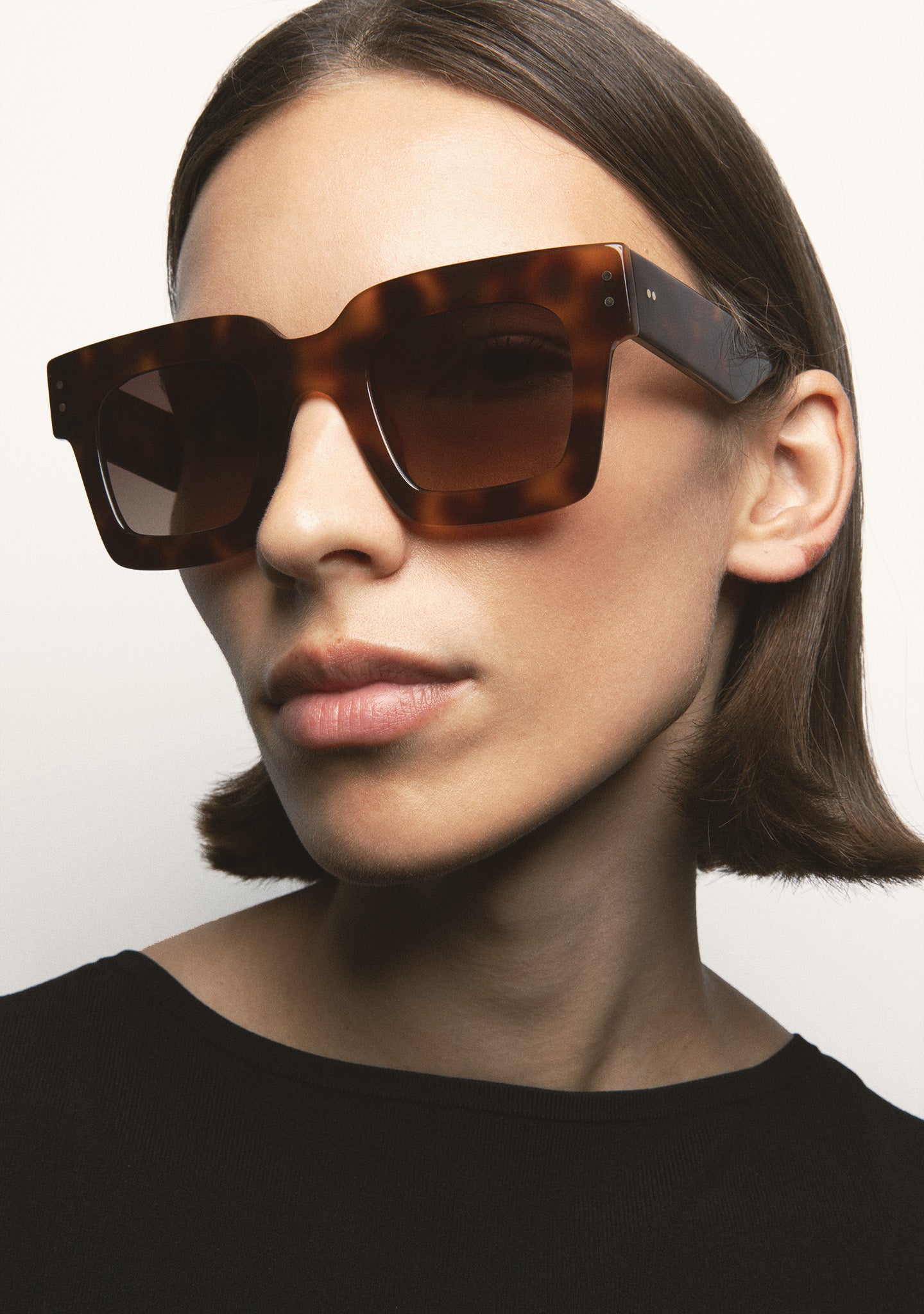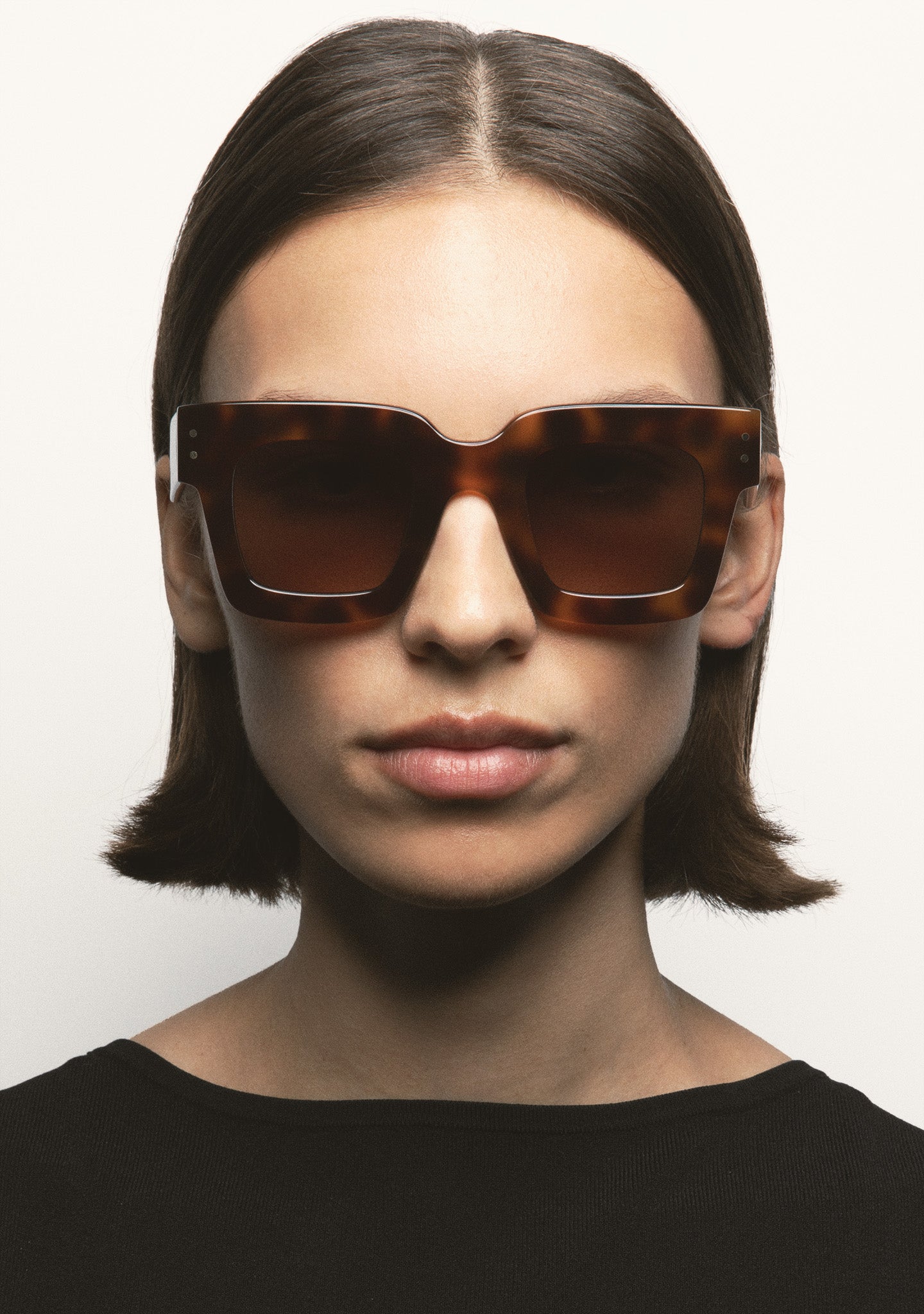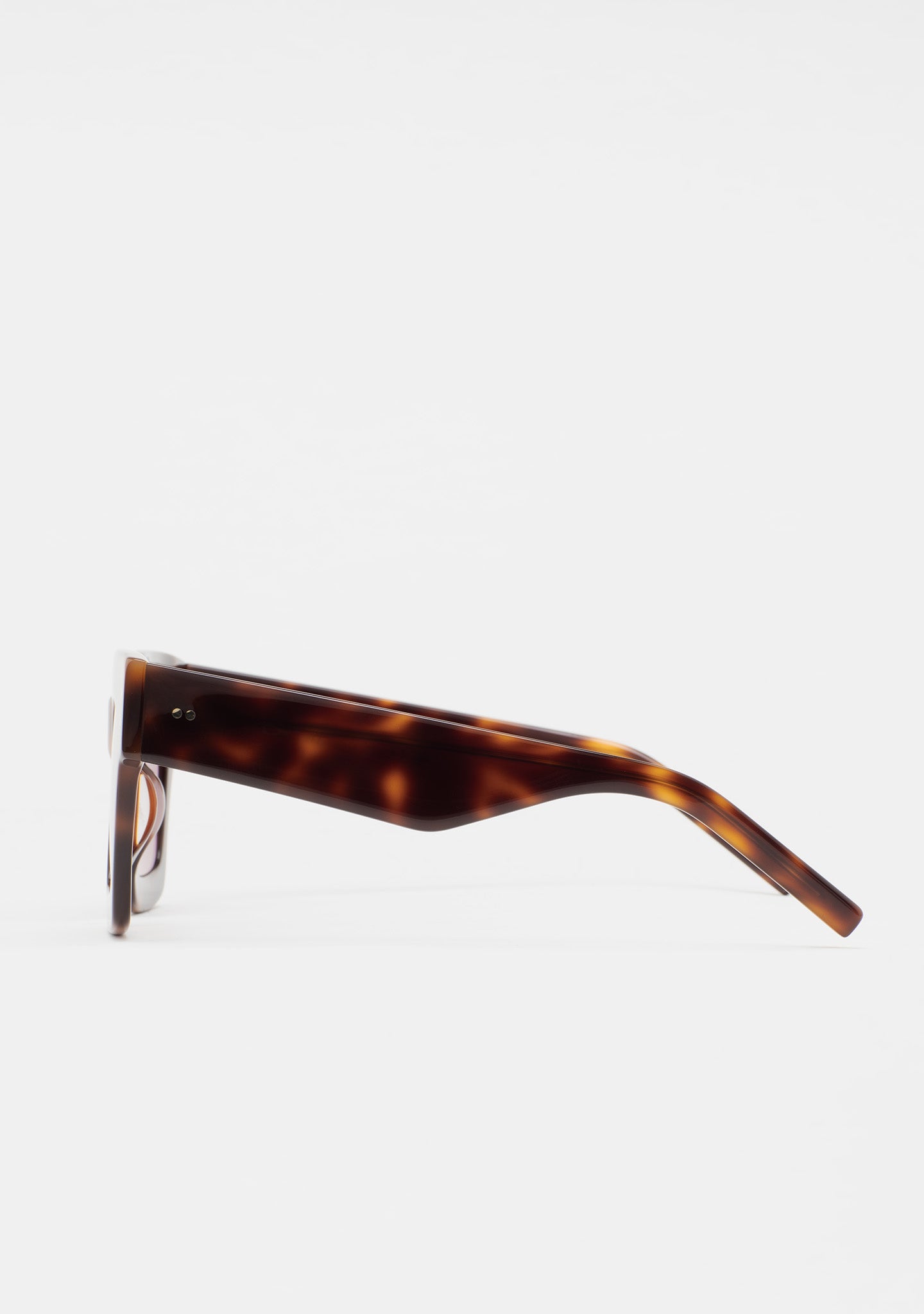 Square-shaped sunglasses. Brown Havana acetate front and temples. Gold rivet hinges at the temple and arms. Gradient green lens, base 2, with 100% UV protection and anti-reflective treatment. Category 2 lens. Integrated acetate nose pads. Handmade.