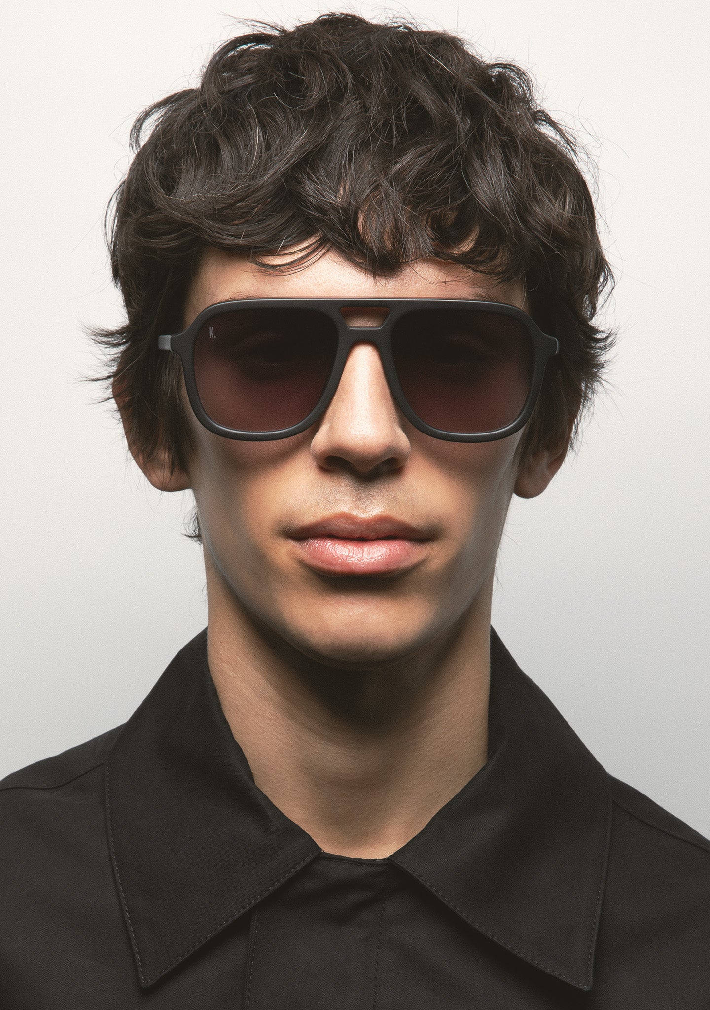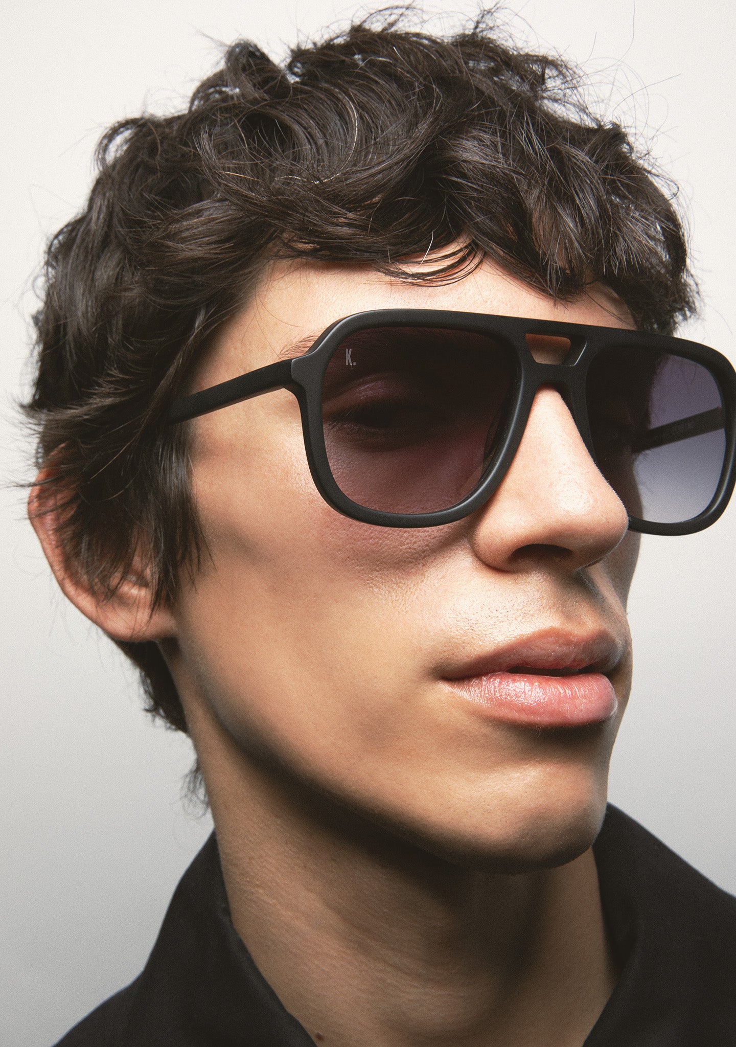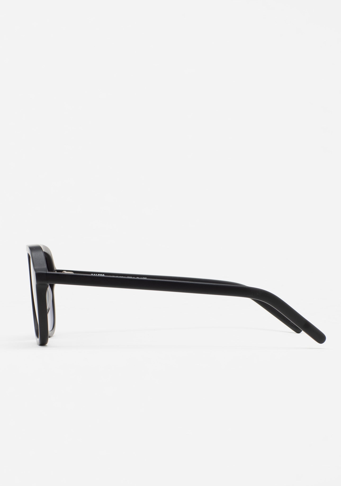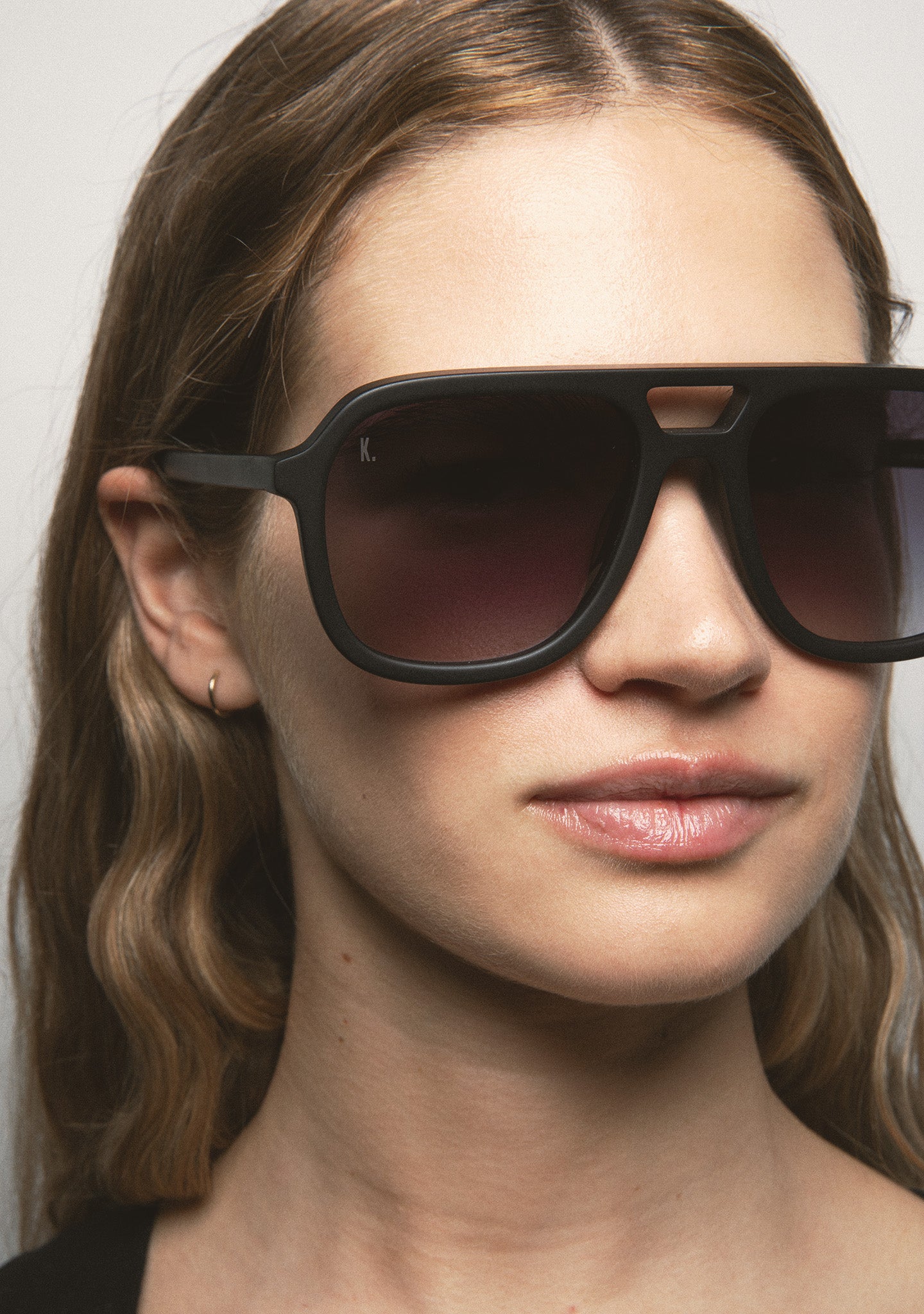 Square-shaped sunglasses with double bridge. Matte black acetate frame front and temples. Gradient black lenses, base 2, with 100% UV protection and anti-reflective treatment. Category 3 lenses. Built-in acetate nose pads. Handmade.
