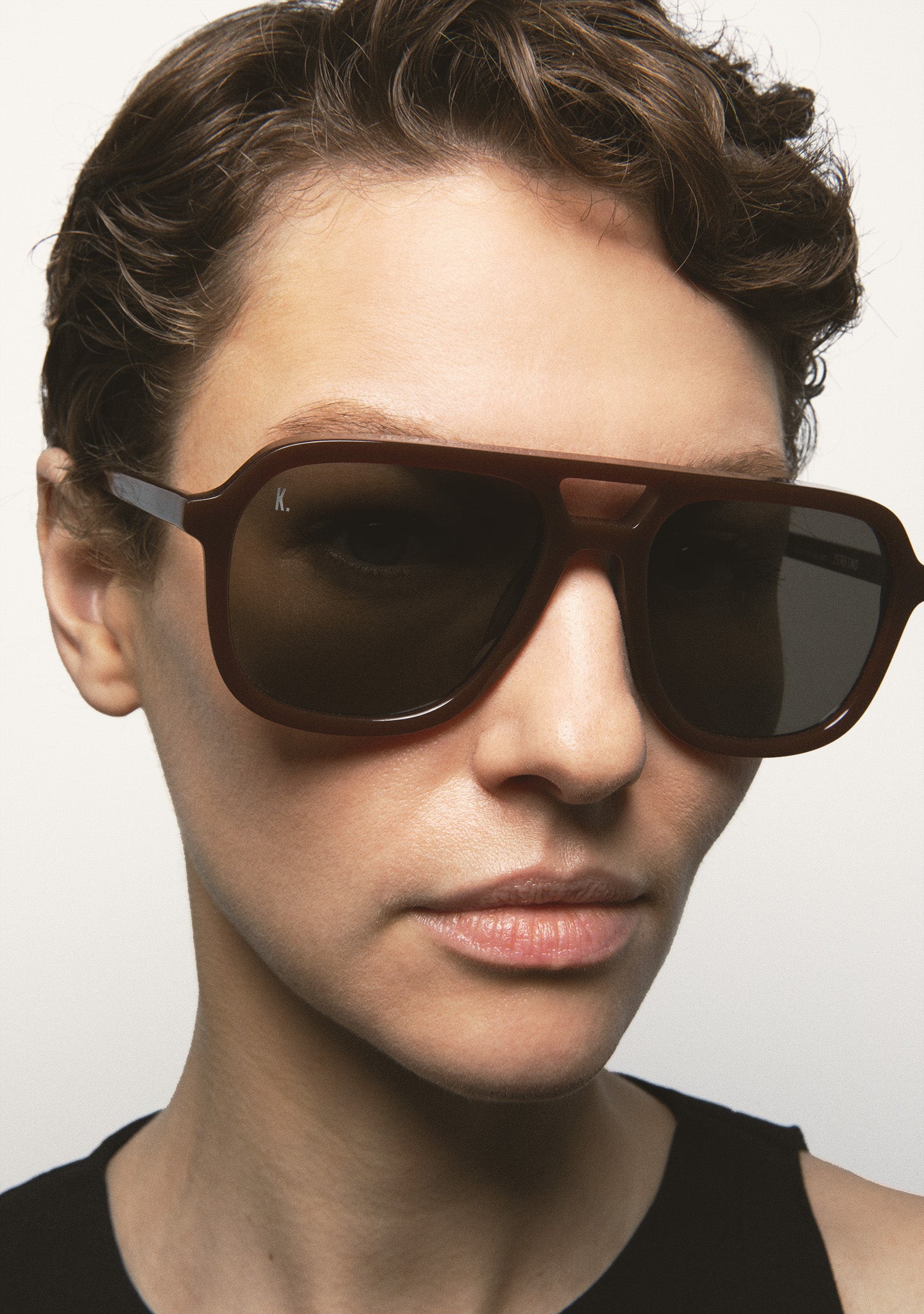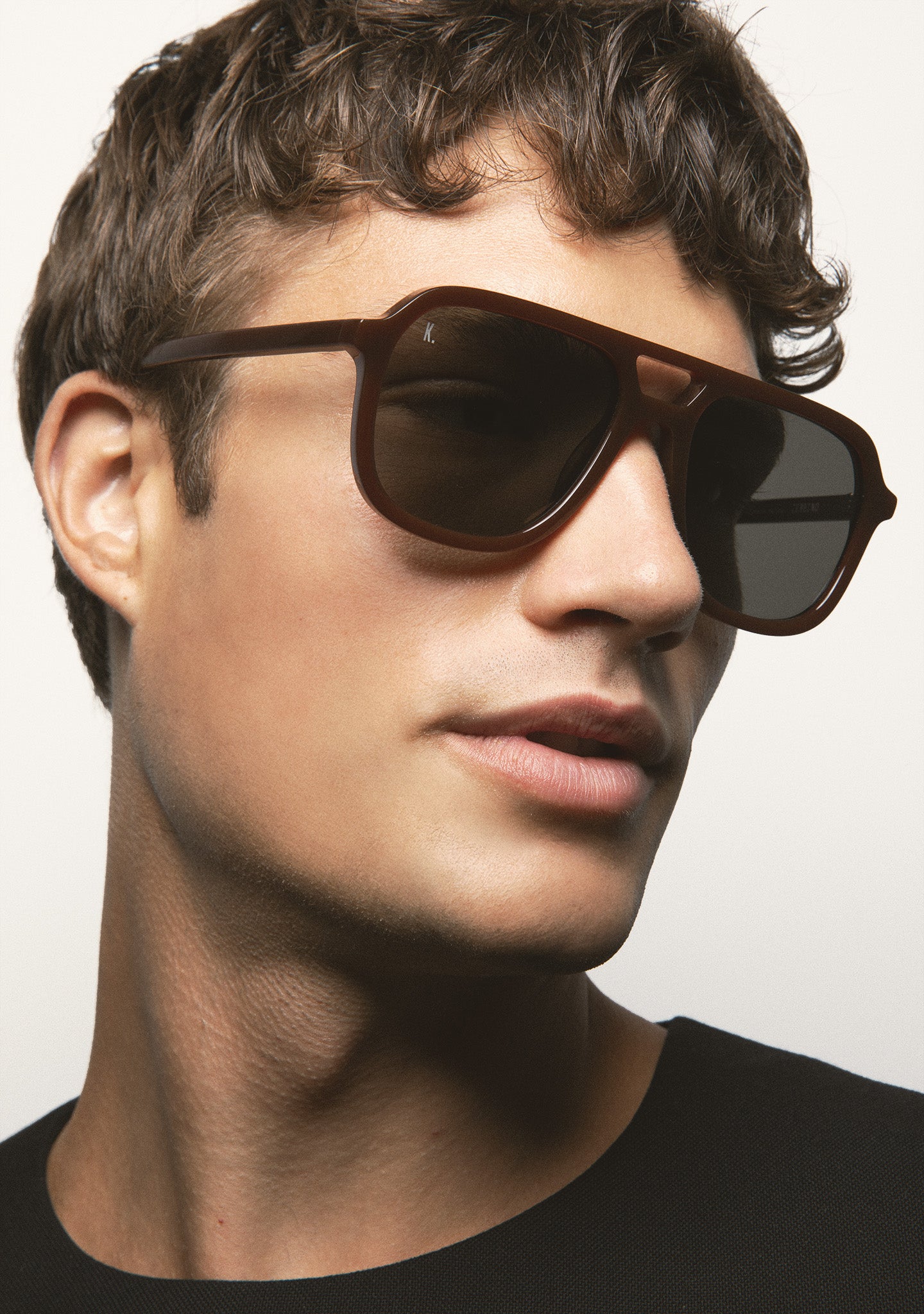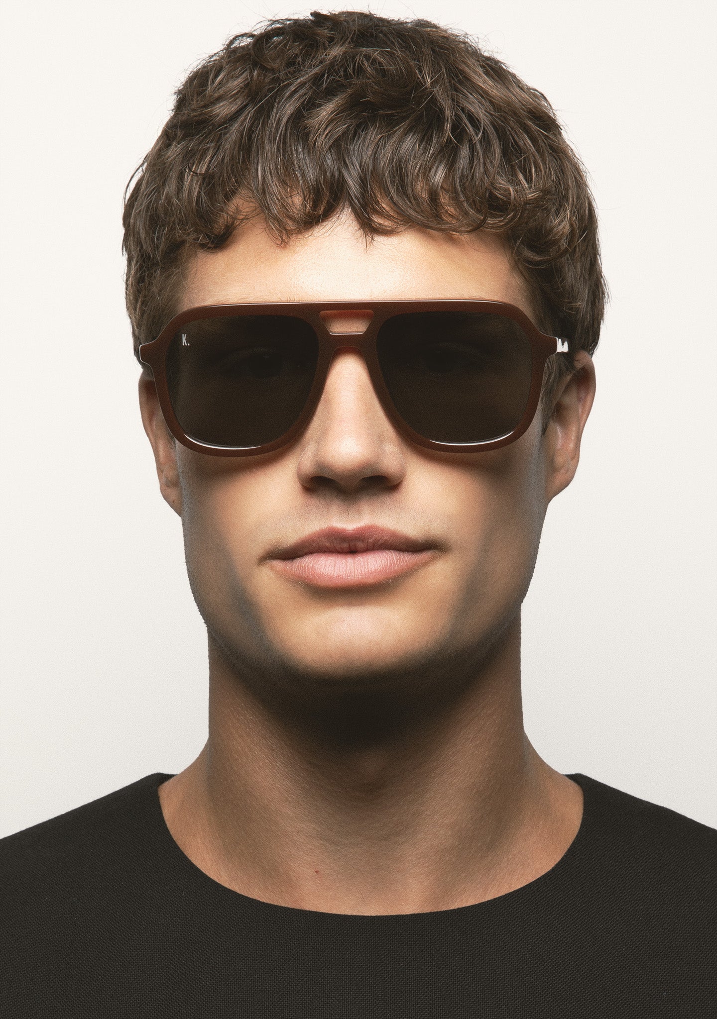 Square-shaped sunglasses with double bridge. Matte black acetate frame front and temples. Gradient black lenses, base 2, with 100% UV protection and anti-reflective treatment. Category 3 lenses. Built-in acetate nose pads. Handmade.