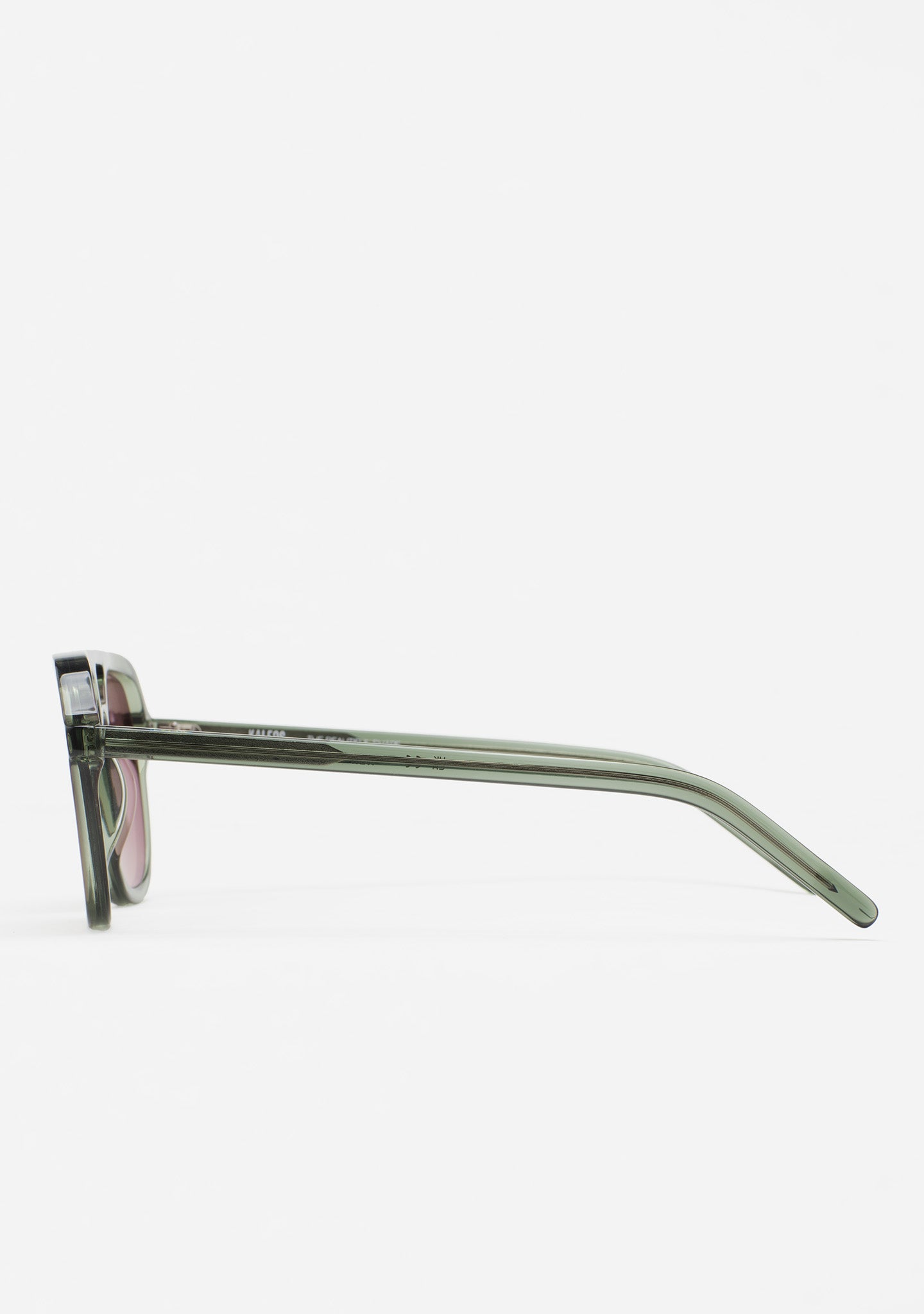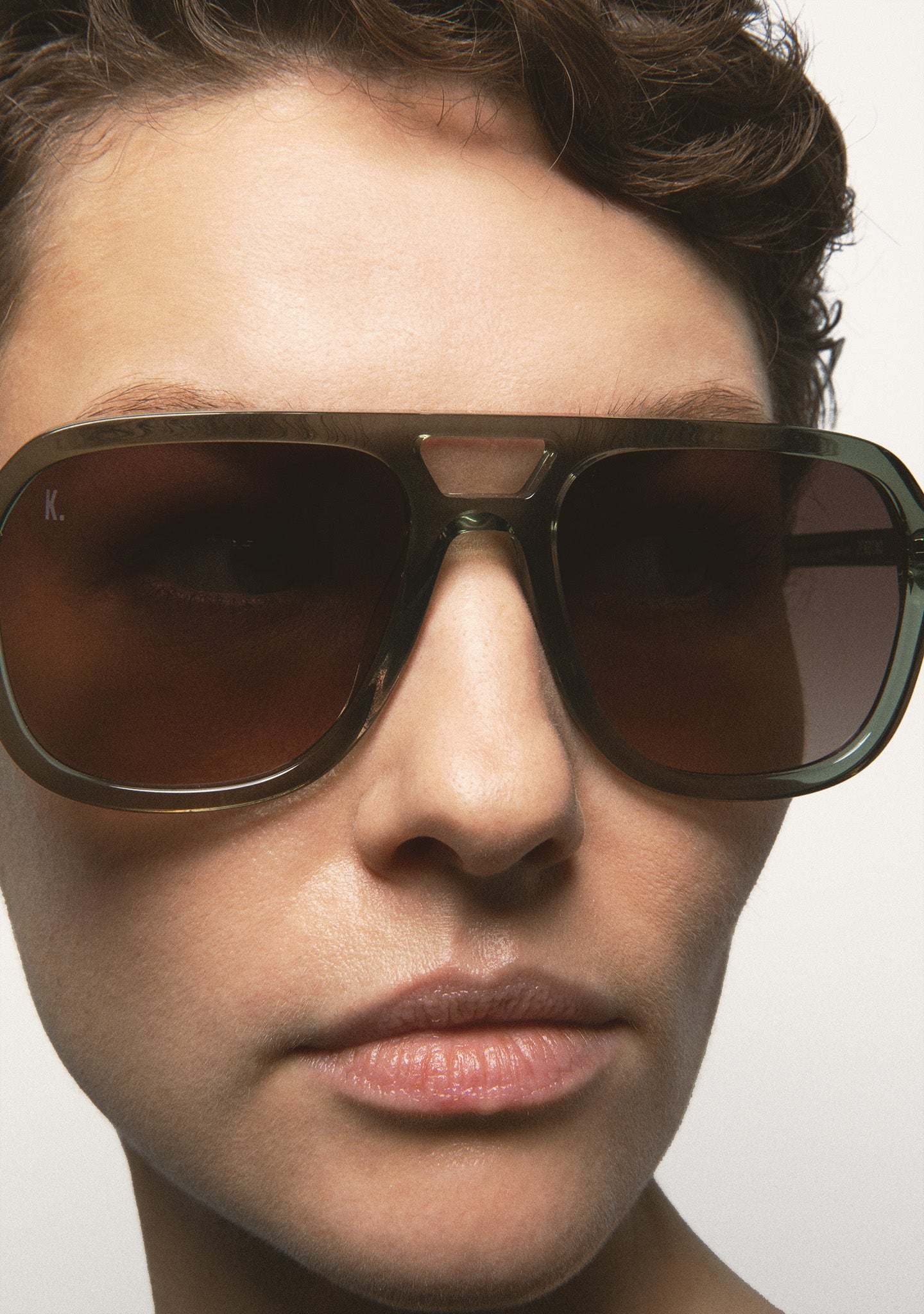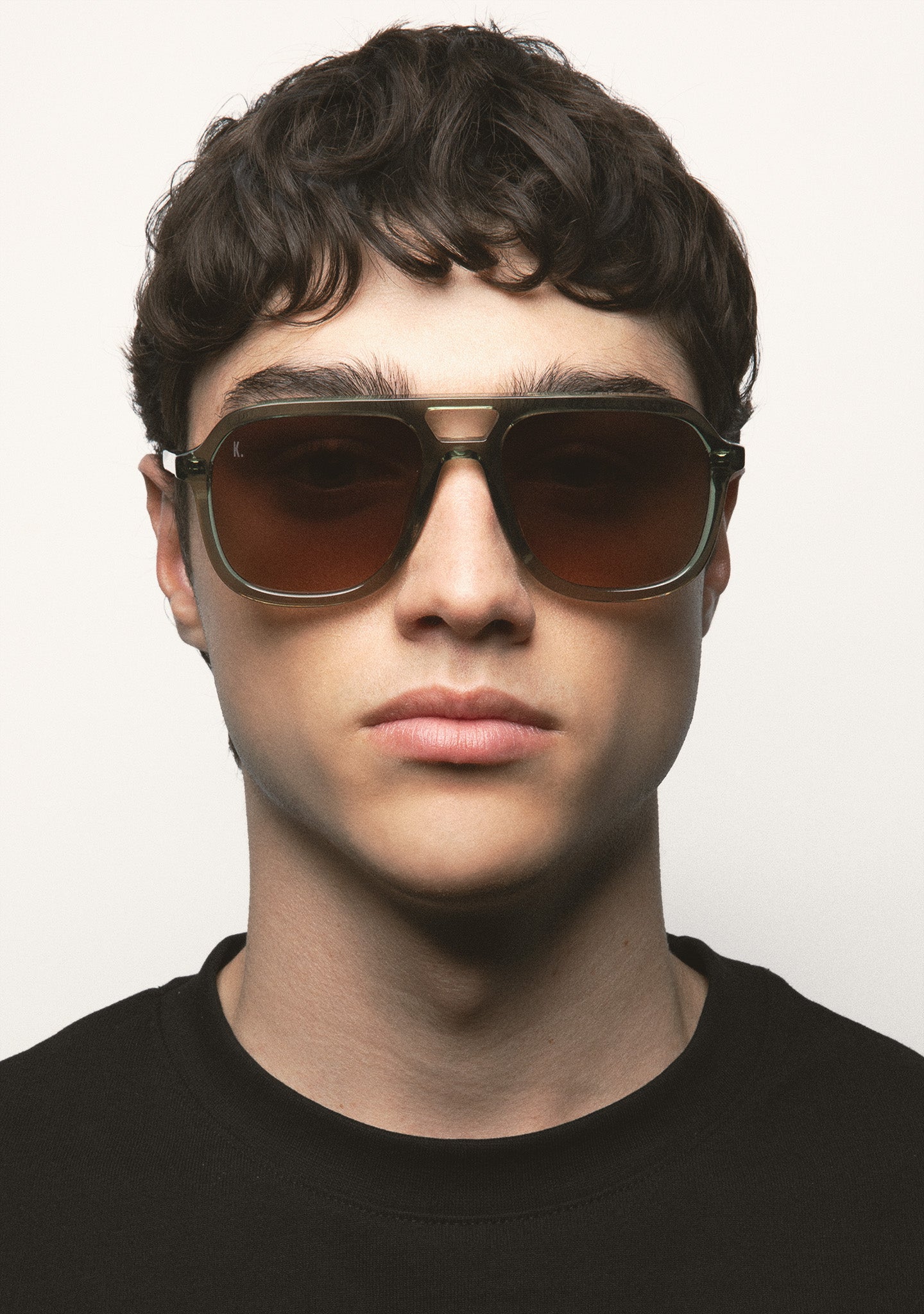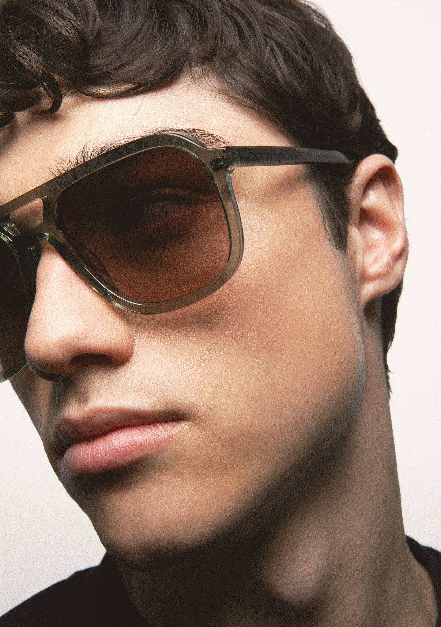 Square-shaped sunglasses with double bridge. Matte black acetate frame front and temples. Gradient black lenses, base 2, with 100% UV protection and anti-reflective treatment. Category 3 lenses. Built-in acetate nose pads. Handmade.