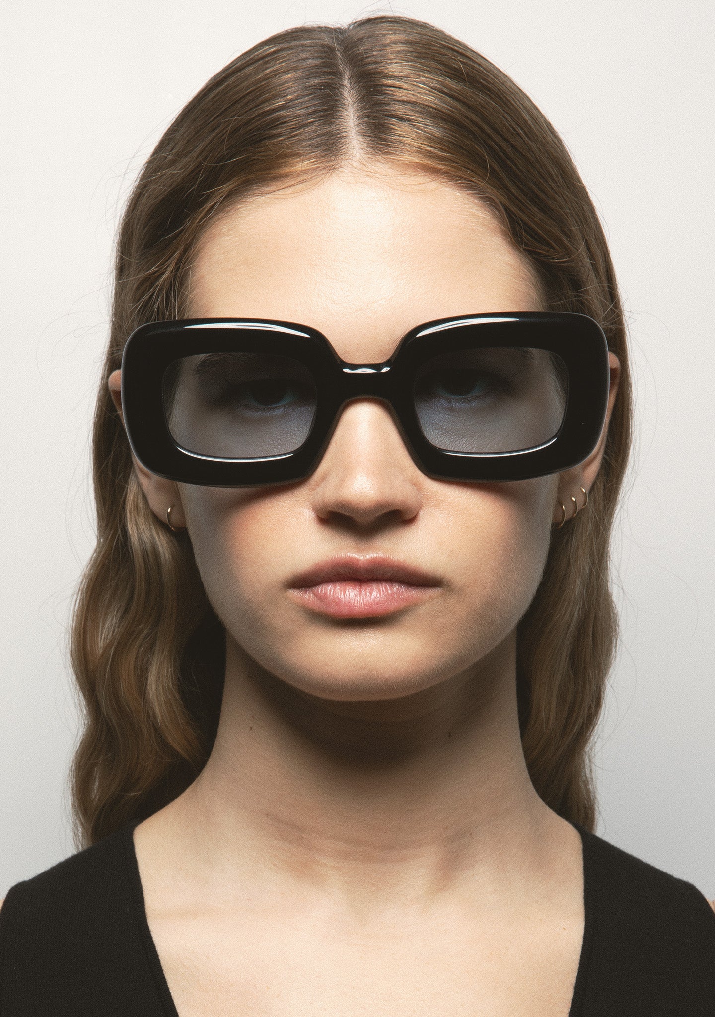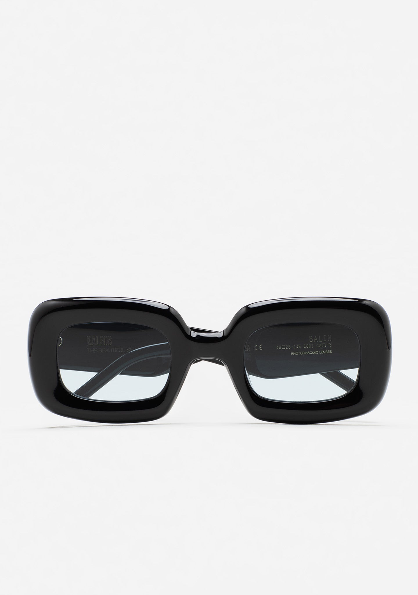 Rectangular-shaped sunglasses with milling throughout the front and temples for a voluminous effect. Black acetate front and temples. Blue photochromic lens, base 2, with UV protection and anti-reflective treatment. Category 1-3 lens. Integrated acetate nose pads. Handmade.