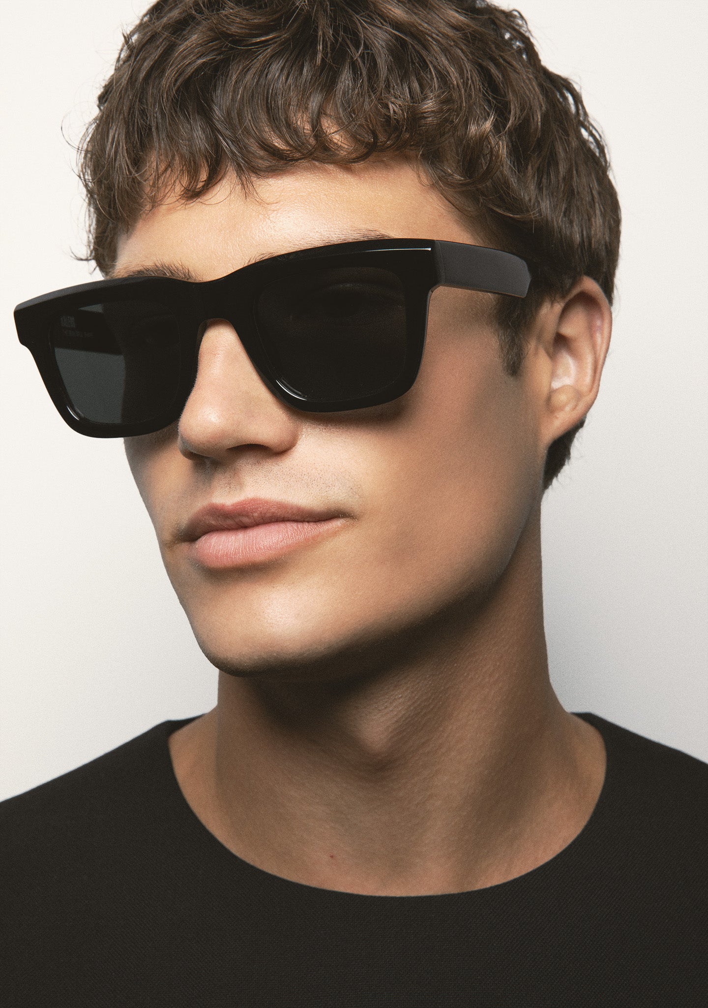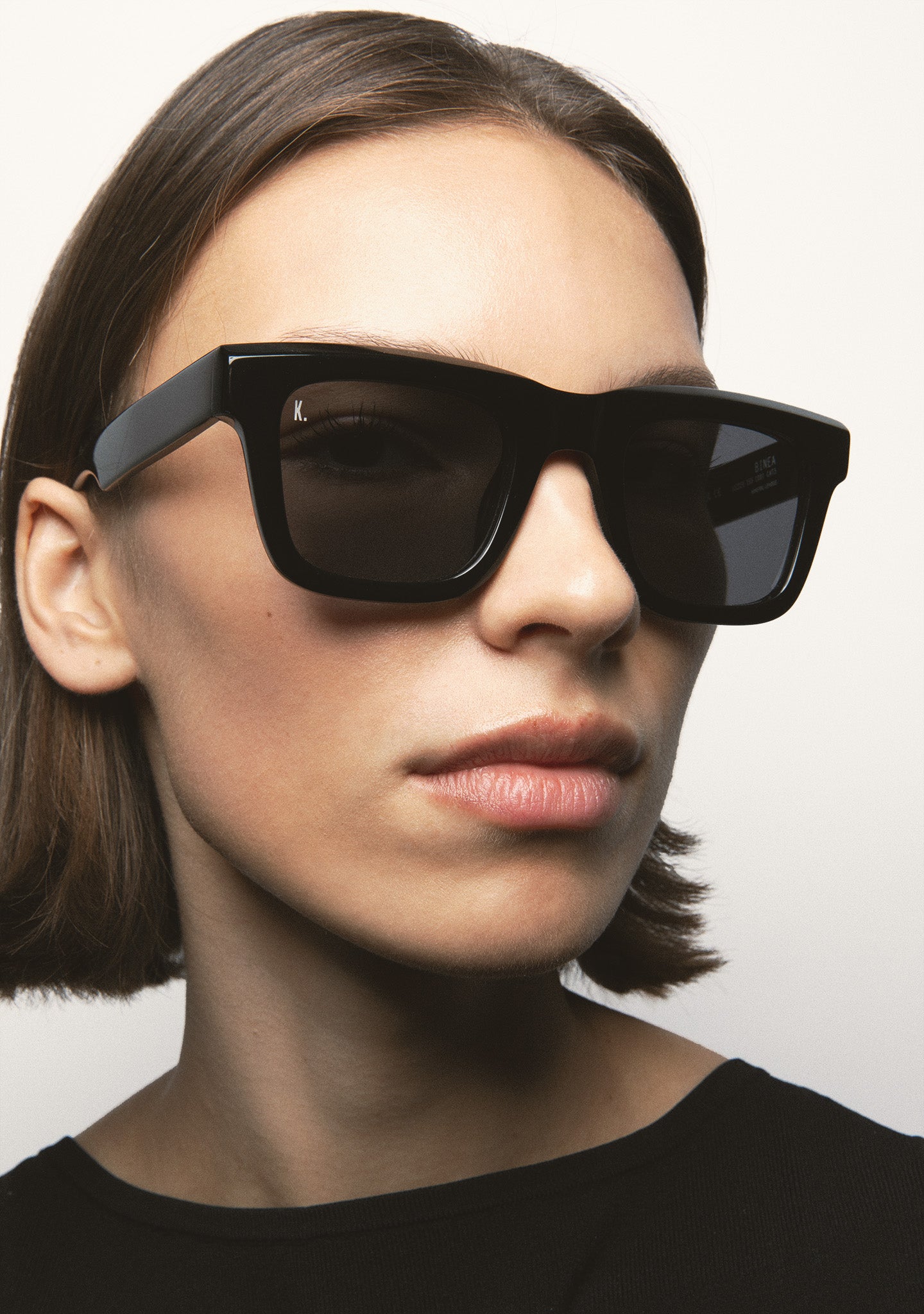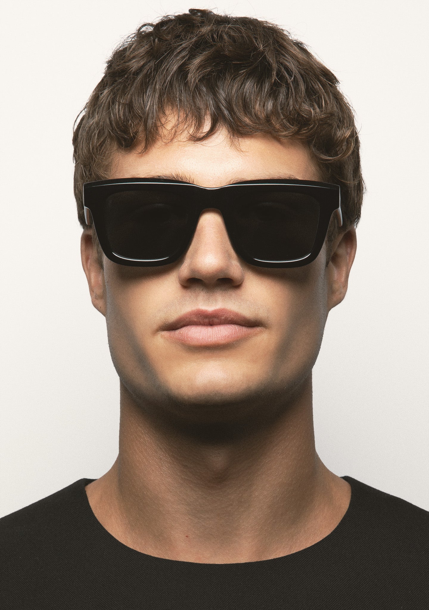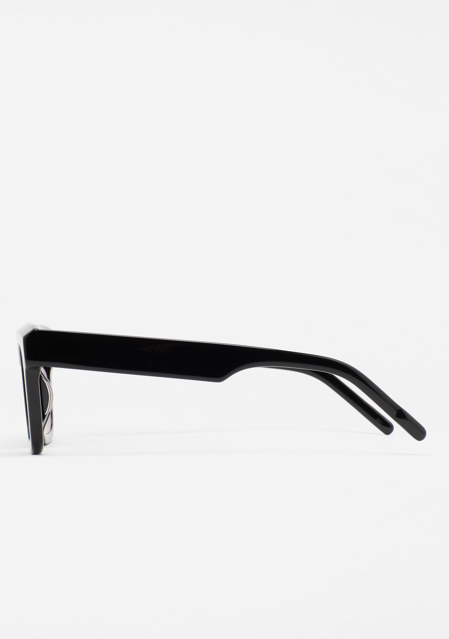 Square sunglasses with brow carving. Thick black acetate front with a carved upper section. Black acetate temples. Grey mineral lens (Barberini), base 2, with 100% UV protection and anti-reflective treatment. Category 3 lens. Integrated acetate nose pads. Handcrafted.
