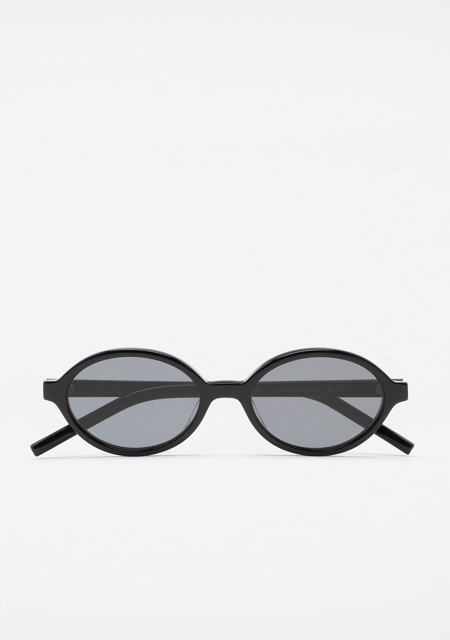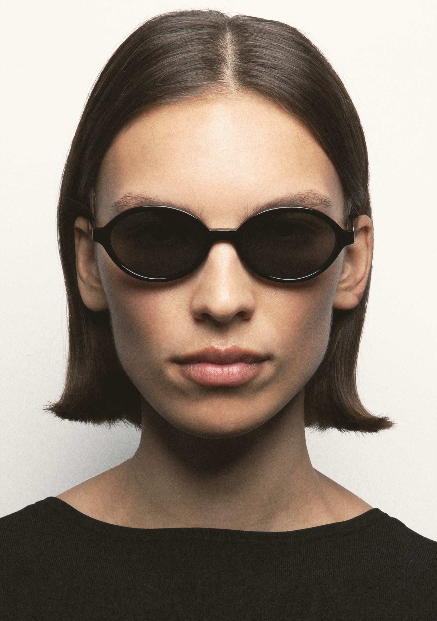 Oval-shaped sunglasses. Black acetate front and temples. Gray gradient lens, base 2, with 100% UV protection and anti-reflective treatment. Category 3 lens. Integrated acetate nose pads. Handmade.