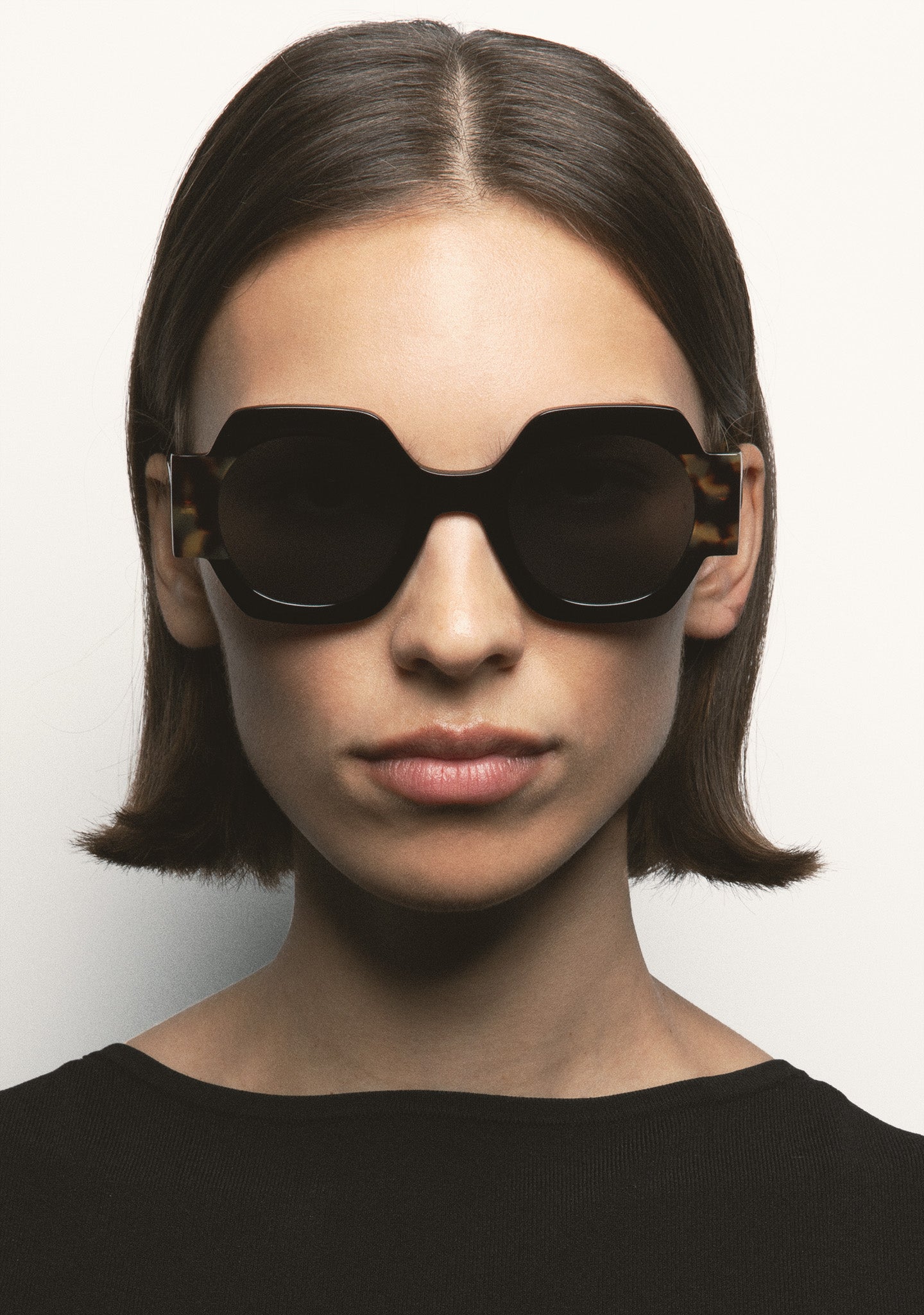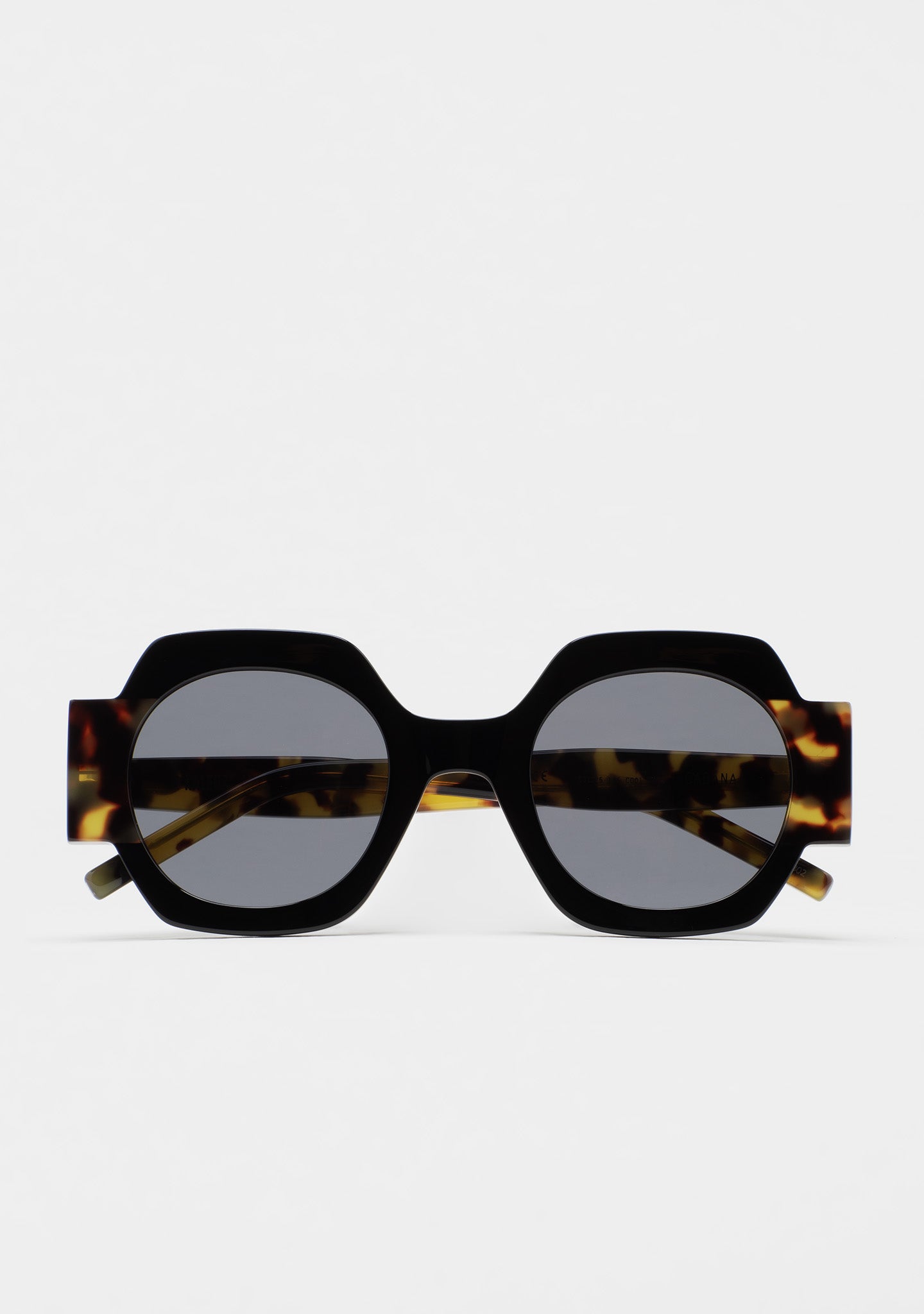 Square Sunglasses. Black acetate front with brown Havana laminate. Brown Havana acetate temples. Gray gradient lenses, base 2, with 100% UV protection and anti-reflective coating. Category 3 lenses. Integrated acetate nose pads. Handmade.