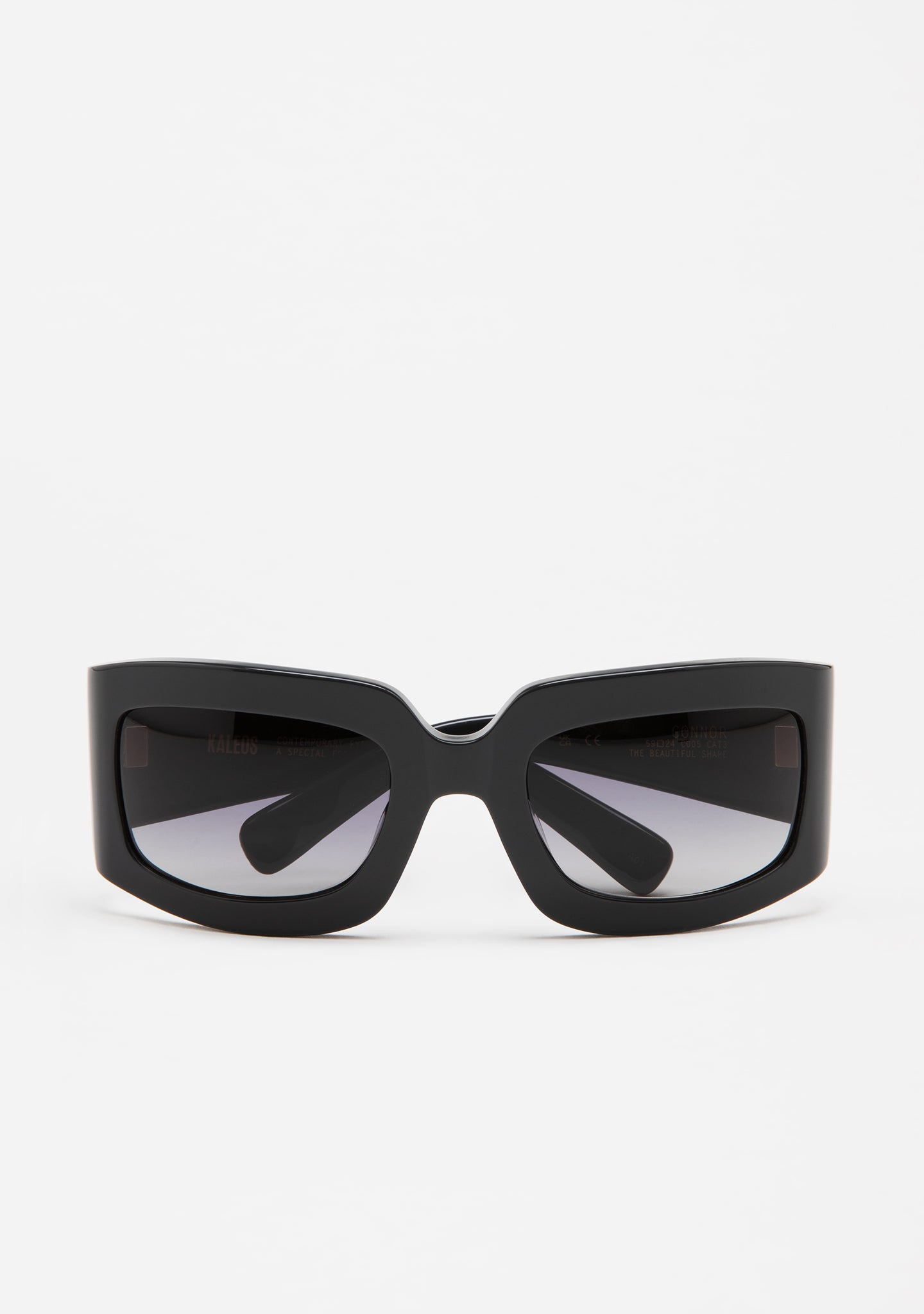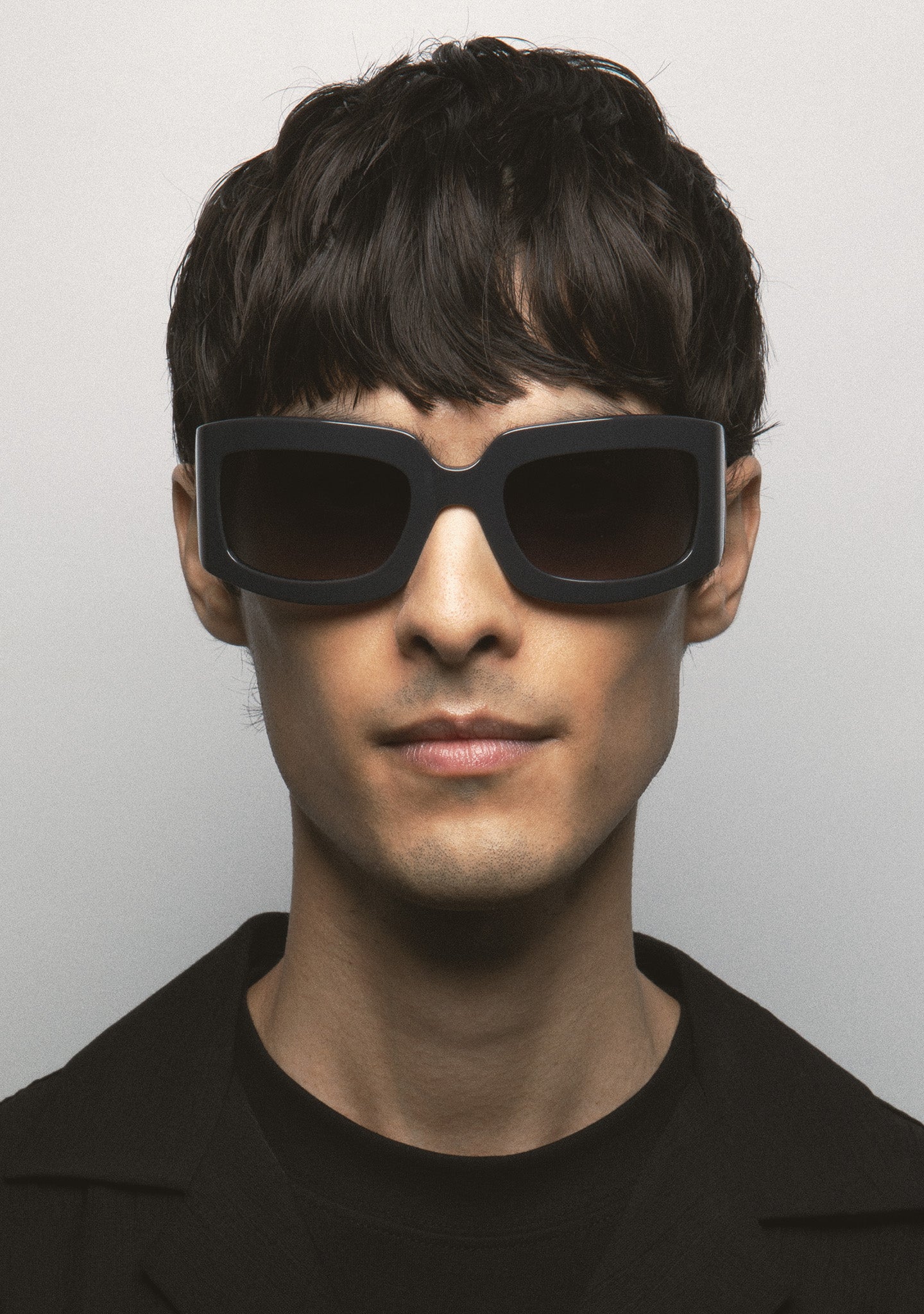 Rectangular wrap-around glasses. Acetate frame front and temples in dark grey. Black gradient tint 8-base lenses with 100% UV protection and anti-reflective treatment. Category 3 lenses. Built-in acetate nose pads. Handmade.