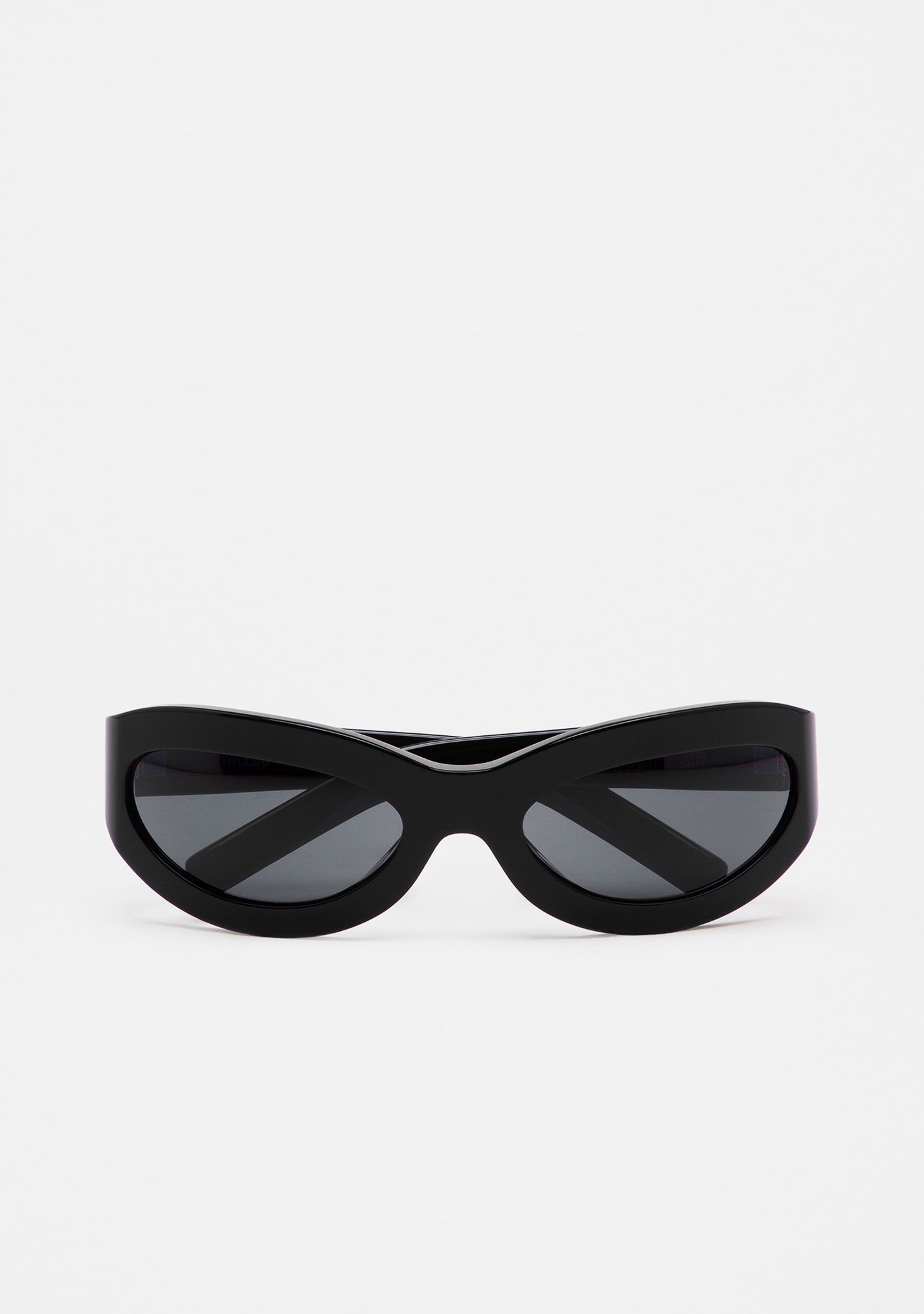 Oval wrap-around glasses. Black acetate frame front and temples. Black gradient tint 8-base lenses with 100% UV protection and anti-reflective treatment. Category 3 lenses. Built-in acetate nose pads. Handmade.