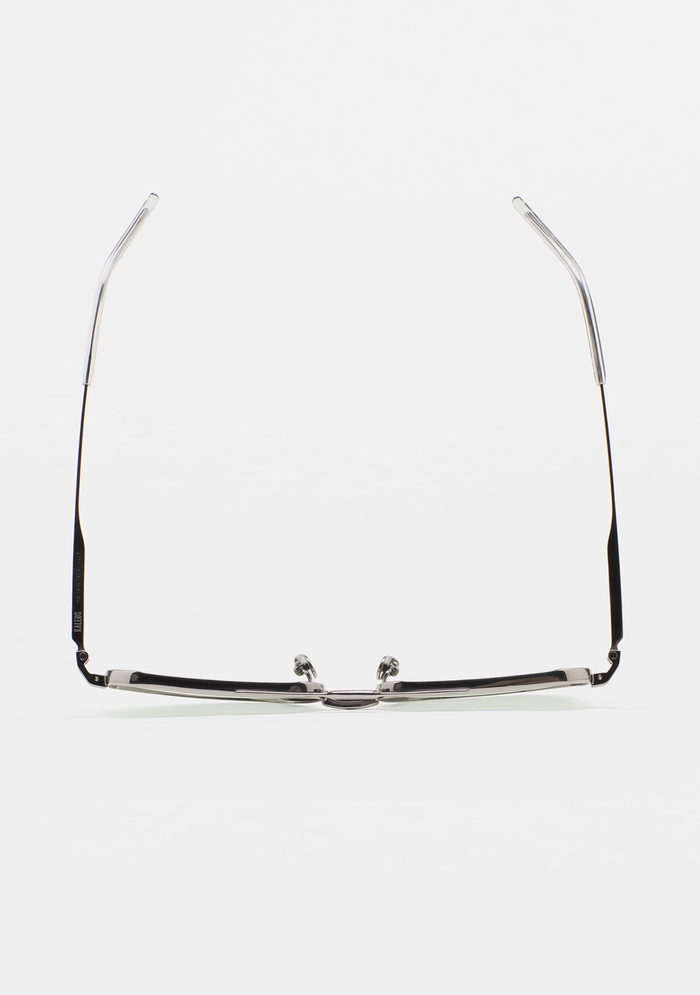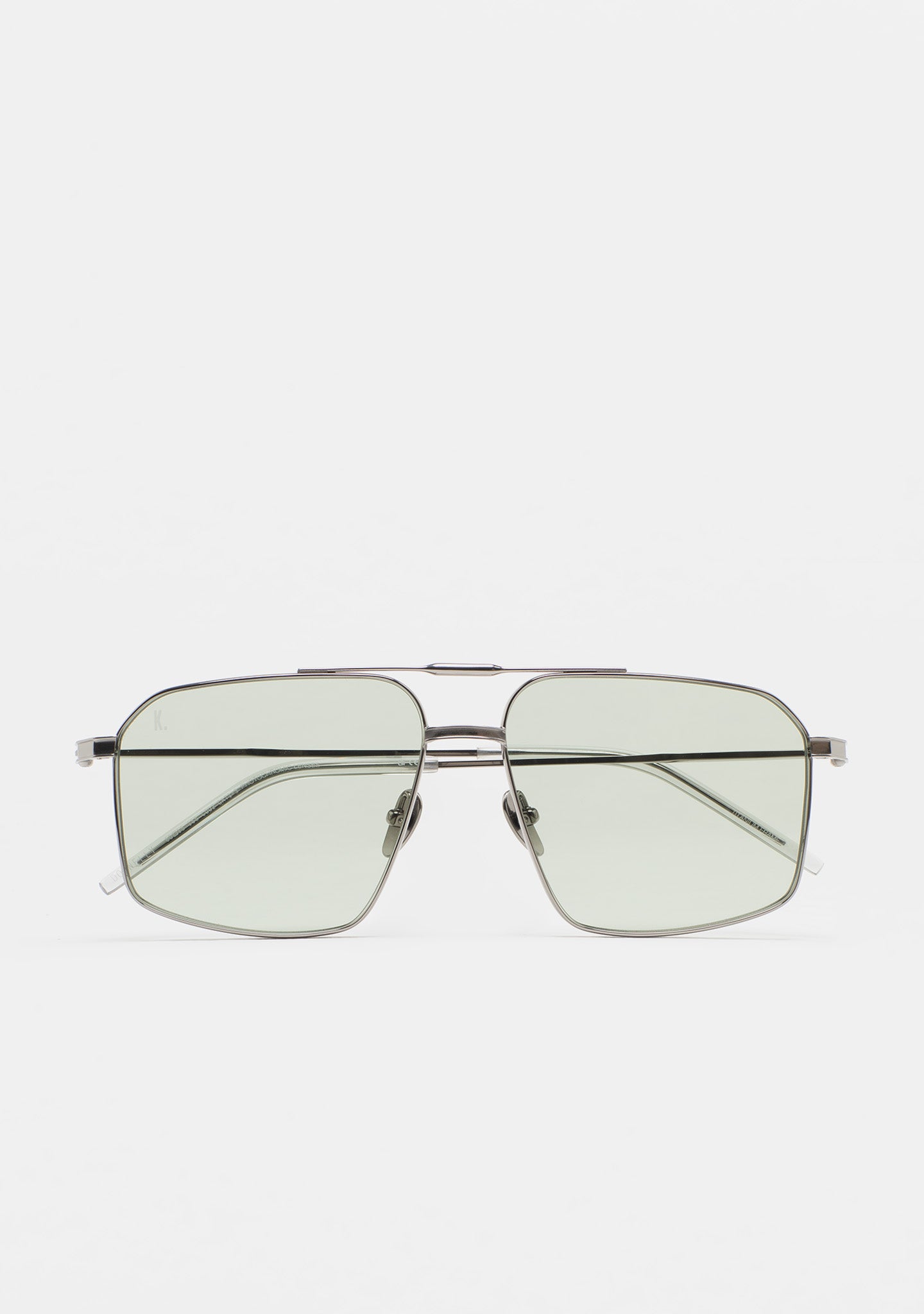 Square sunglasses with double bridge. Silver titanium front and temples. Temples end in transparent gray acetate tips. Green photochromic lenses, base 2, with 100% UV protection and anti-reflective coating. Category 1 3 lenses. Integrated nose pads. Handmade.