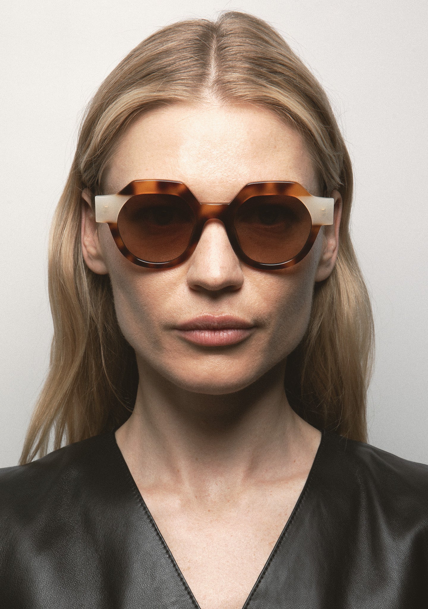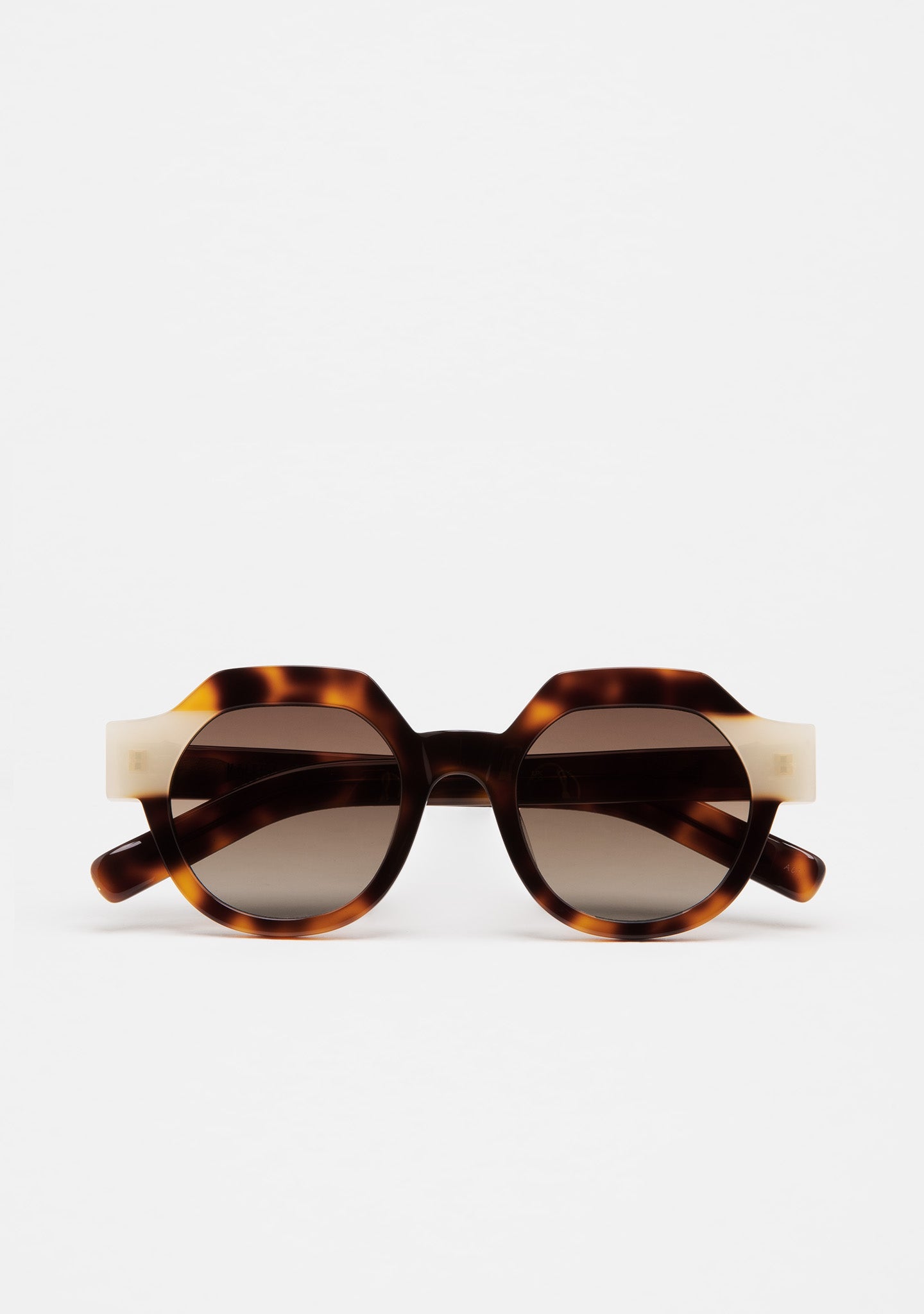 Rounded sunglasses with a design highlighted by the prominent end piece in a different colour to the front of the glasses. Acetate frame front in brown tortoiseshell with laminate in translucent ivory. Acetate temples in brown tortoiseshell. Dark amber gradient 2-base lenses. Category 2 lenses. Built-in acetate nose pads. Handmade.