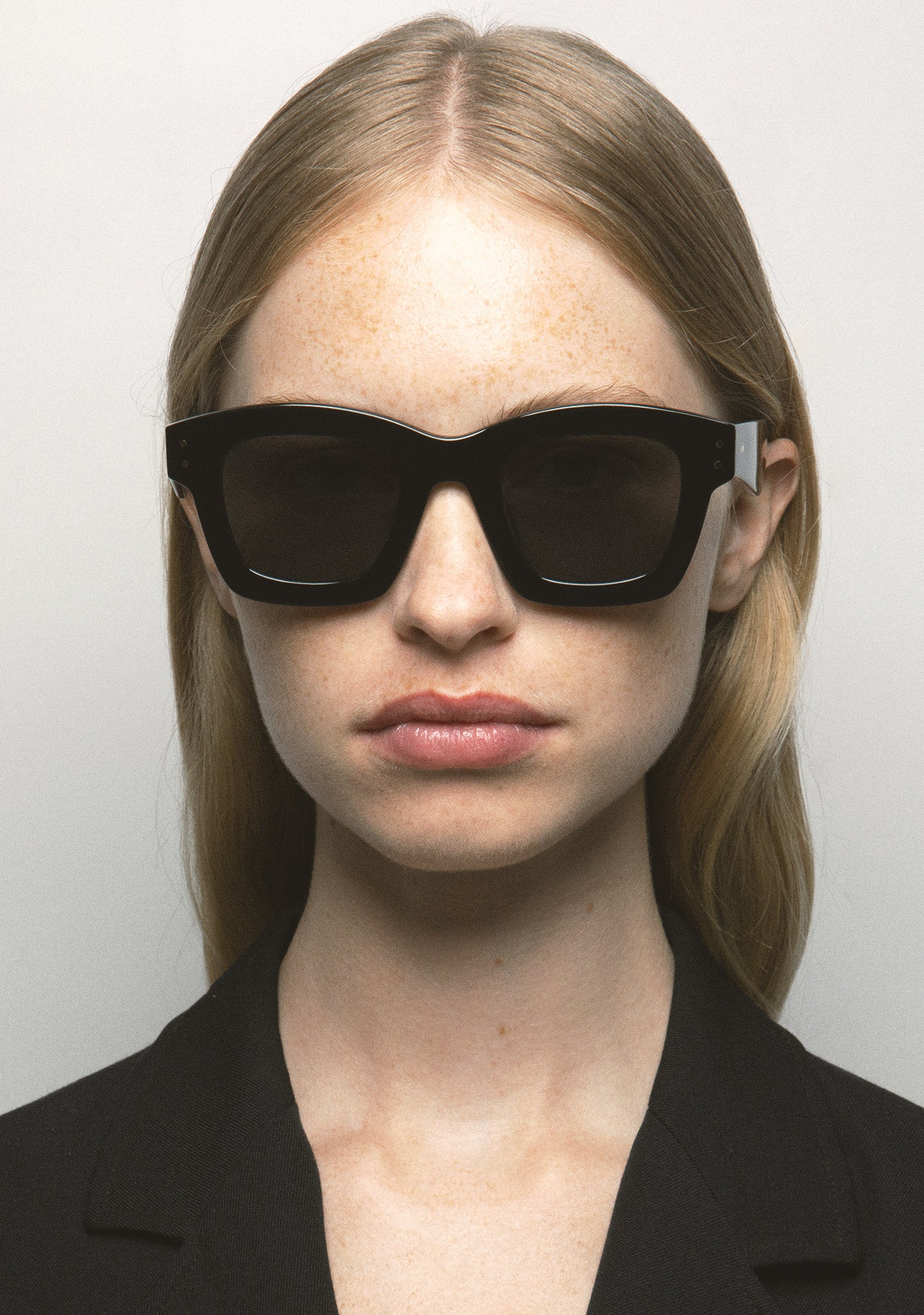 Square-shaped sunglasses. Black acetate front and temples. Gold rivet hinges on the corners and temples. Gray 2-base lens with 100% UV protection and anti-reflective treatment. Category 3 lenses. Built-in acetate nose pads. Handmade.