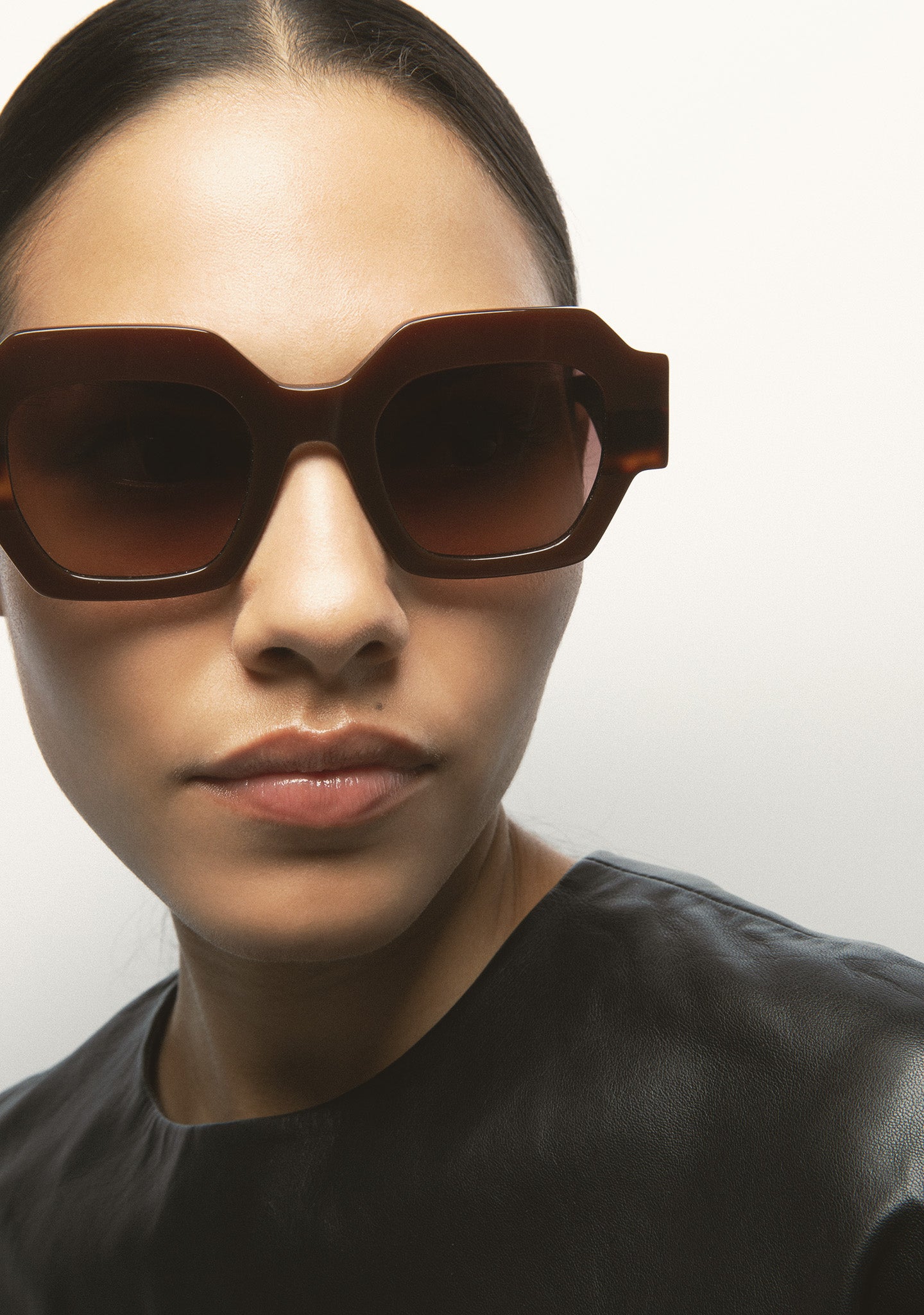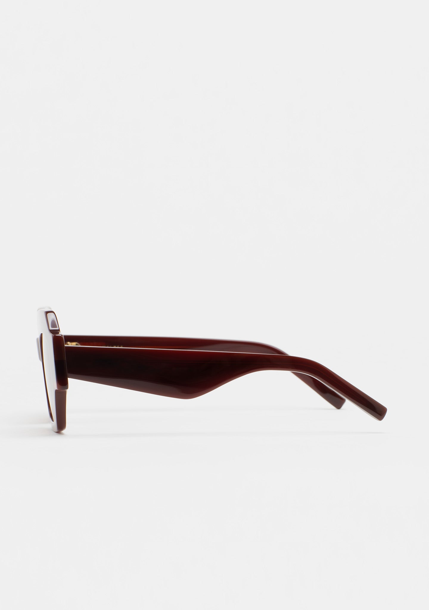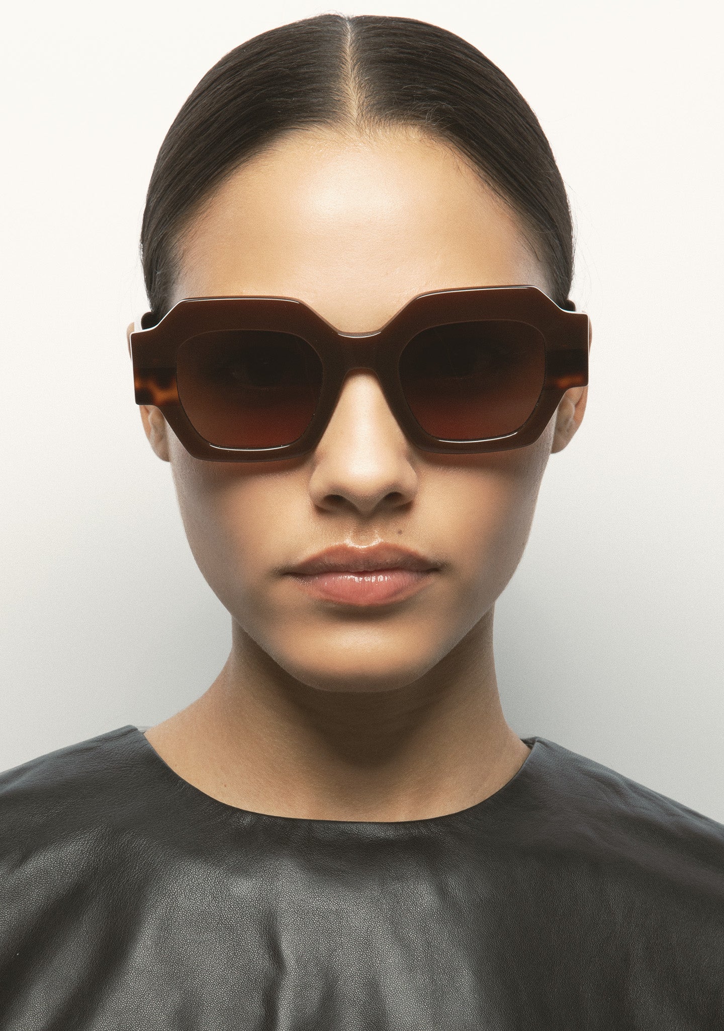 Square Sunglasses. Translucent brown acetate front with dark brown Havana laminate. Translucent brown acetate temples. Brown gradient lenses, base 2, with 100% UV protection and anti-reflective coating. Category 3 lenses. Integrated acetate nose pads. Handmade.