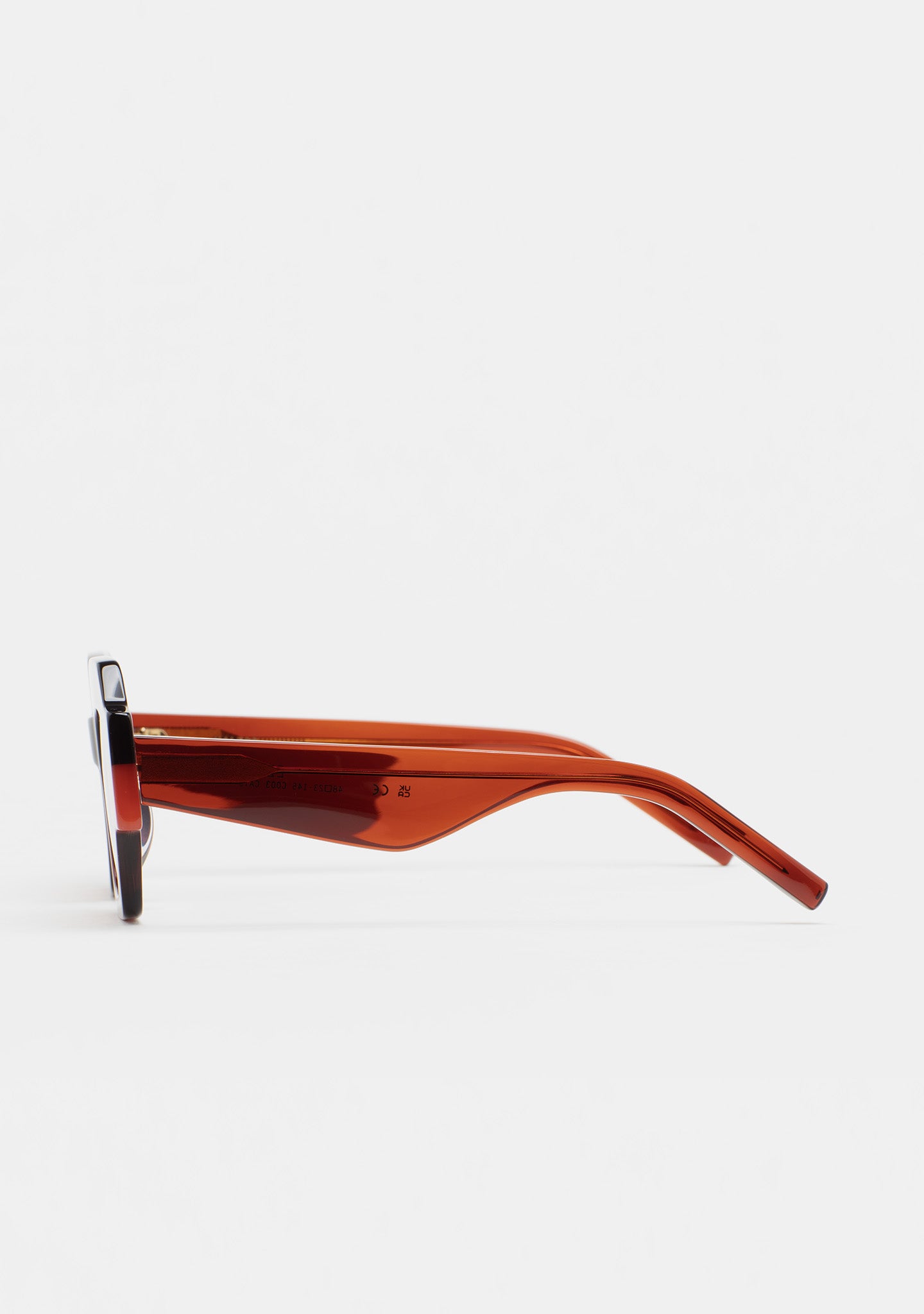 Square Sunglasses. Translucent brown acetate front with dark brown Havana laminate. Translucent brown acetate temples. Brown gradient lenses, base 2, with 100% UV protection and anti-reflective coating. Category 3 lenses. Integrated acetate nose pads. Handmade.