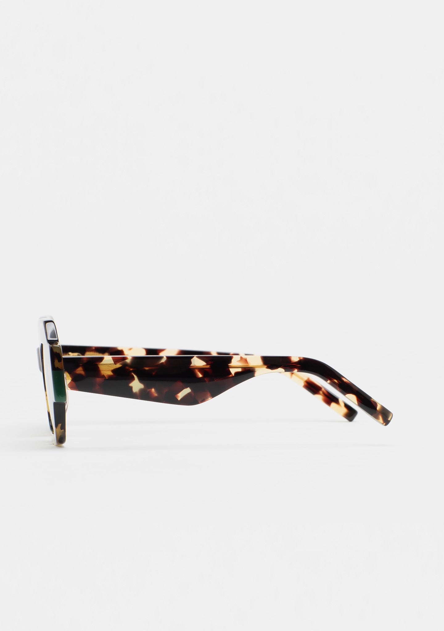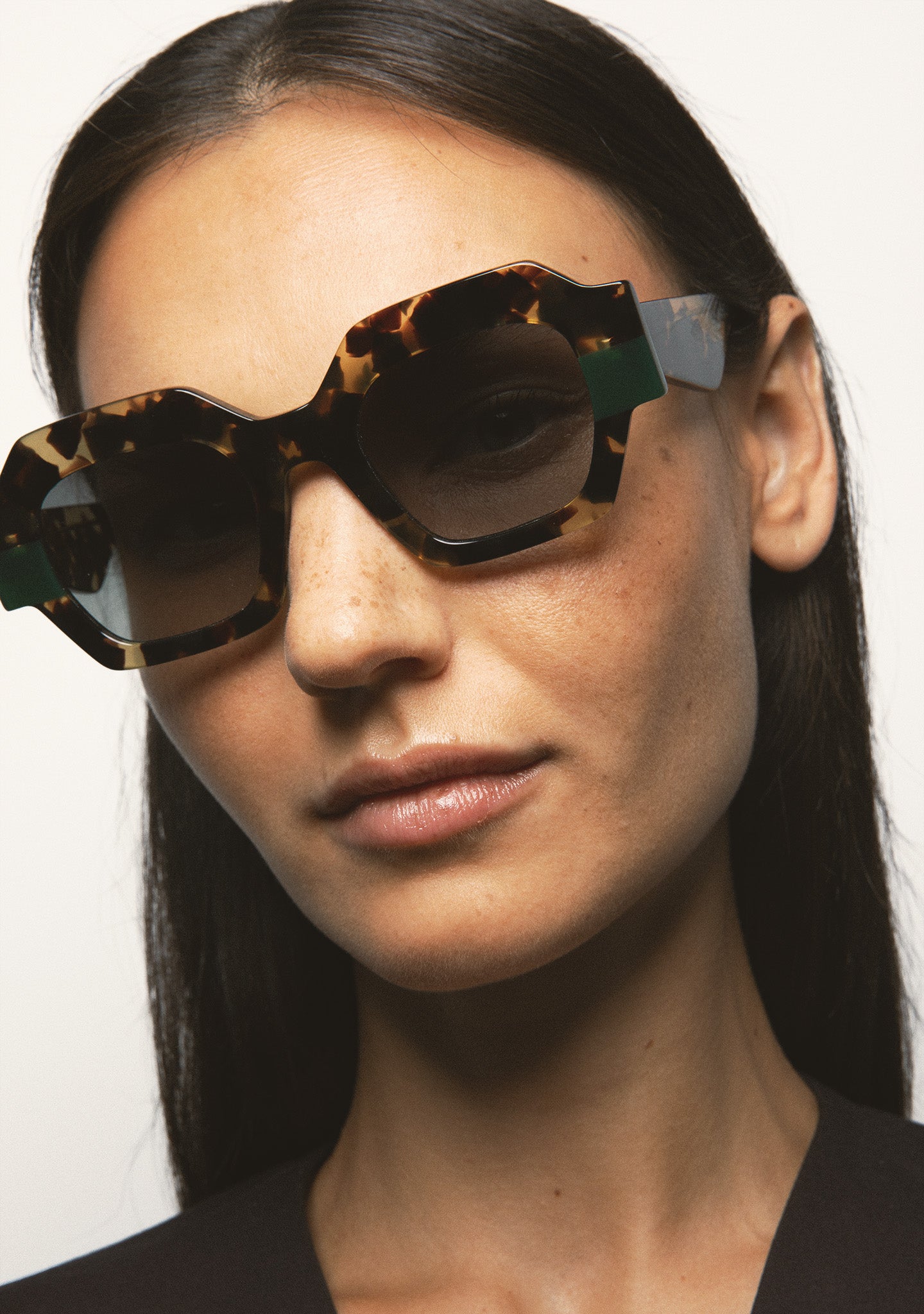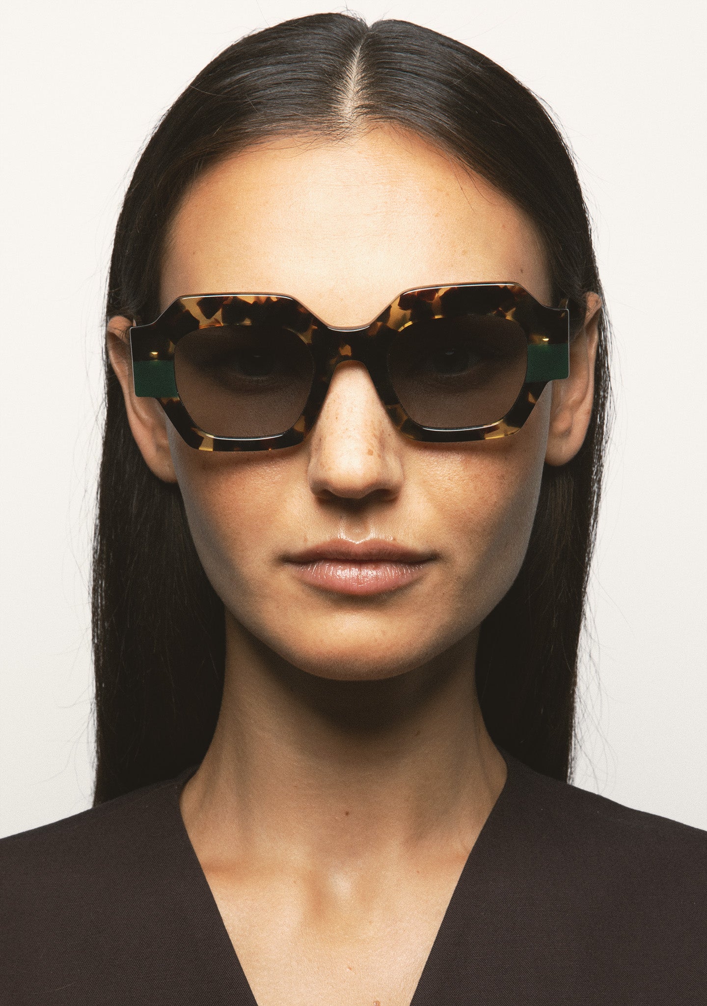 Square Sunglasses. Translucent brown acetate front with dark brown Havana laminate. Translucent brown acetate temples. Brown gradient lenses, base 2, with 100% UV protection and anti-reflective coating. Category 3 lenses. Integrated acetate nose pads. Handmade.