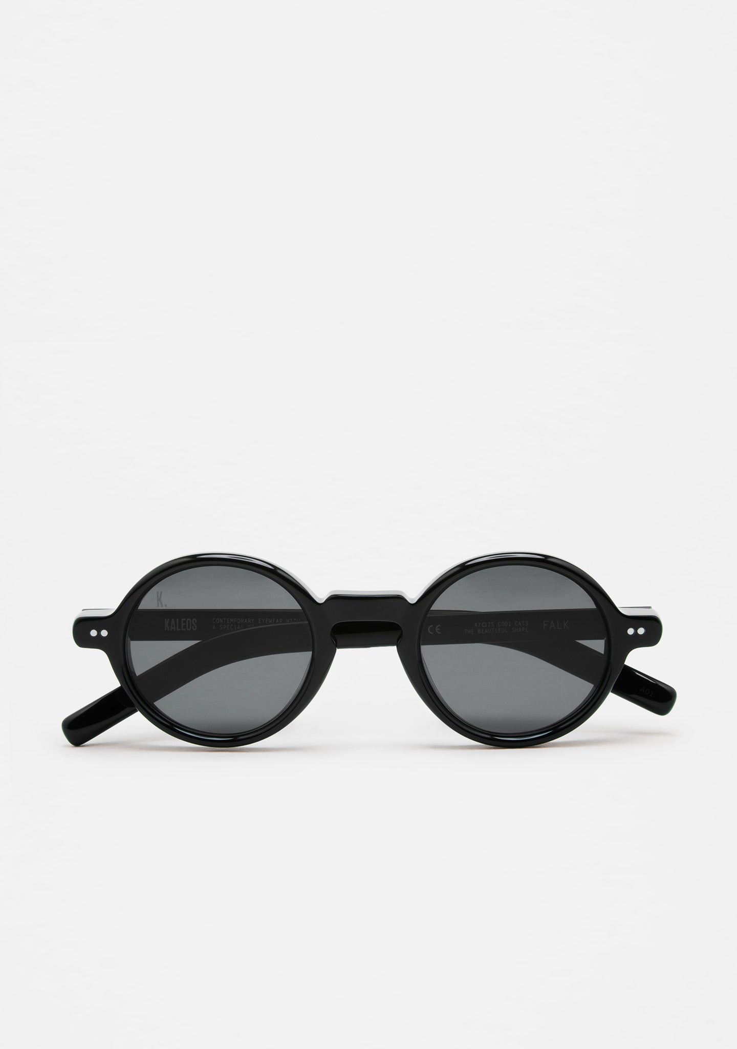 Round sunglasses with distinctive spoilers on the sides. Black acetate frame front and temples. Hinges with silver rivets on end elbow pieces and temples. Black base 2 lenses with 100% UV protection and anti-reflective treatment. Category 3 lenses. Built-in acetate nose pads. Handmade.