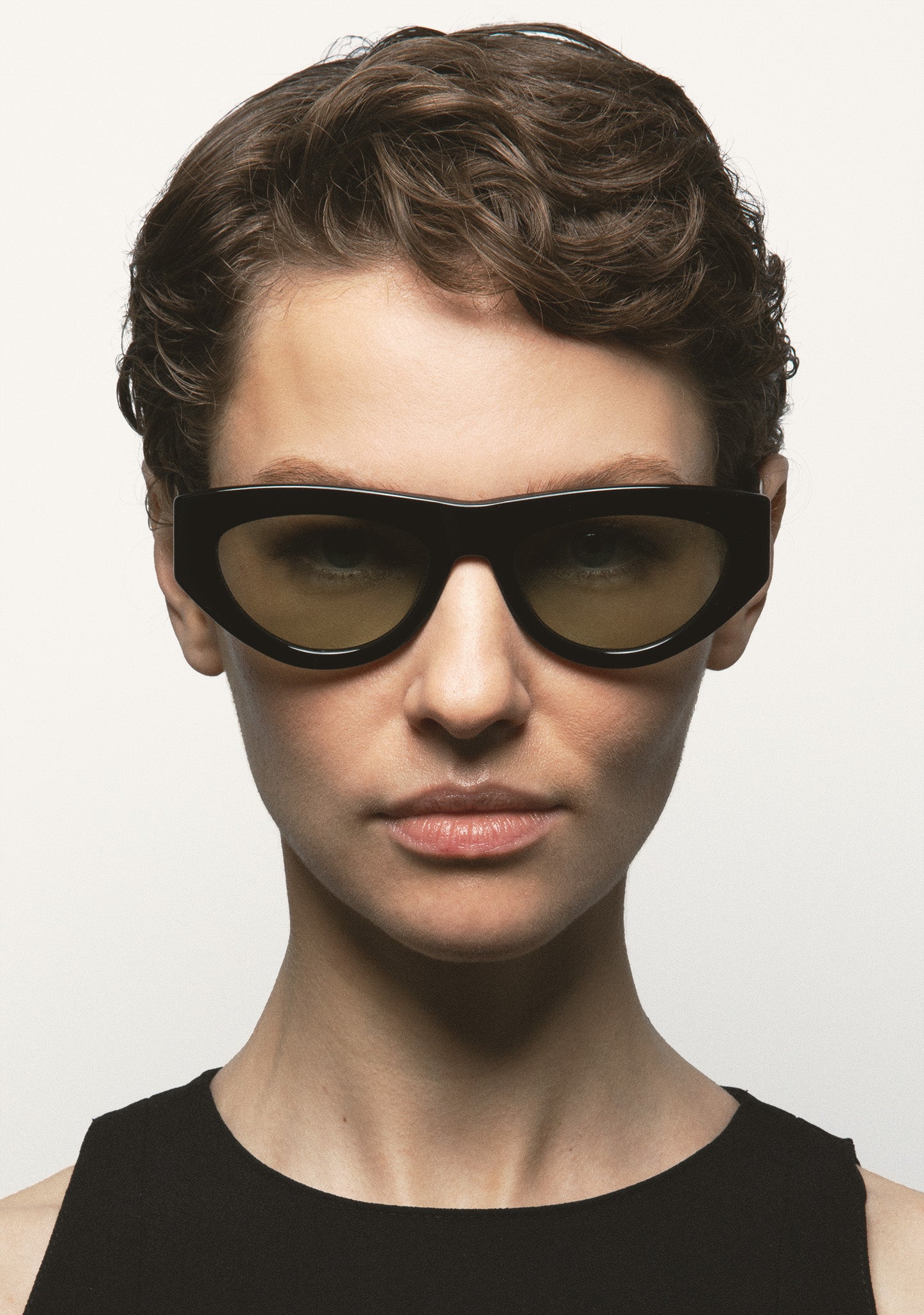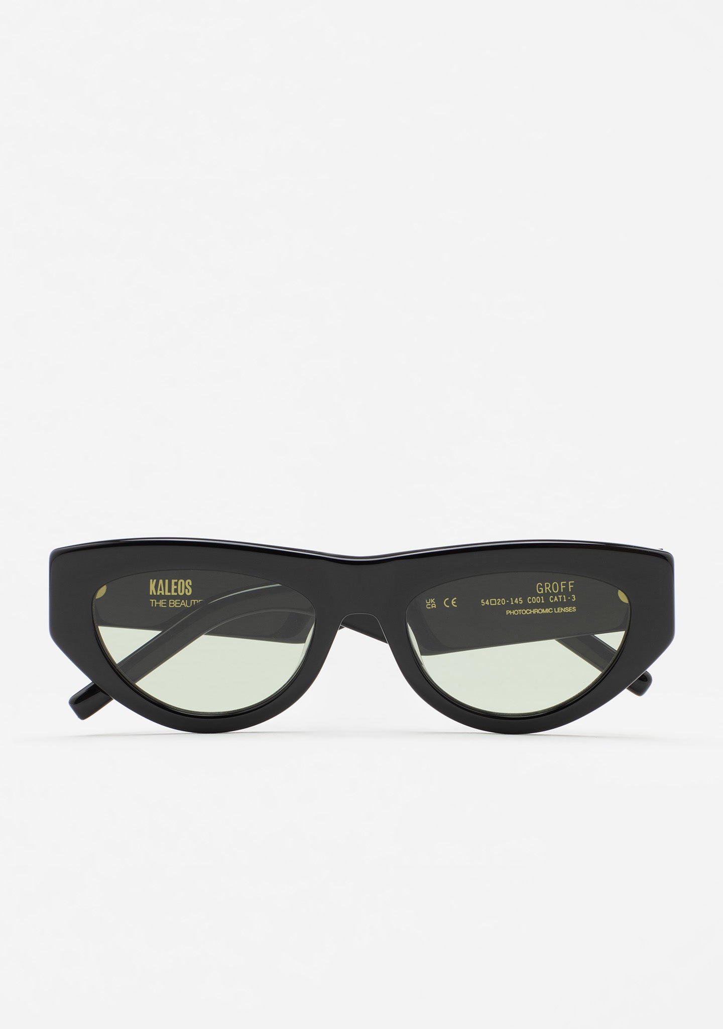Cat-eye-shaped sunglasses. Black acetate front and temples. Curved temple-end. Green photochromic lens, base 2, with UV protection and anti-reflective treatment. Category 1-3 lens. Integrated acetate nose pads. Handmade.