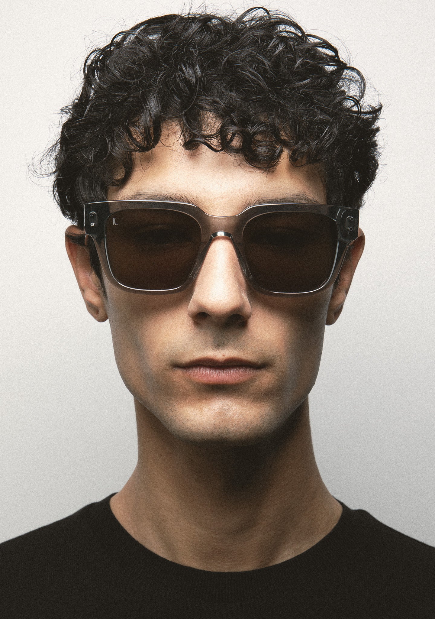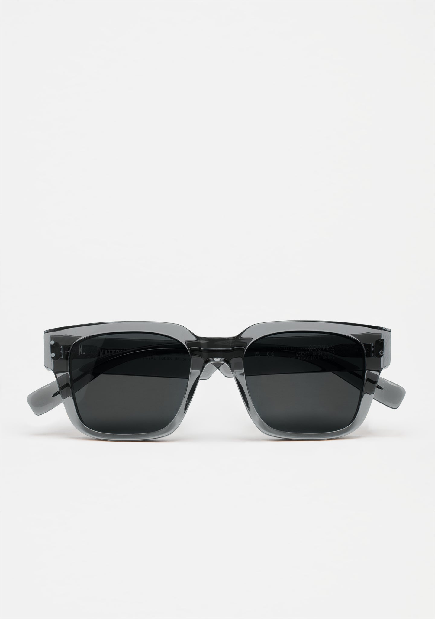 Square sunglasses. Thick acetate frame front in transparent grey. Acetate temples in transparent grey. Hinges with silver rivets on end elbow pieces and temples. Grey gradient tint 2-base lenses with 100% UV protection and anti-reflective treatment. Category 3 lenses. Built-in acetate nose pads. Handmade.