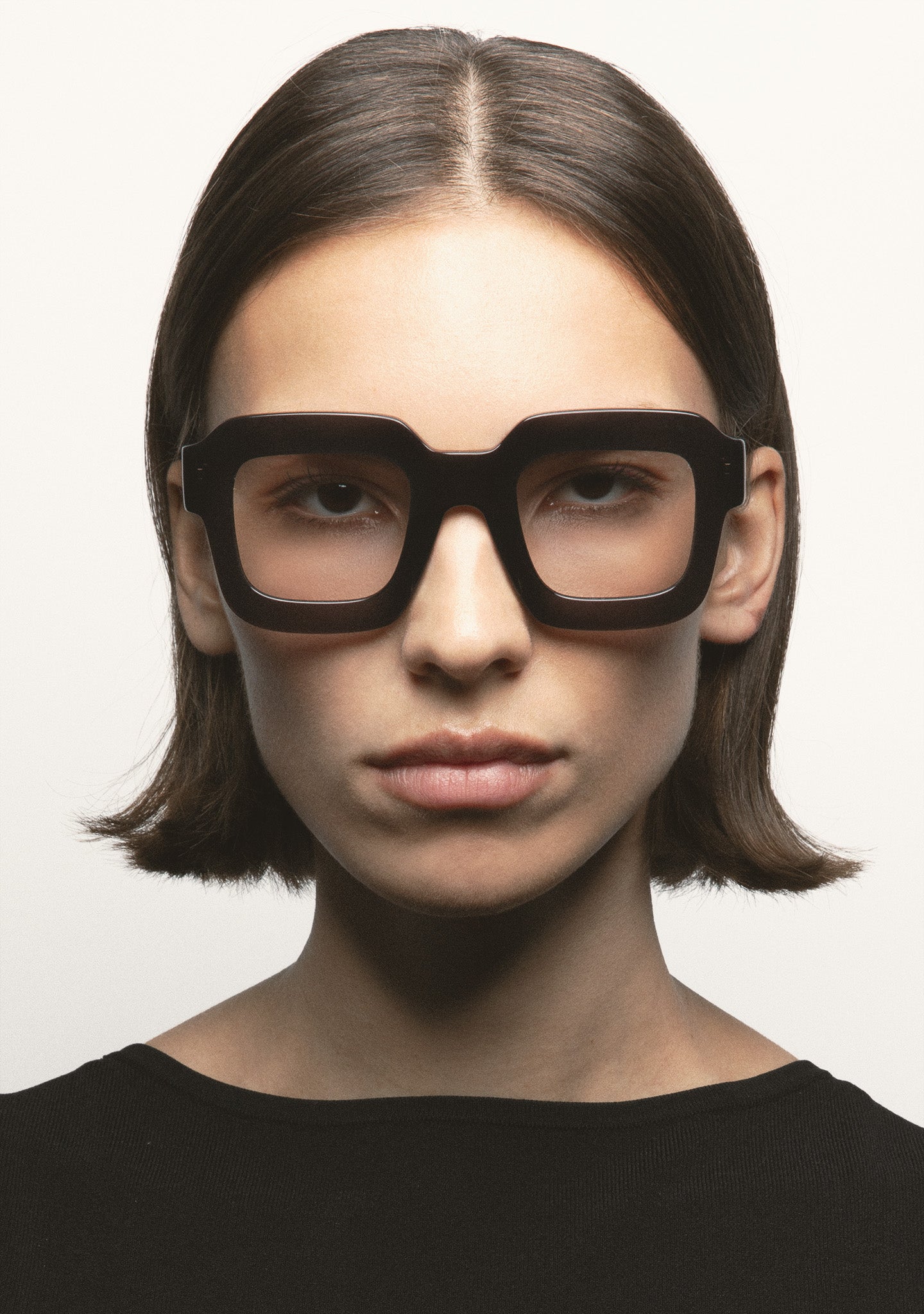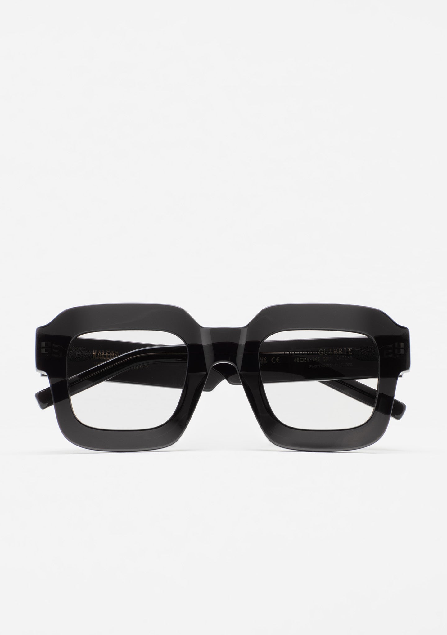 Square-shaped sunglasses. Front and temples of transparent dark gray acetate. Photocromic gray lens, base 2, with UV protection and anti-reflective coating. Lens Category 1-3. Acetate nose pads incorporated. Handmade.
