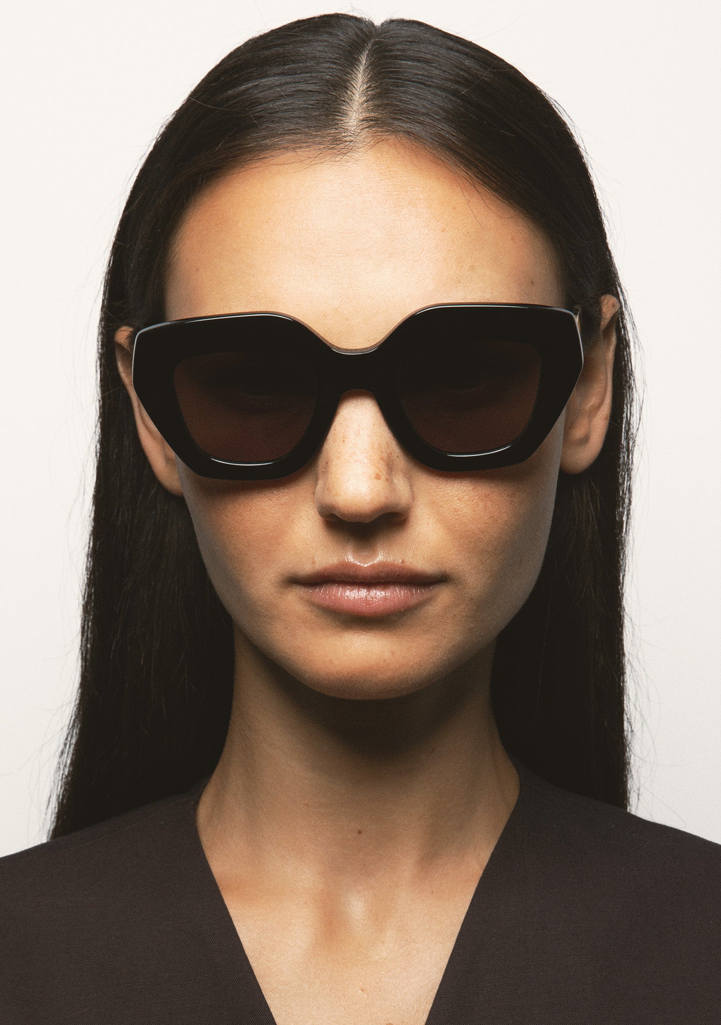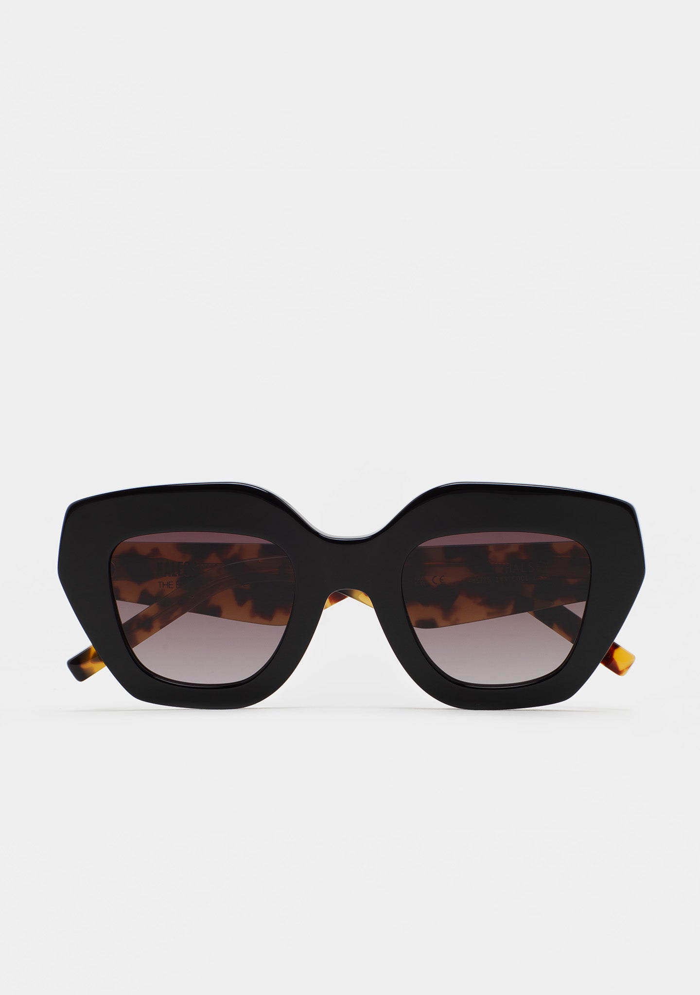 Butterfly-shaped sunglasses. Front made of black acetate and havana brown acetate temples. Grey gradient lens category 3 with base 2, 100% UV protection, and anti-reflective treatment. Integrated acetate nose pads. Handmade.