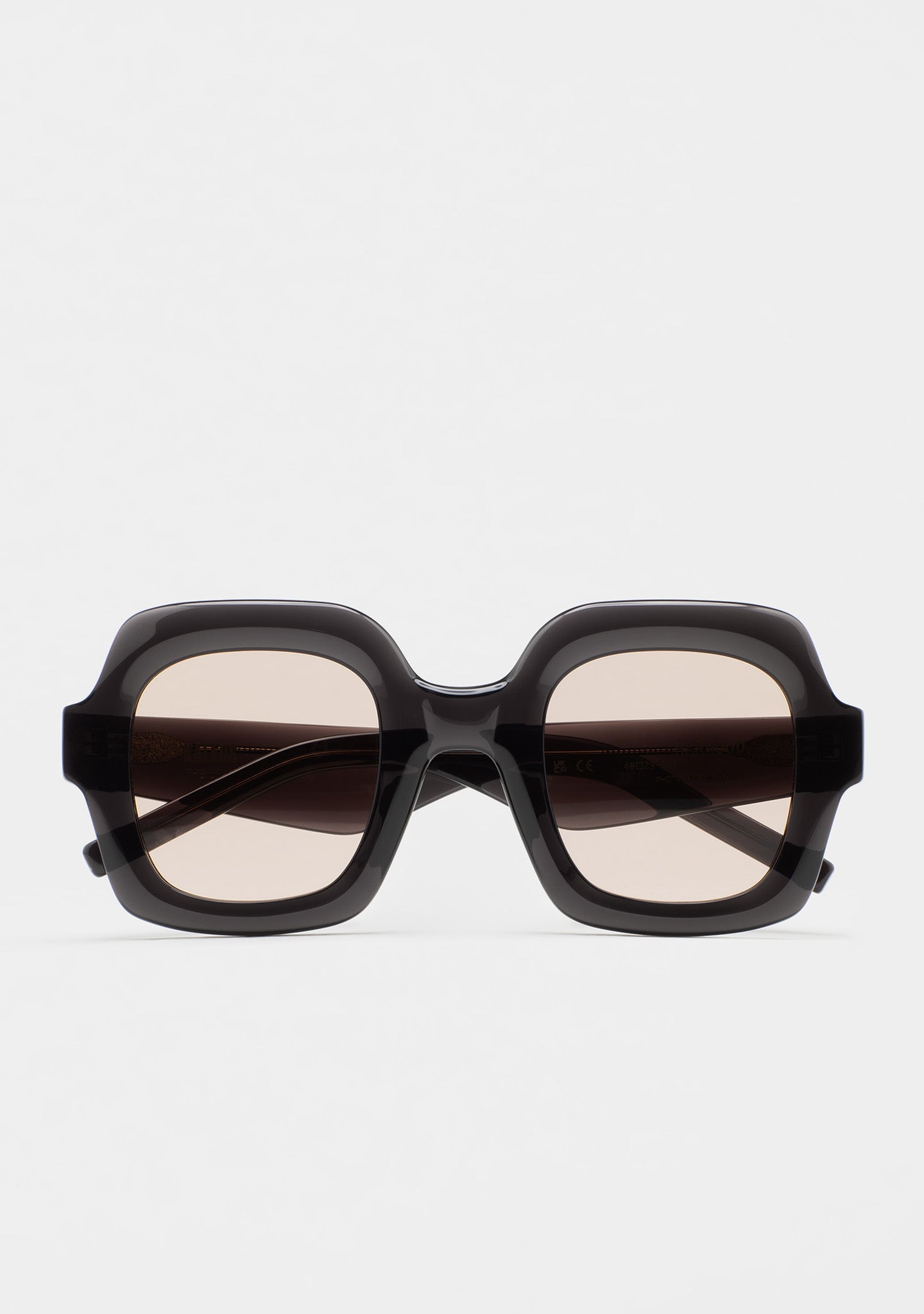 Square-shaped sunglasses with milling around the lens. Transparent gray acetate front and temples. Brown photochromic lens, base 2, with UV protection and anti-reflective treatment. Category 1-3 lens. Integrated acetate nose pads. Handmade.