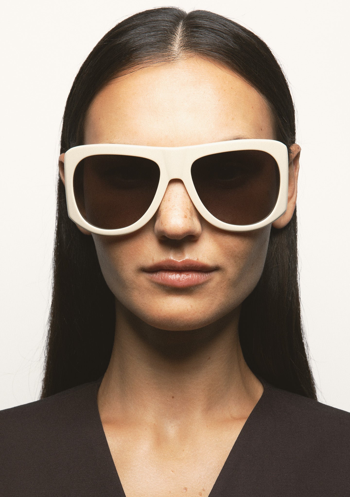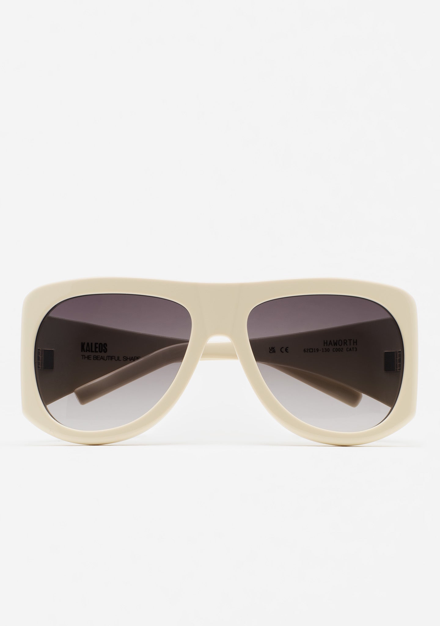 Wraparound Aviator Sunglasses. Beige acetate front and temples. Grey gradient lenses with 100% UV protection and anti-reflective coating. Category 3 lenses. Integrated acetate nose pads. Handmade.