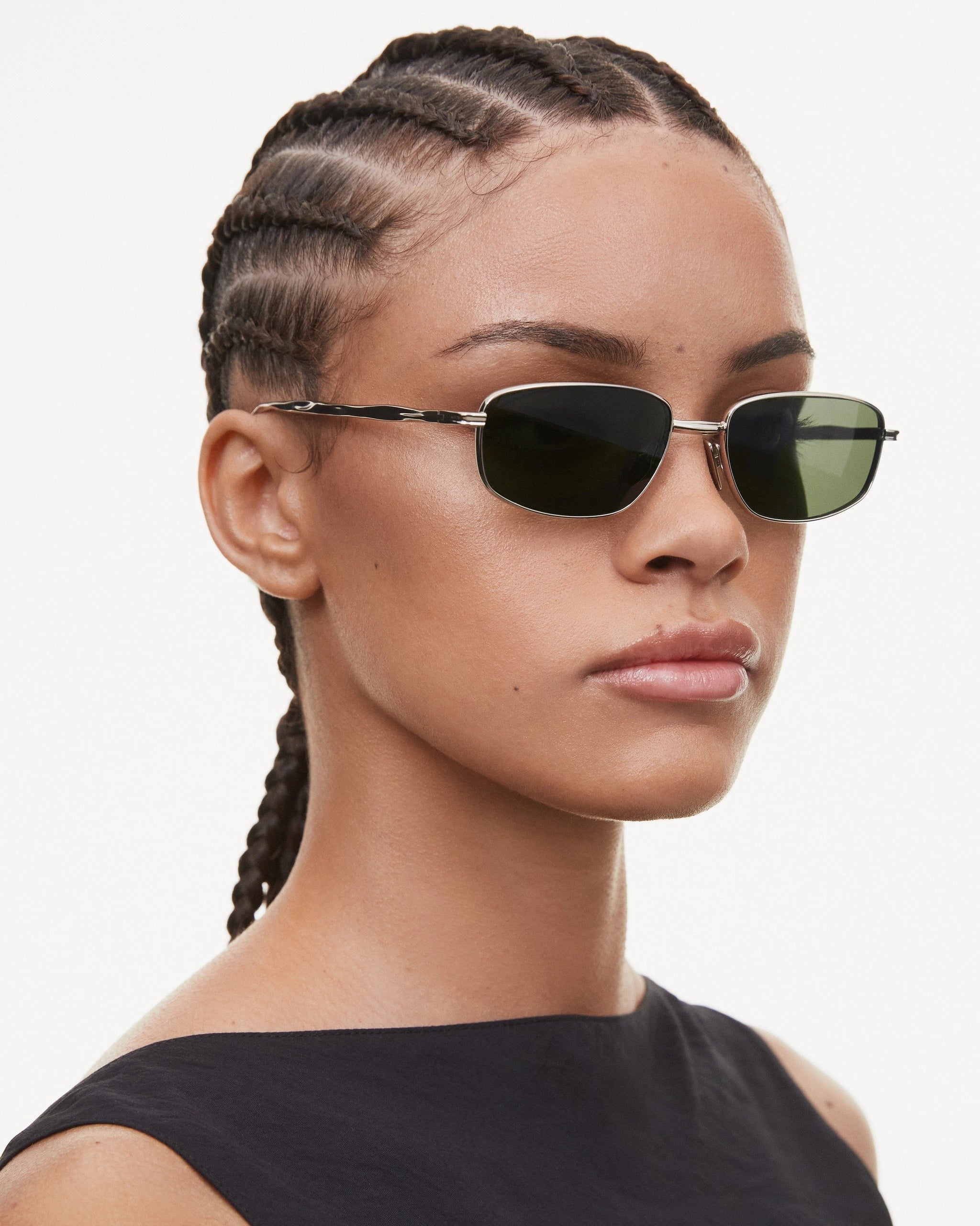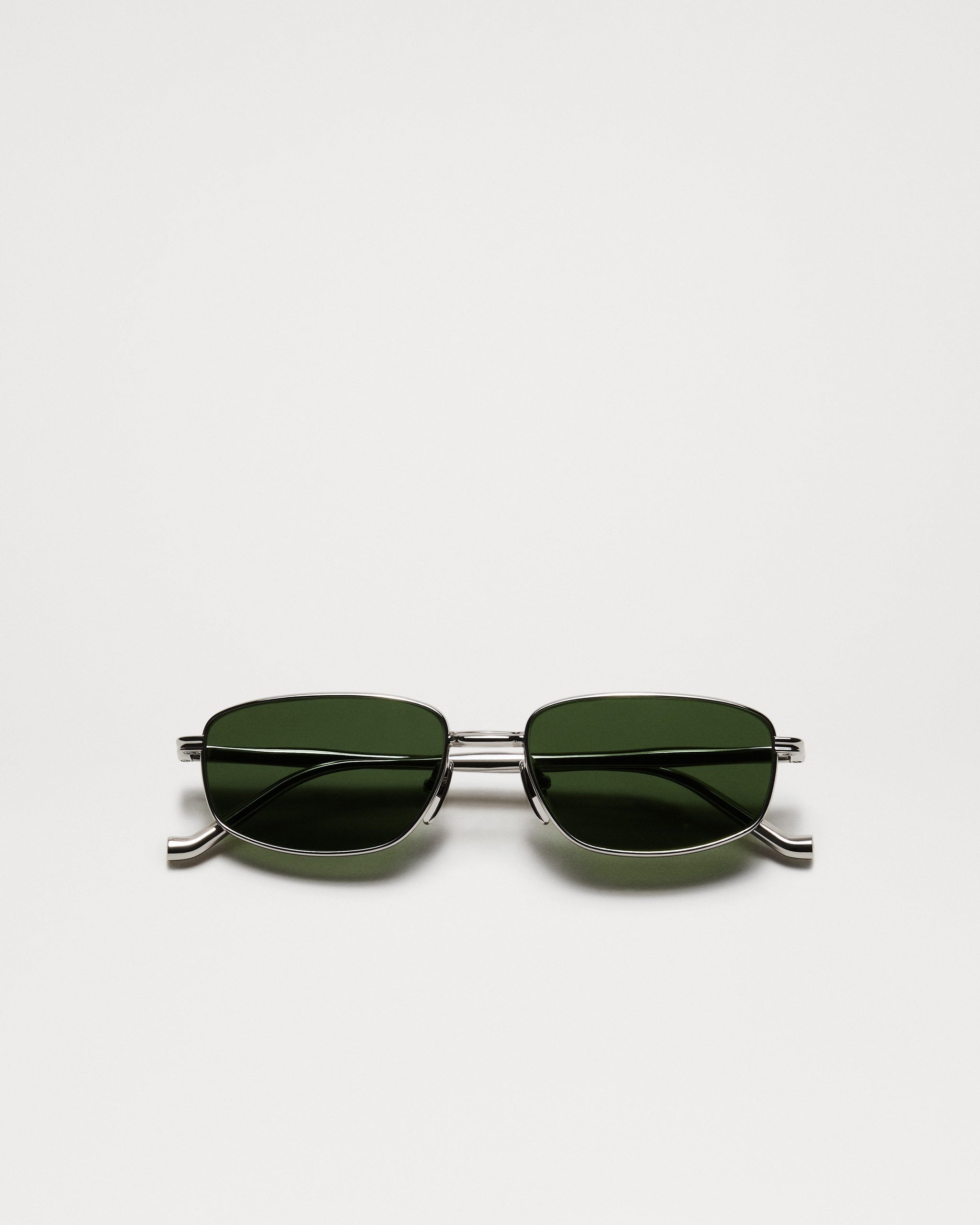 Plane is a stylized rectangular frame with a sophisticated, clean-lined aesthetic. Crafted from lightweight Japanese titanium, at once sleek and durable, and set with mineral lenses for superior clarity. Designed with custom temples that feature a sculptural expression, alluding to implosion, and finished with sharp-angled tips.