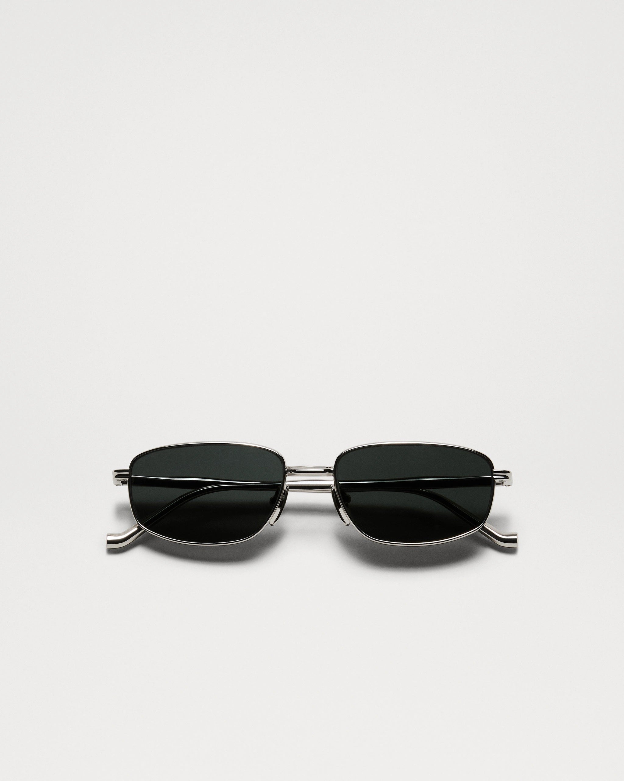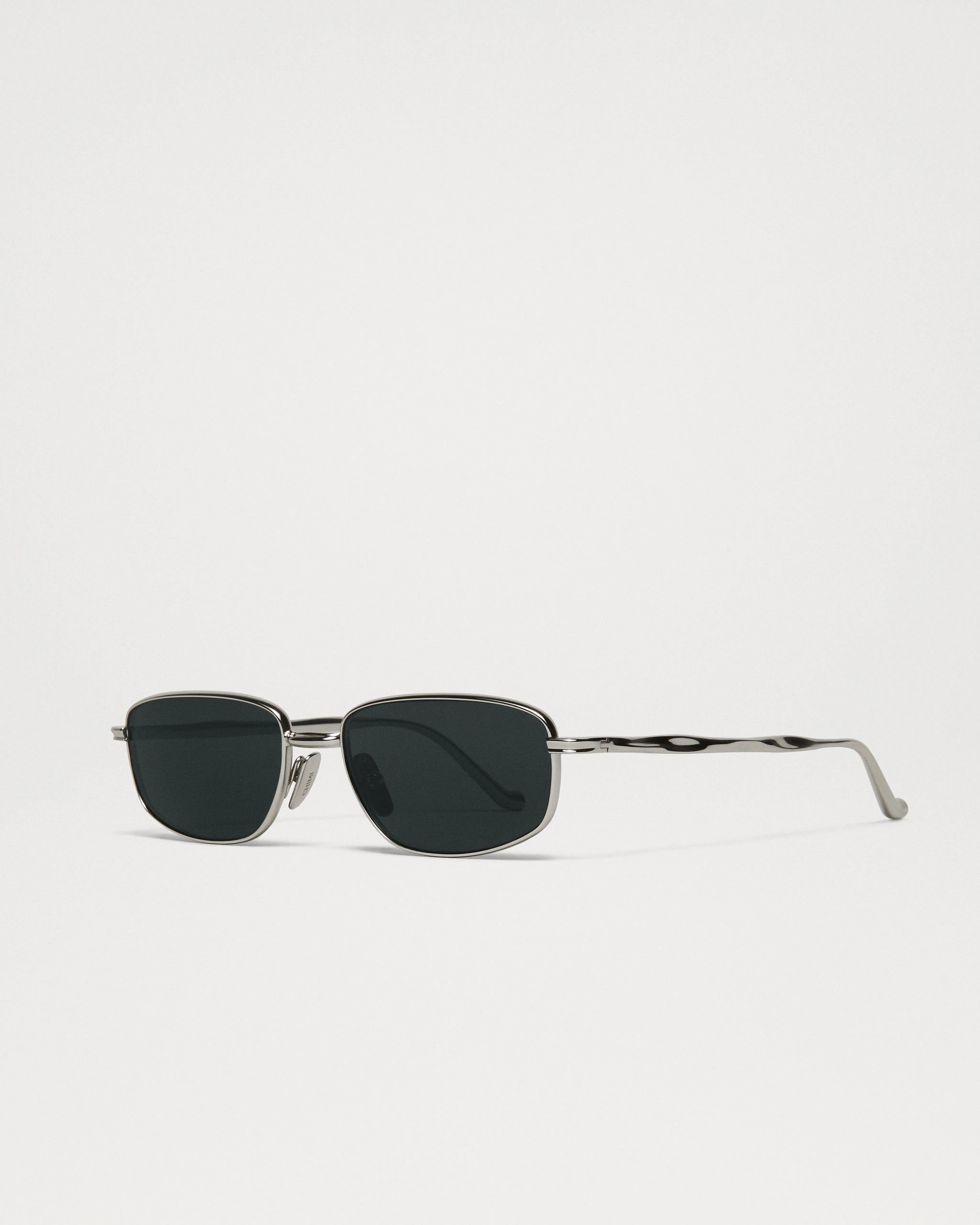Plane is a stylized rectangular frame with a sophisticated, clean-lined aesthetic. Crafted from lightweight Japanese titanium, at once sleek and durable, and set with mineral lenses for superior clarity. Designed with custom temples that feature a sculptural expression, alluding to implosion, and finished with sharp-angled tips.