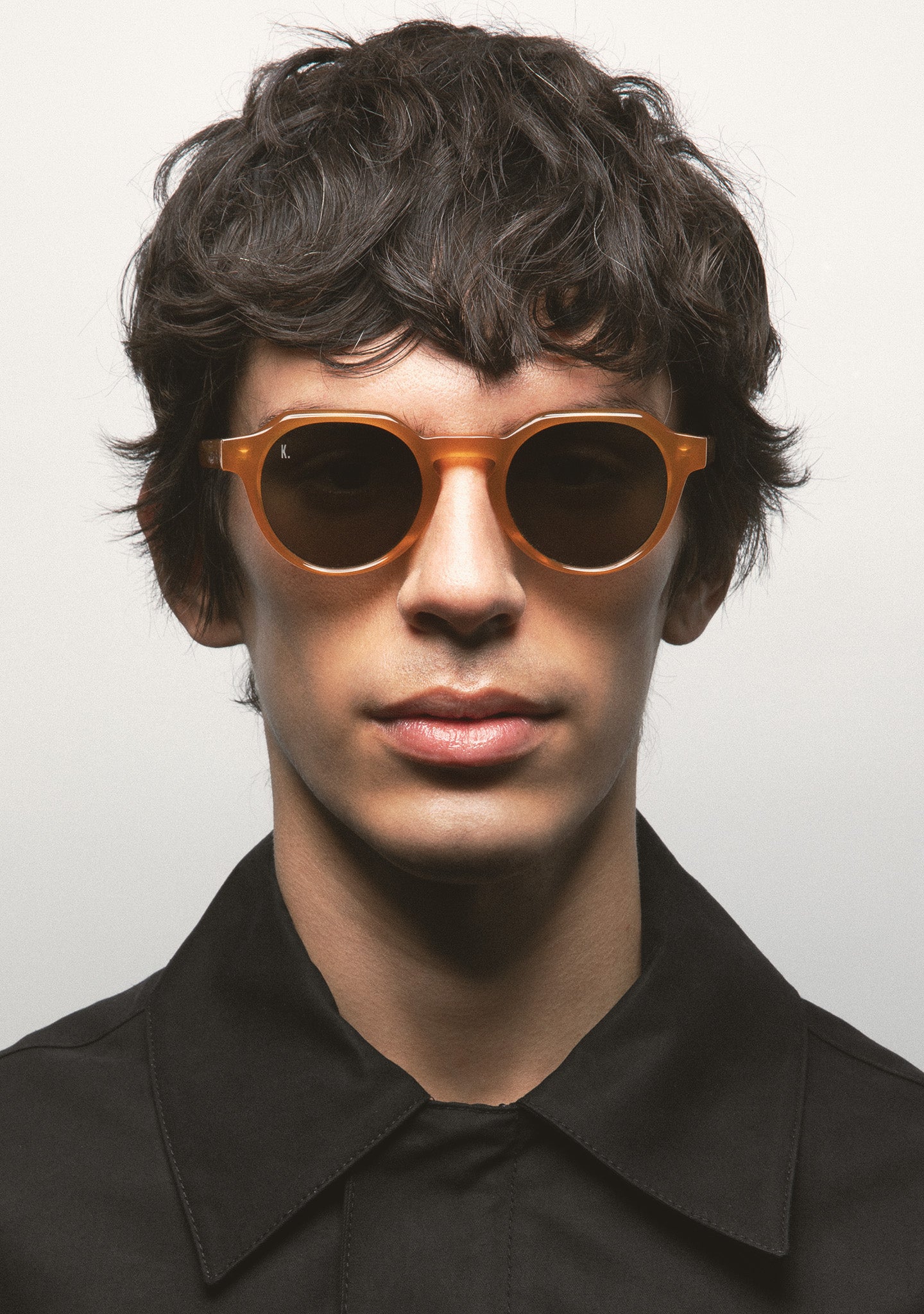Pantos-shaped sunglasses with a flat brow and milling around the lenses. Black acetate frame front and temples. Gradient dark blue lenses, base 2, with 100% UV protection and anti-reflective treatment. Category 3 lenses. Built-in acetate nose pads. Handmade.