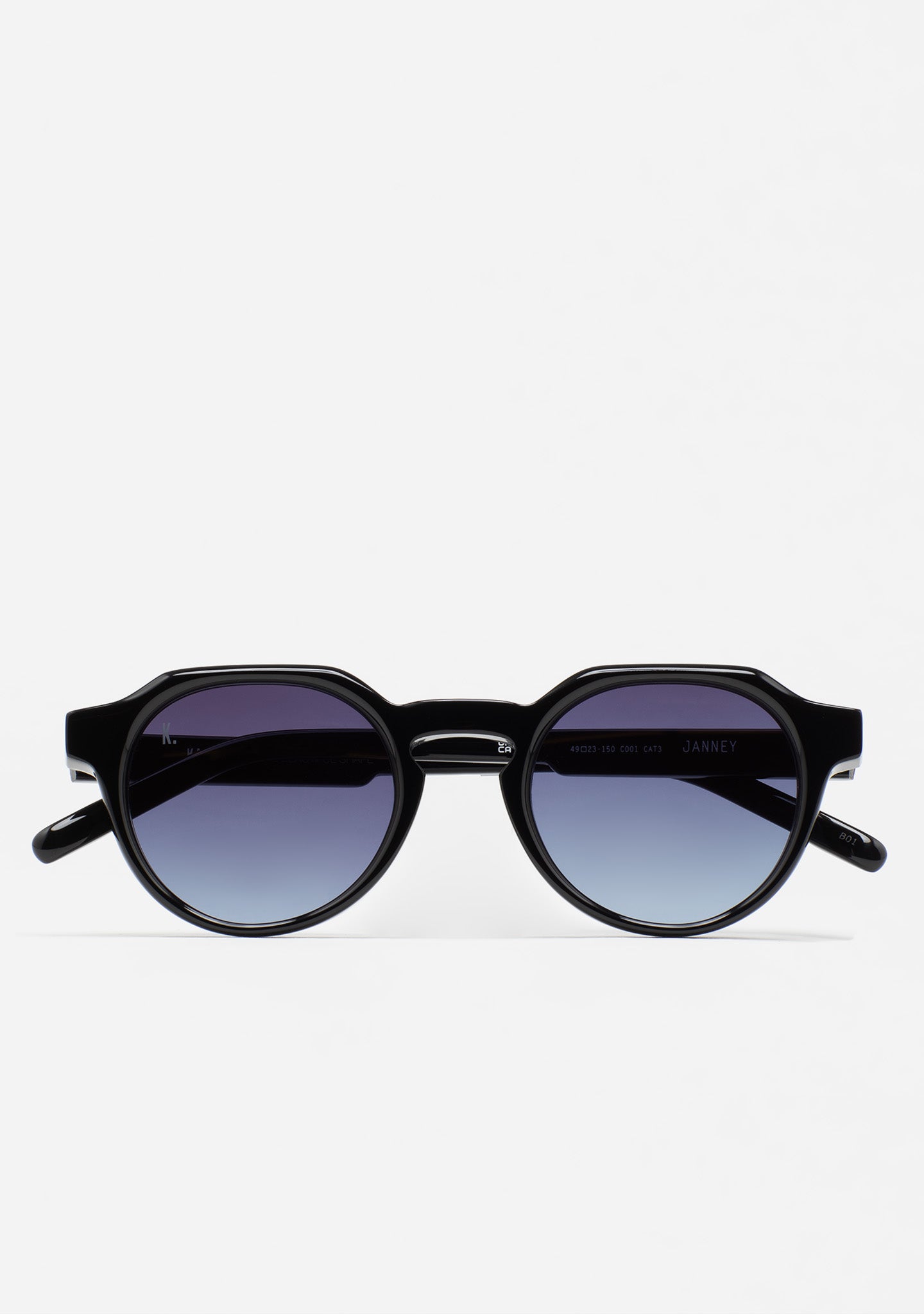 Pantos-shaped sunglasses with a flat brow and milling around the lenses. Black acetate frame front and temples. Gradient dark blue lenses, base 2, with 100% UV protection and anti-reflective treatment. Category 3 lenses. Built-in acetate nose pads. Handmade.