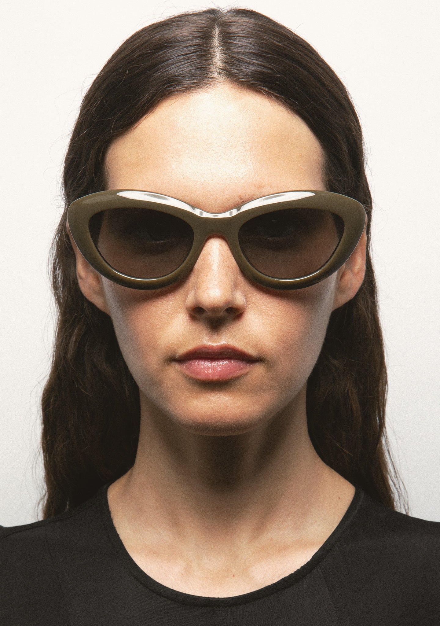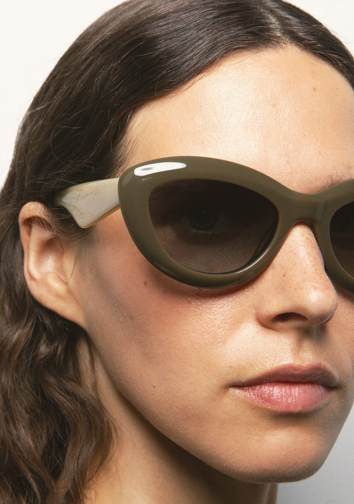 Cat-eye sunglasses with rounded edges. Black acetate front and temples. Brown photochromic 2-base lens with 100% UV protection and anti-reflective treatment. Category 1-3 lenses. Built-in acetate nose pads. Handmade.