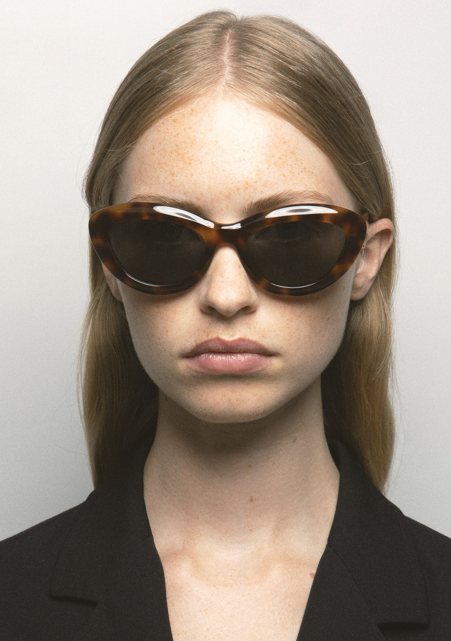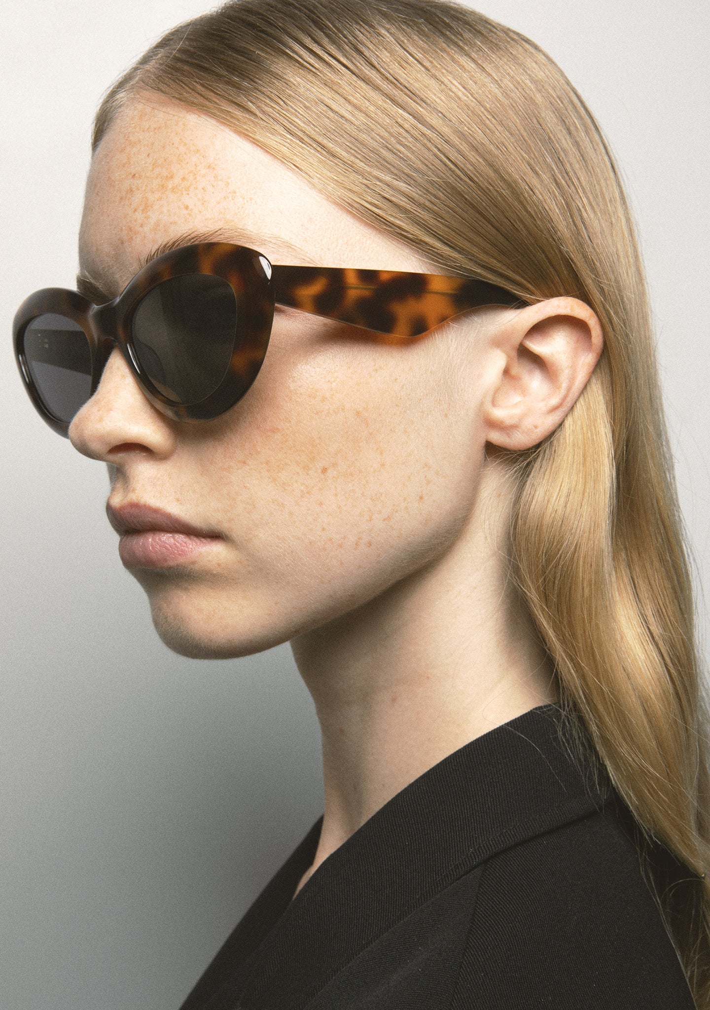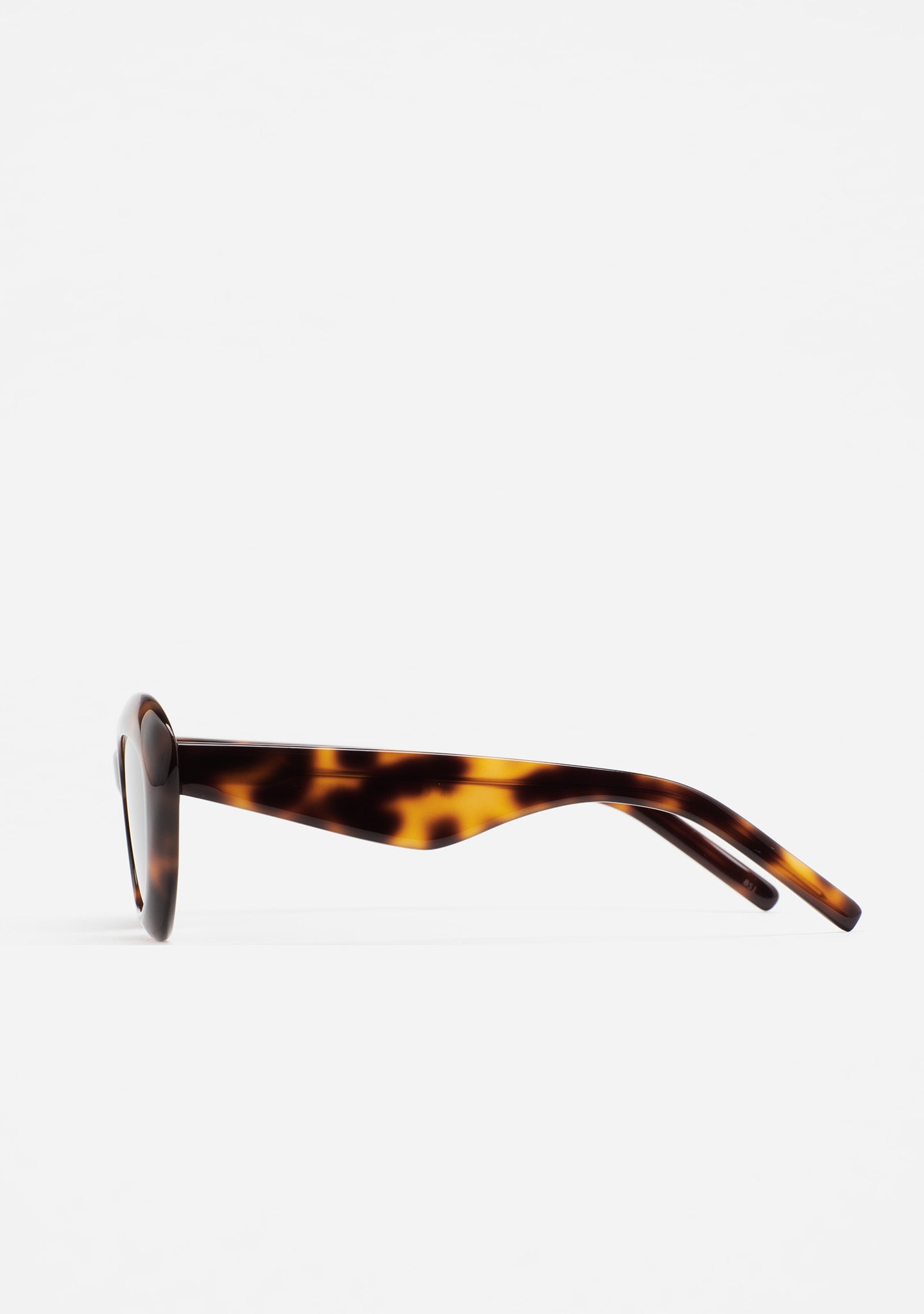 Cat-eye sunglasses with rounded edges. Black acetate front and temples. Brown photochromic 2-base lens with 100% UV protection and anti-reflective treatment. Category 1-3 lenses. Built-in acetate nose pads. Handmade.