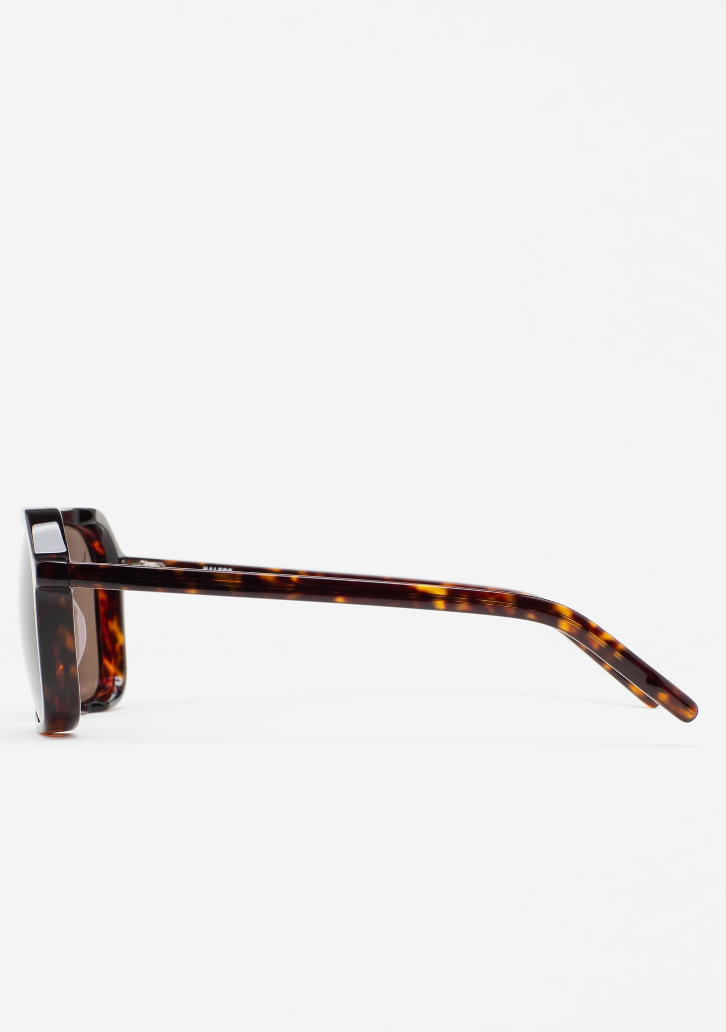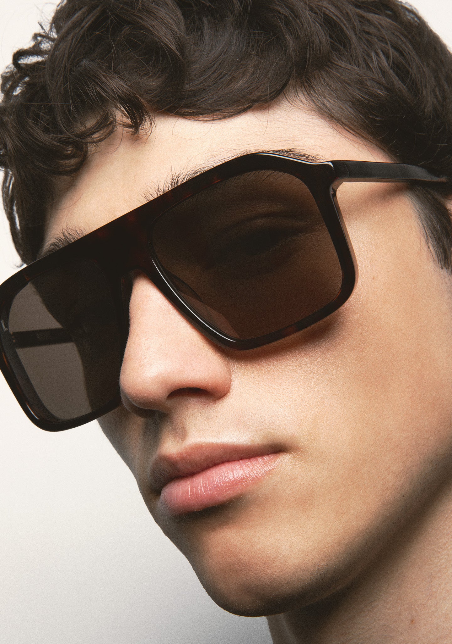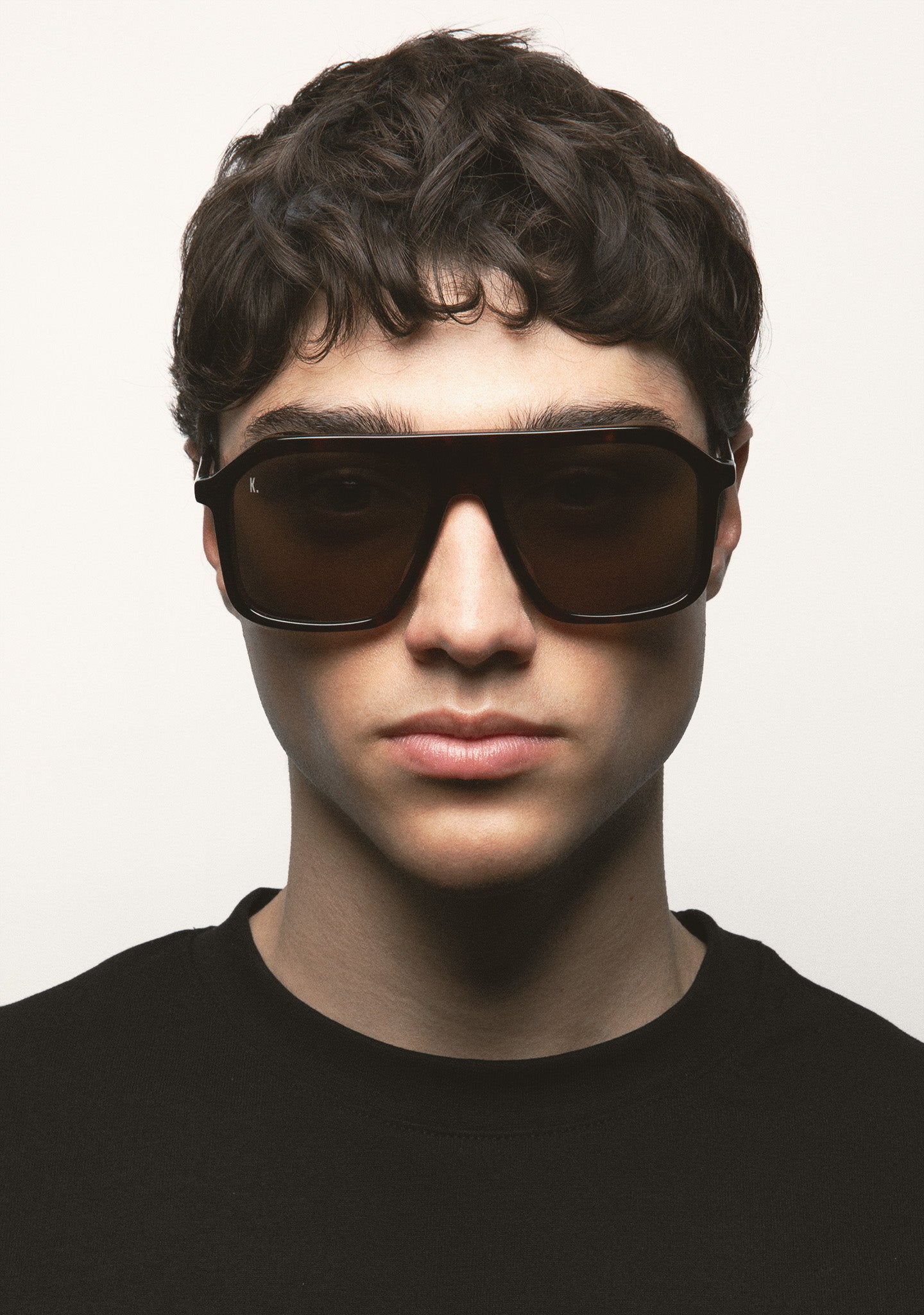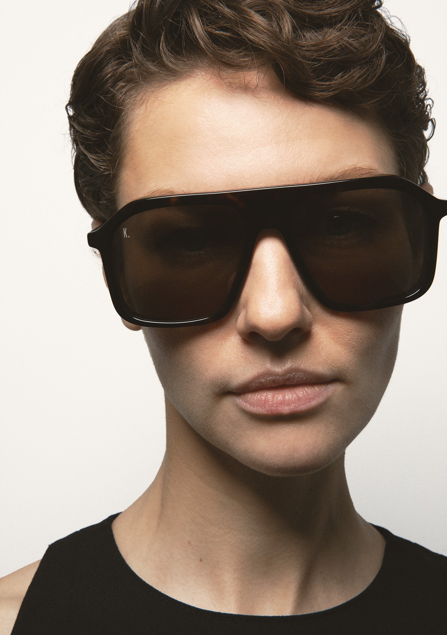 Square sunglasses with flat bridge and side shields. Matte black acetate frame and thin temples. Gradient dark blue lens, base 6, with 100% UV protection and anti-reflective treatment. Category 3 lens. Integrated acetate nose pads. Handcrafted.