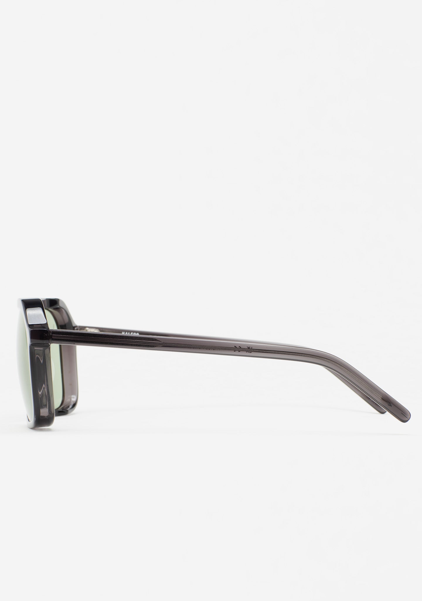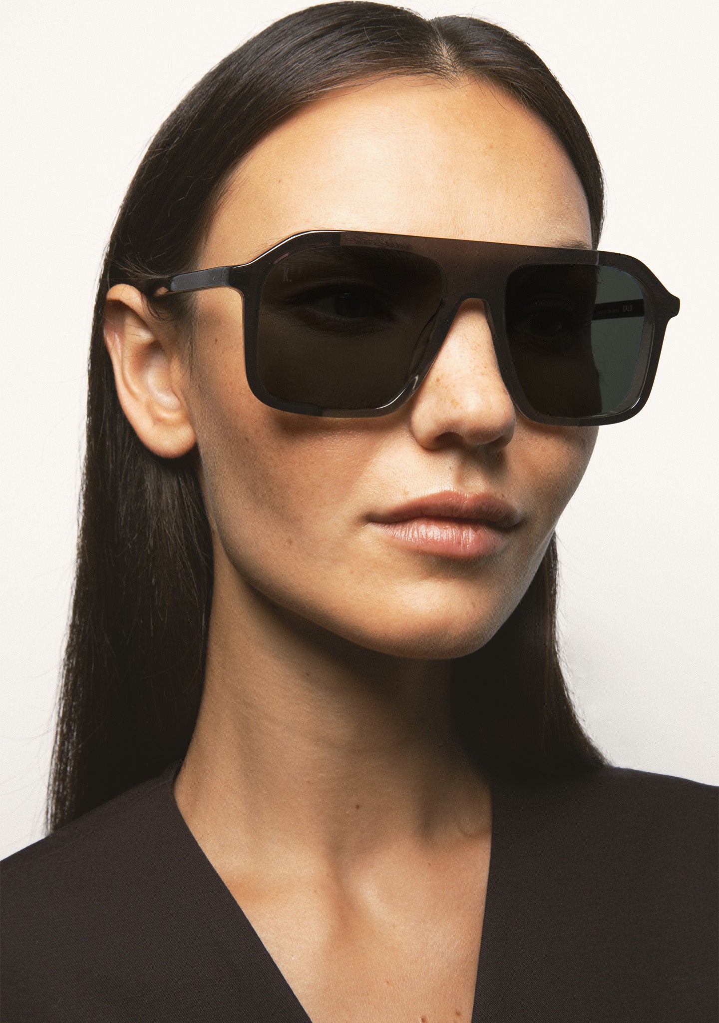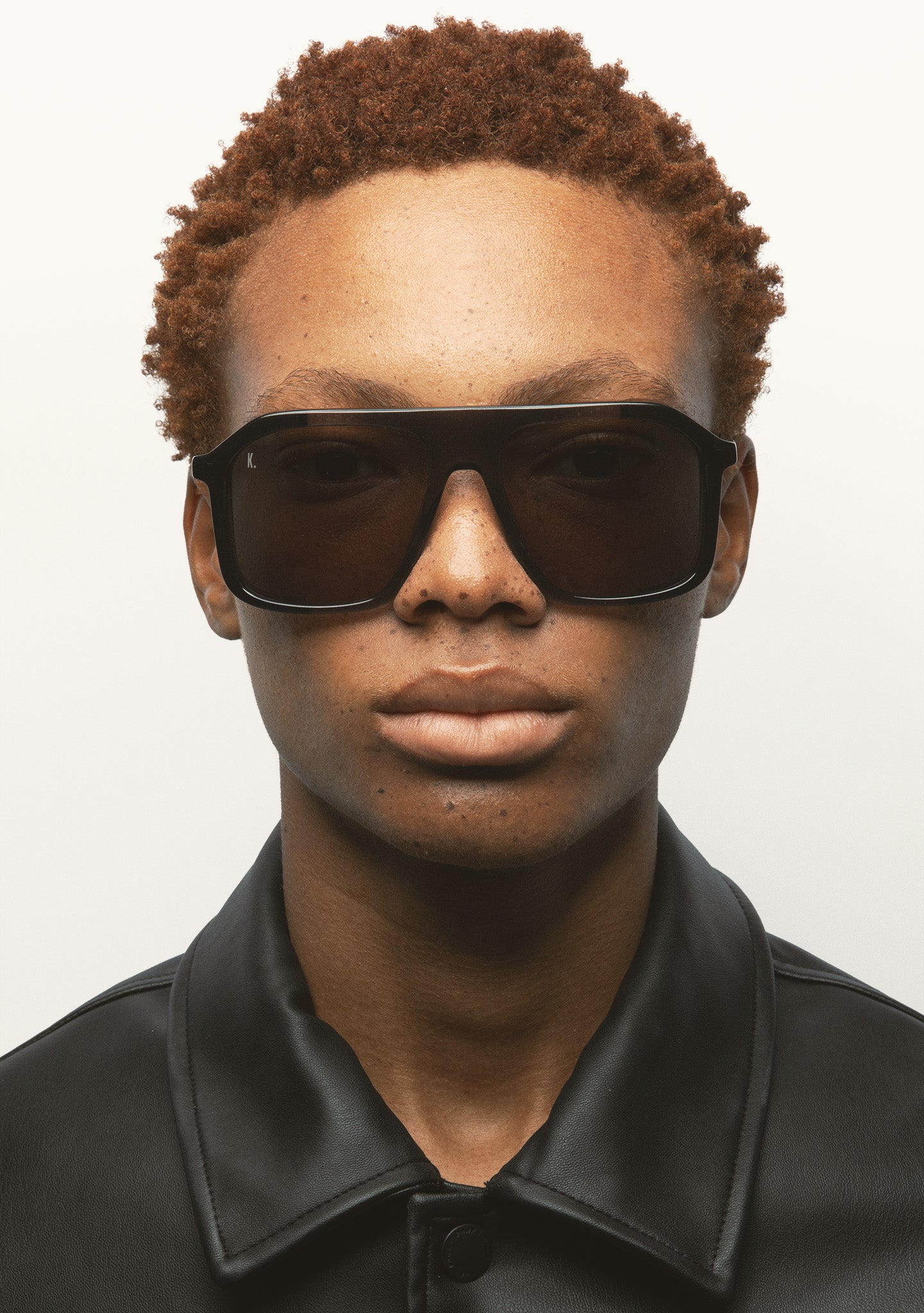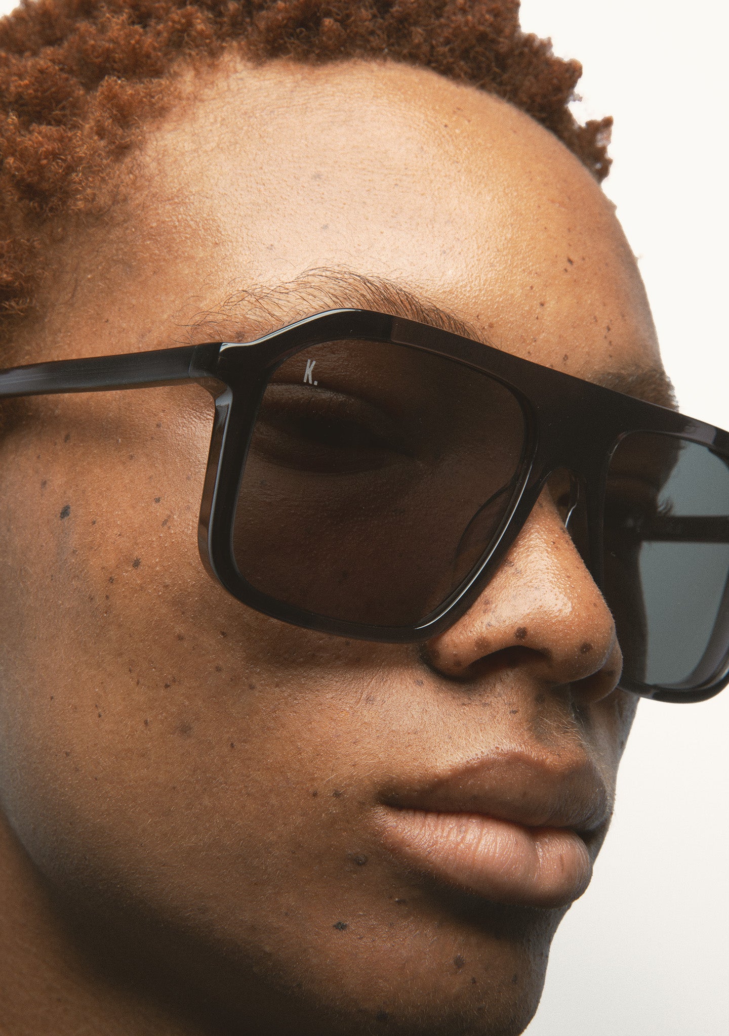 Square sunglasses with flat bridge and side shields. Matte black acetate frame and thin temples. Gradient dark blue lens, base 6, with 100% UV protection and anti-reflective treatment. Category 3 lens. Integrated acetate nose pads. Handcrafted.
