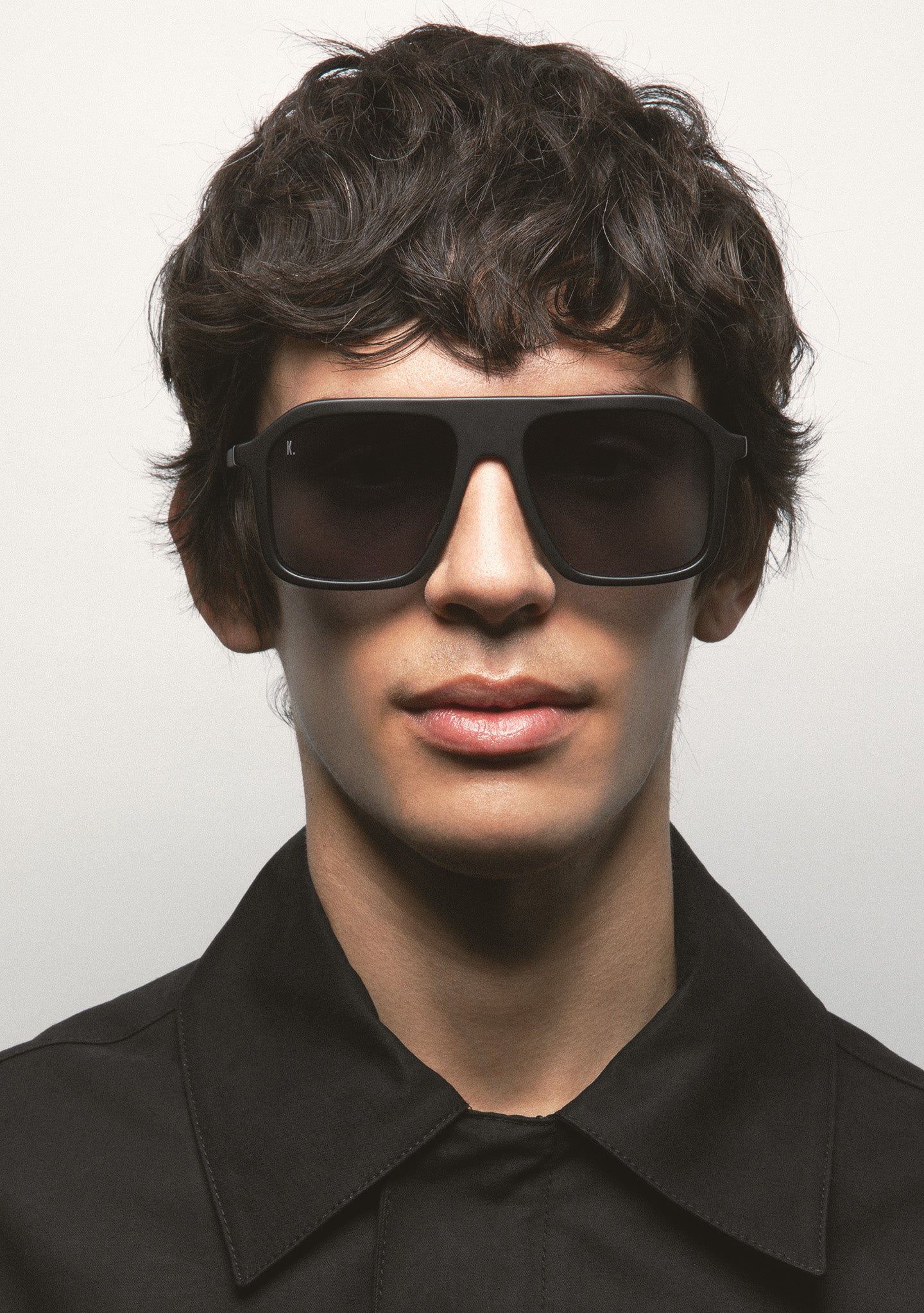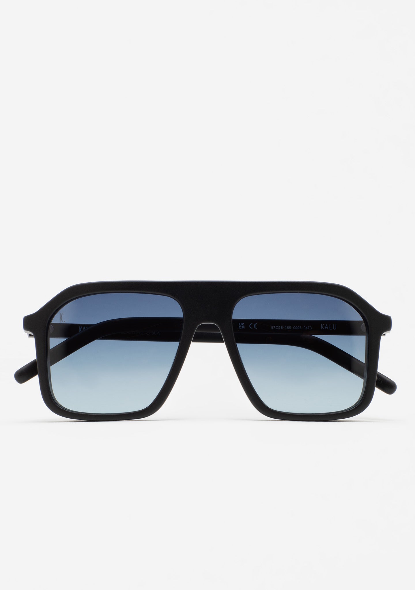 Square sunglasses with flat bridge and side shields. Matte black acetate frame and thin temples. Gradient dark blue lens, base 6, with 100% UV protection and anti-reflective treatment. Category 3 lens. Integrated acetate nose pads. Handcrafted.