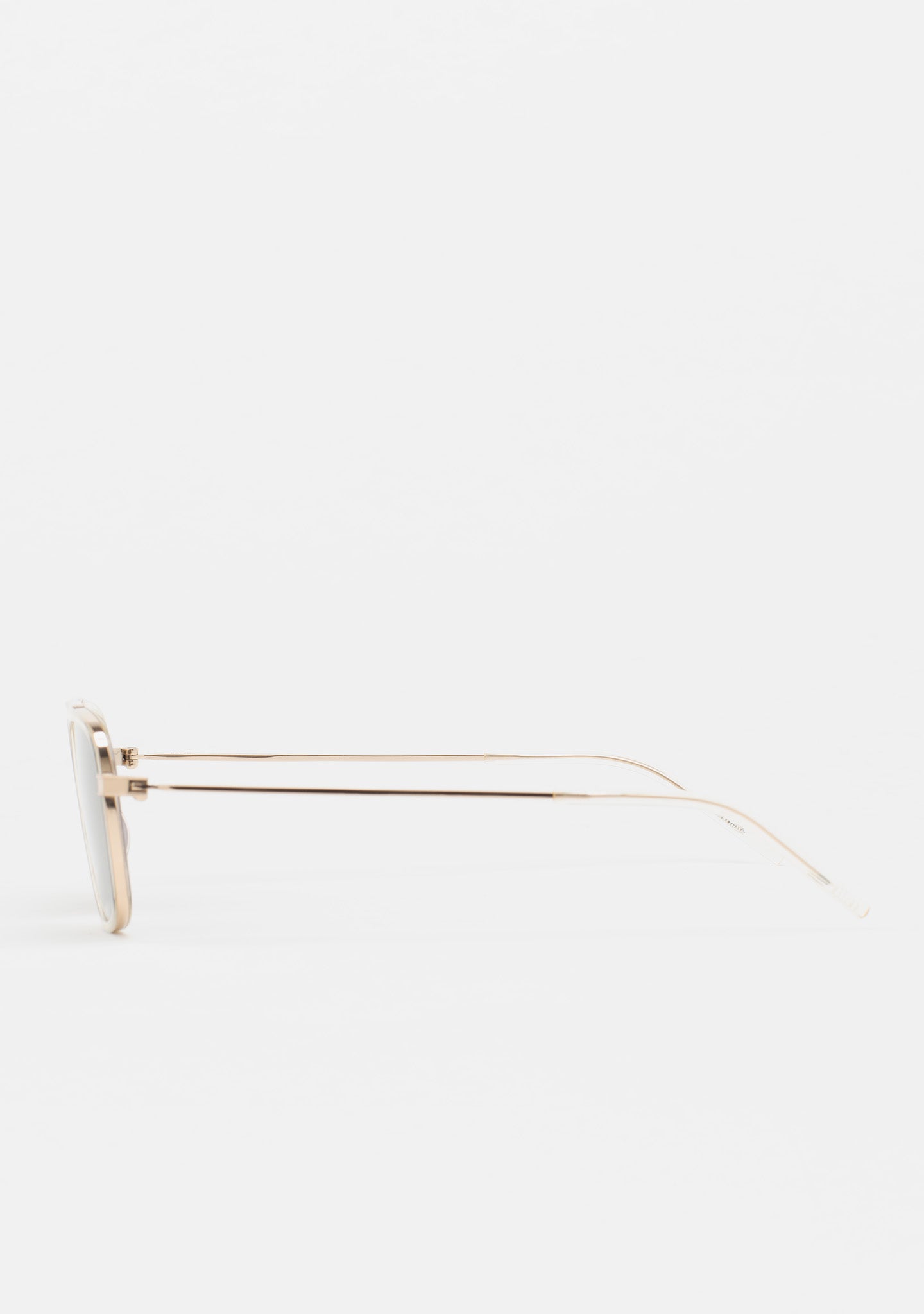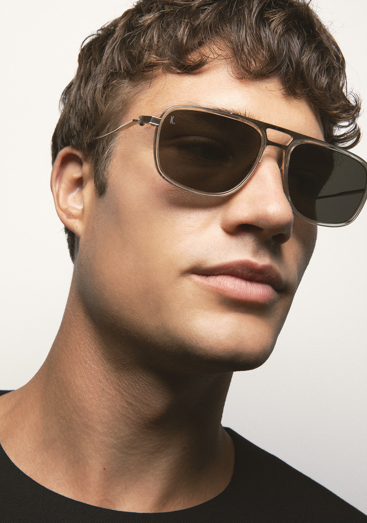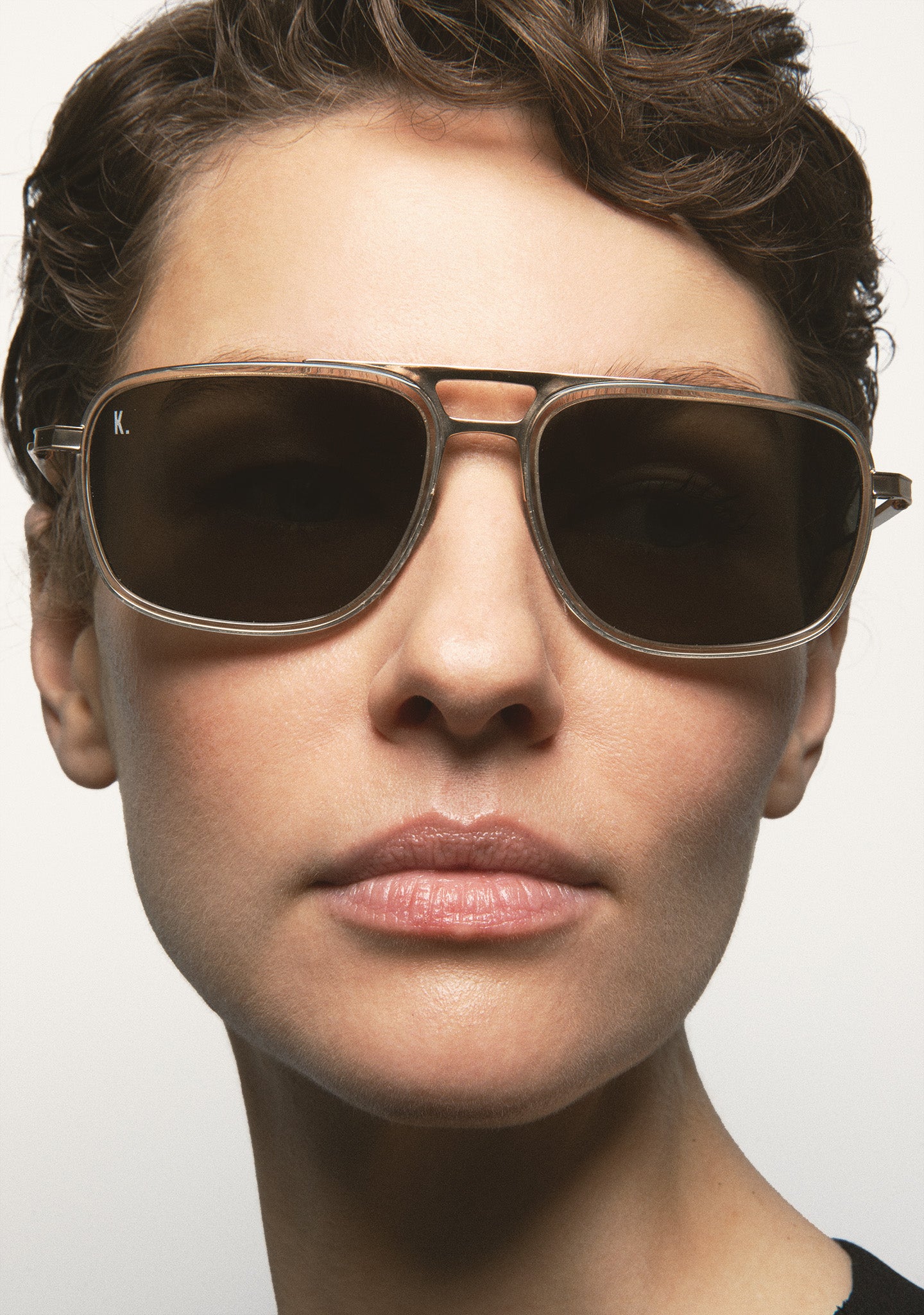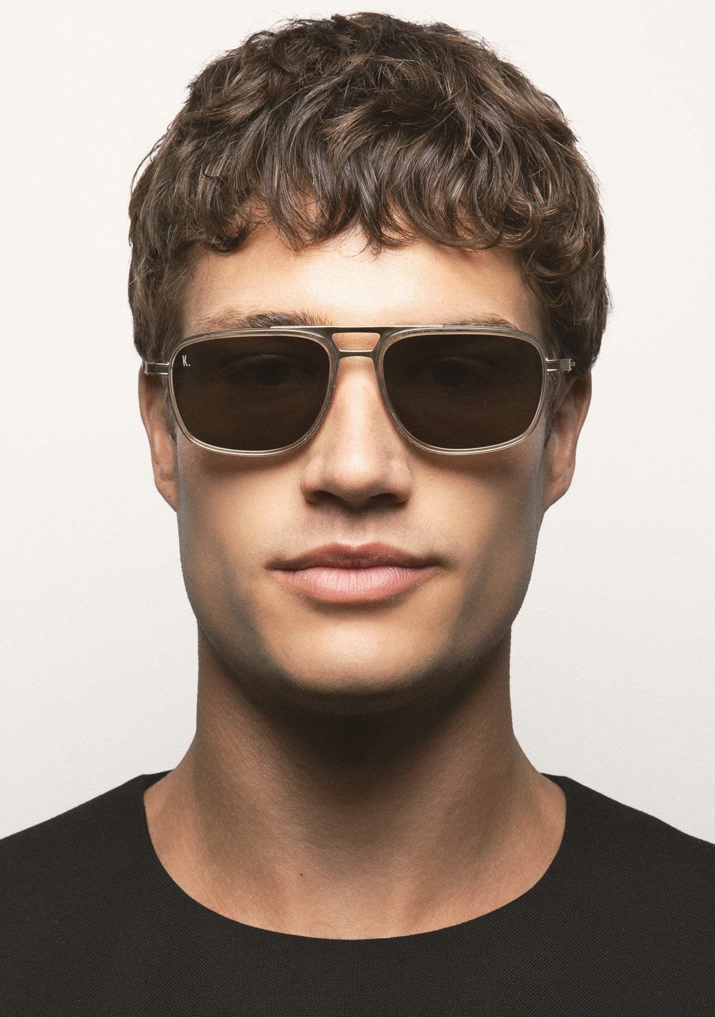 Rectangular double-bridge sunglasses. Brown titanium front with translucent brown high-density acetate rim. Brown titanium temples and bridge. Translucent brown acetate temple tips. Gradient brown lens, base 2, with 100% UV protection and anti-reflective treatment. Category 3 lens. Integrated acetate nose pads. Handmade.