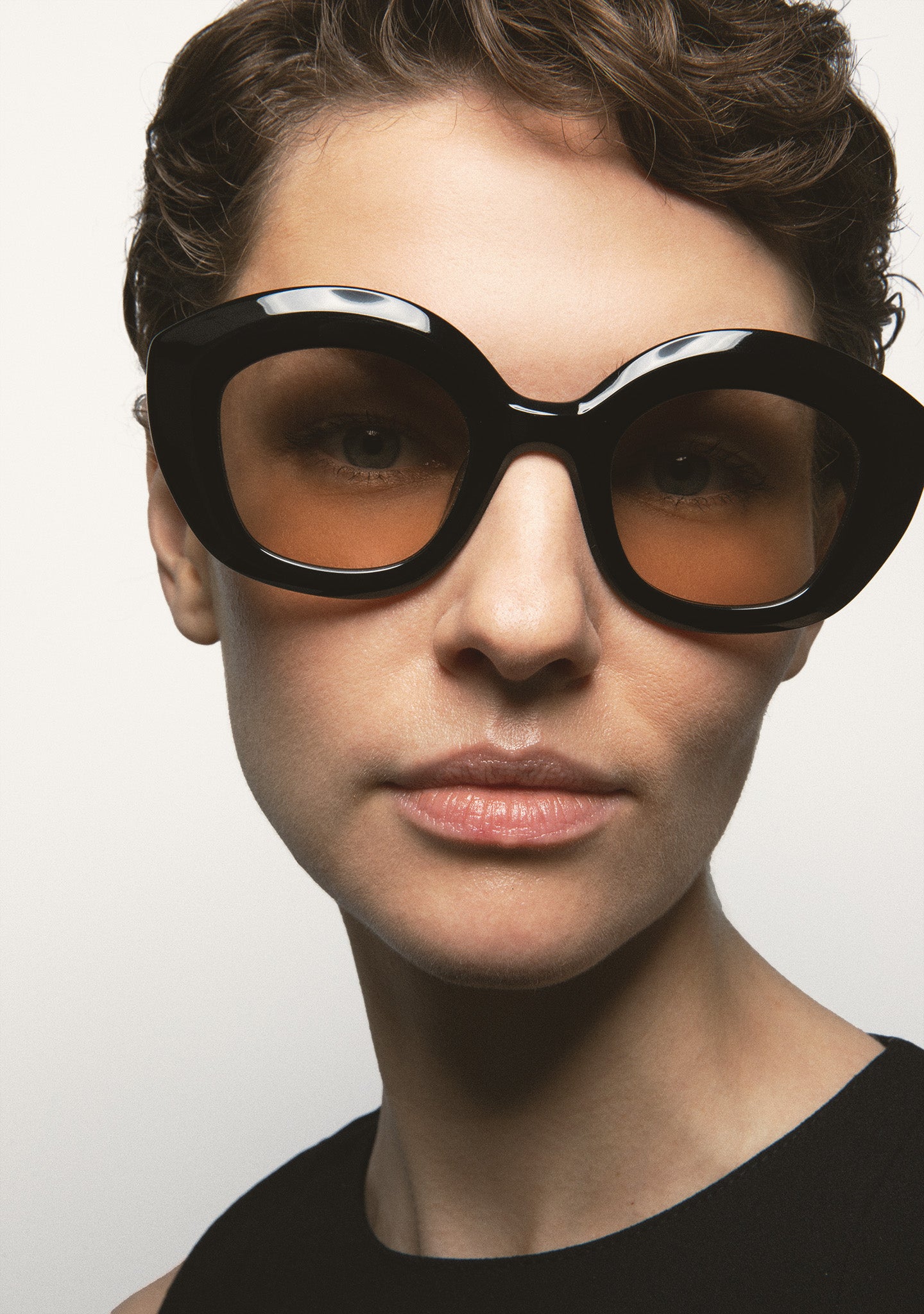 Butterfly-shaped sunglasses with milling throughout the front and temples for a voluminous effect. Black acetate front and temples. Brown photochromic lens, base 2, with UV protection and anti-reflective treatment. Category 1-3 lens. Integrated acetate nose pads. Handmade.