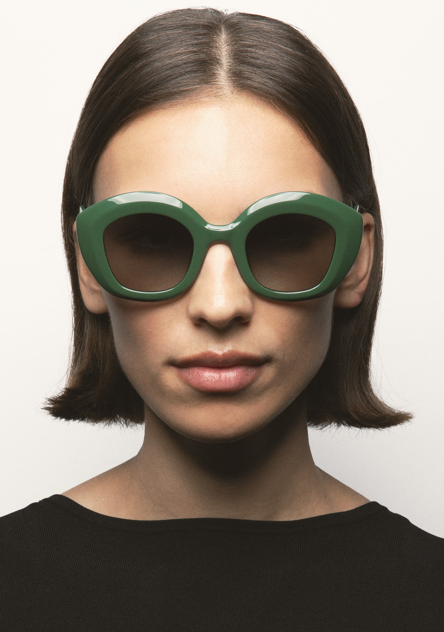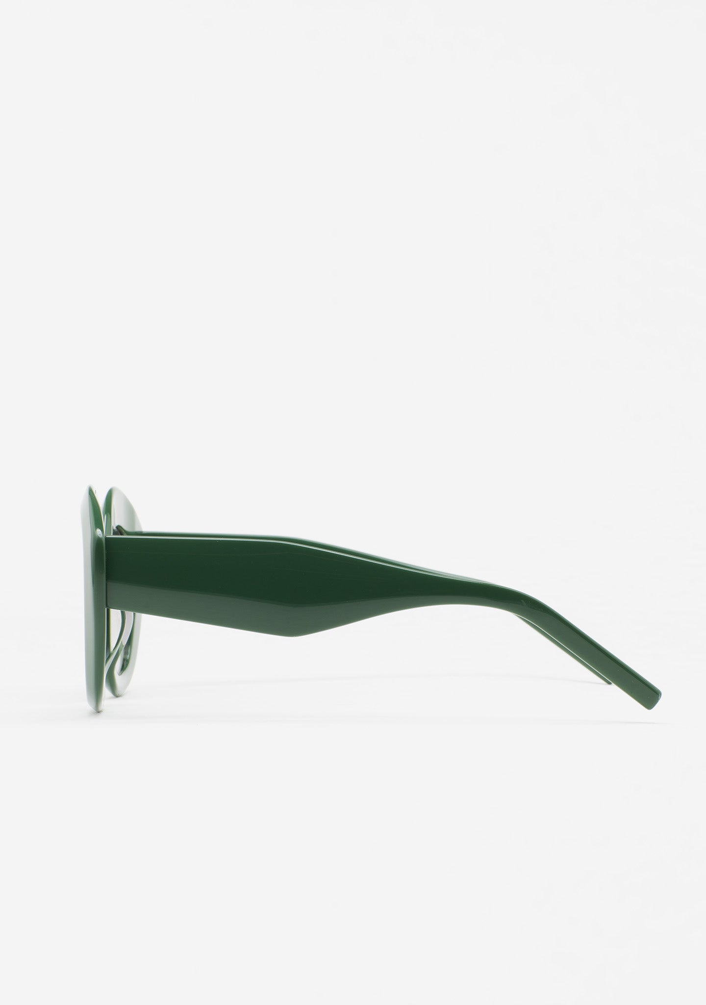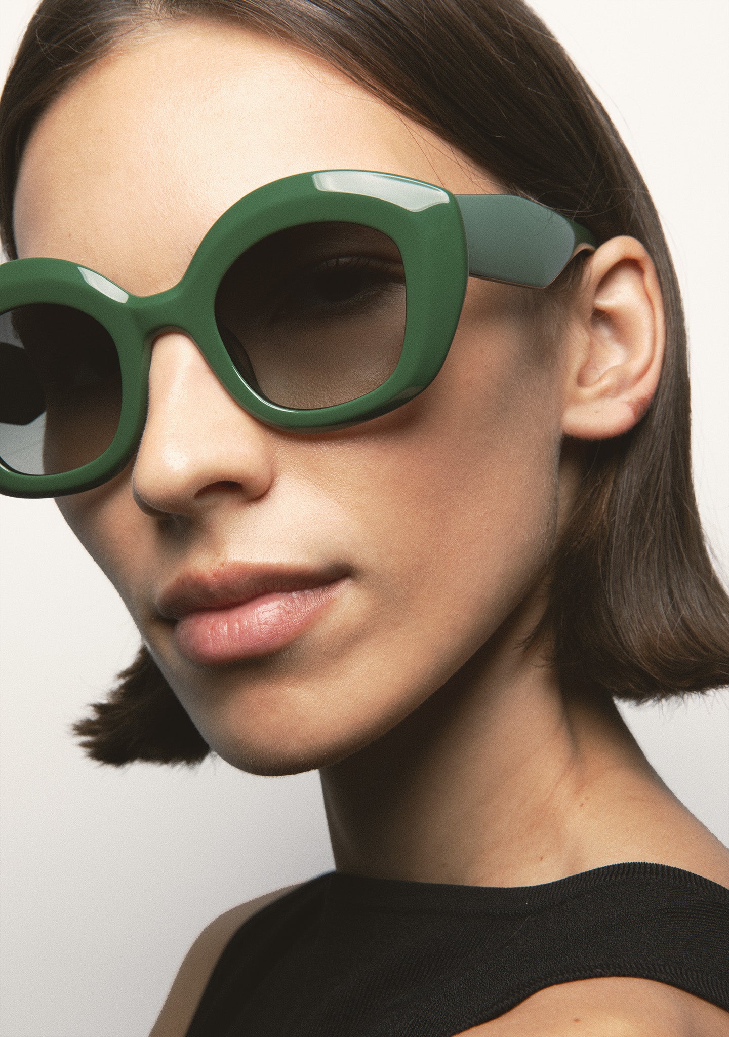 Butterfly-shaped sunglasses with milling throughout the front and temples for a voluminous effect. Black acetate front and temples. Brown photochromic lens, base 2, with UV protection and anti-reflective treatment. Category 1-3 lens. Integrated acetate nose pads. Handmade.