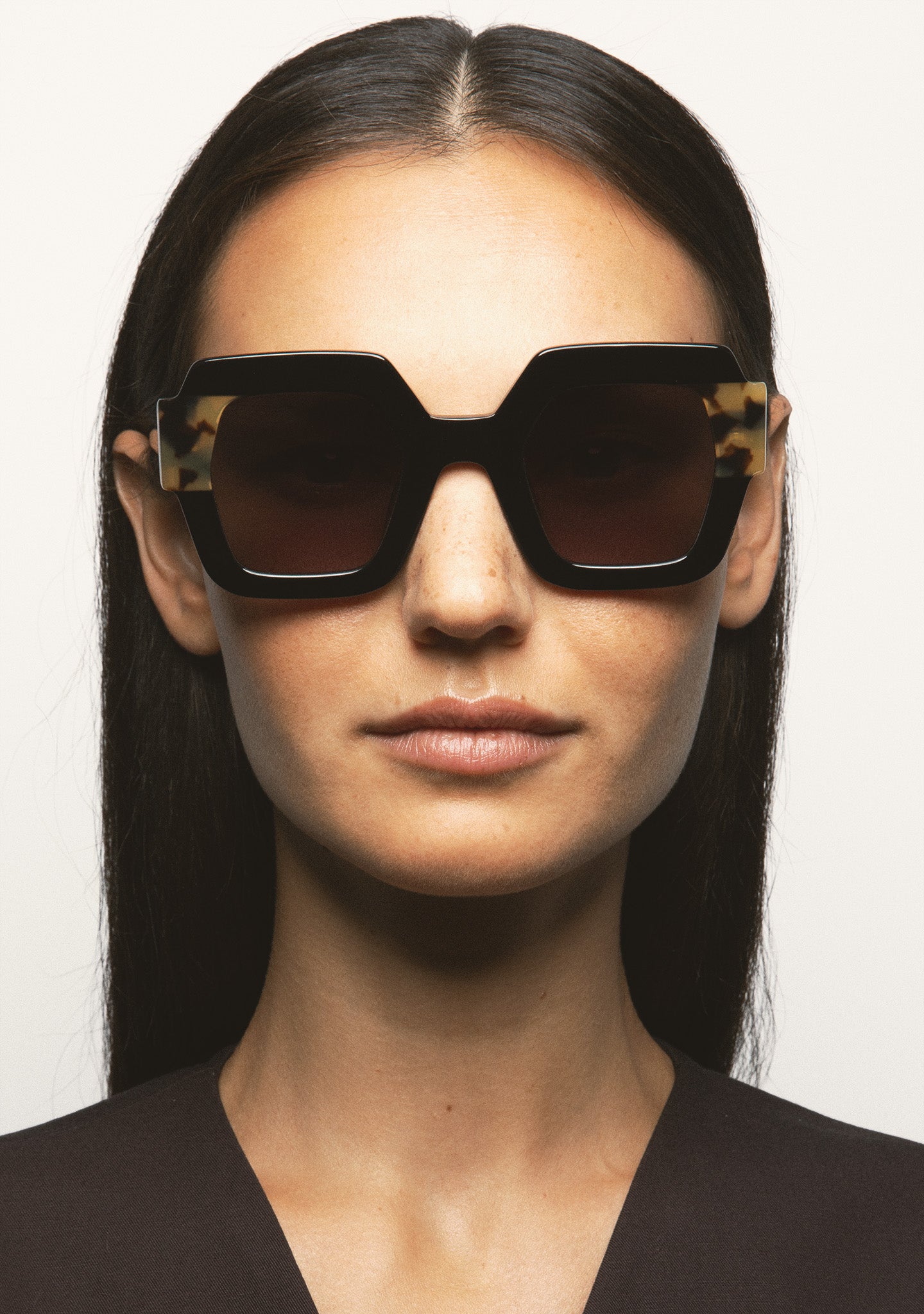 Square Sunglasses. Black acetate front with brown Havana laminate. Black acetate temples. Gray gradient lenses, base 2, with 100% UV protection and anti-reflective coating. Category 3 lenses. Integrated acetate nose pads. Handmade.