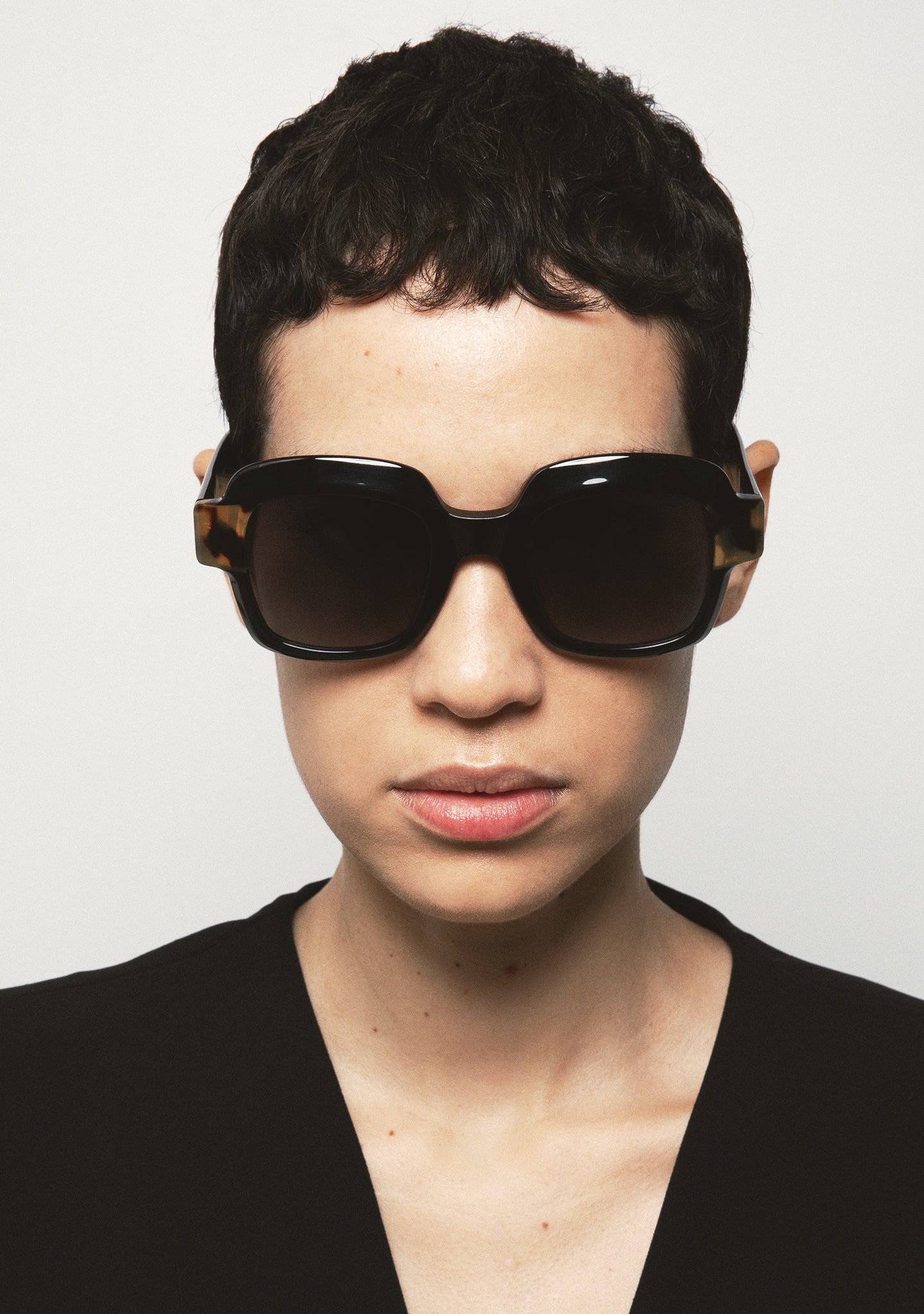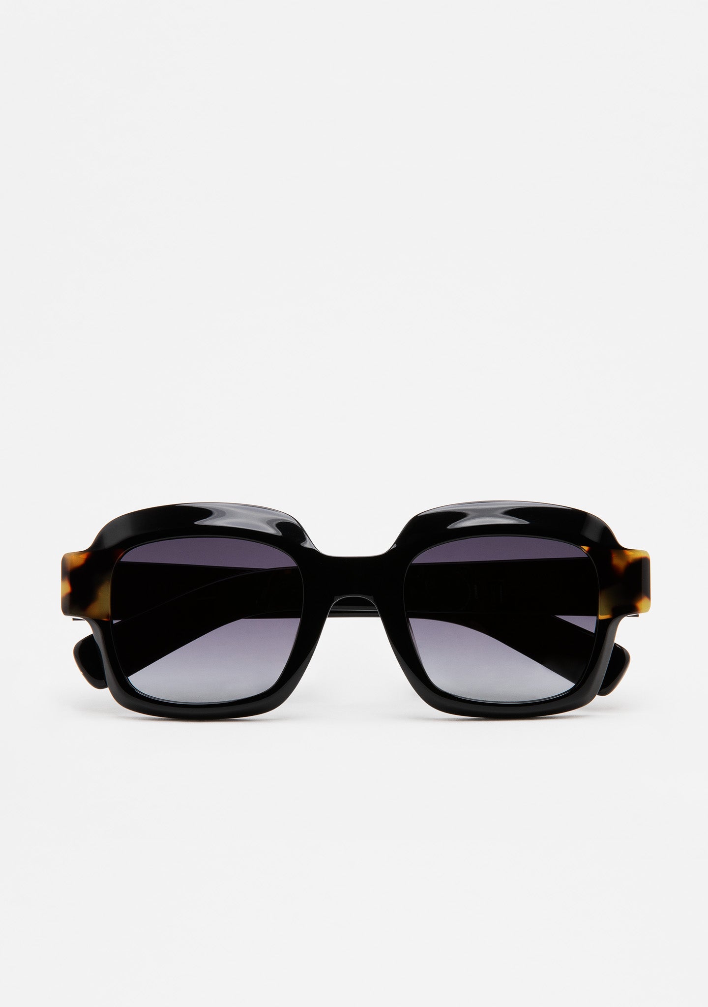 Oversized square sunglasses with milling on the top bar. Frame front in black acetate with brown tortoiseshell laminate. Black acetate temples. Black gradient tint base 2 lenses with 100% UV protection and anti-reflective treatment. Category 3 lenses. Built-in acetate nose pads. Handmade.