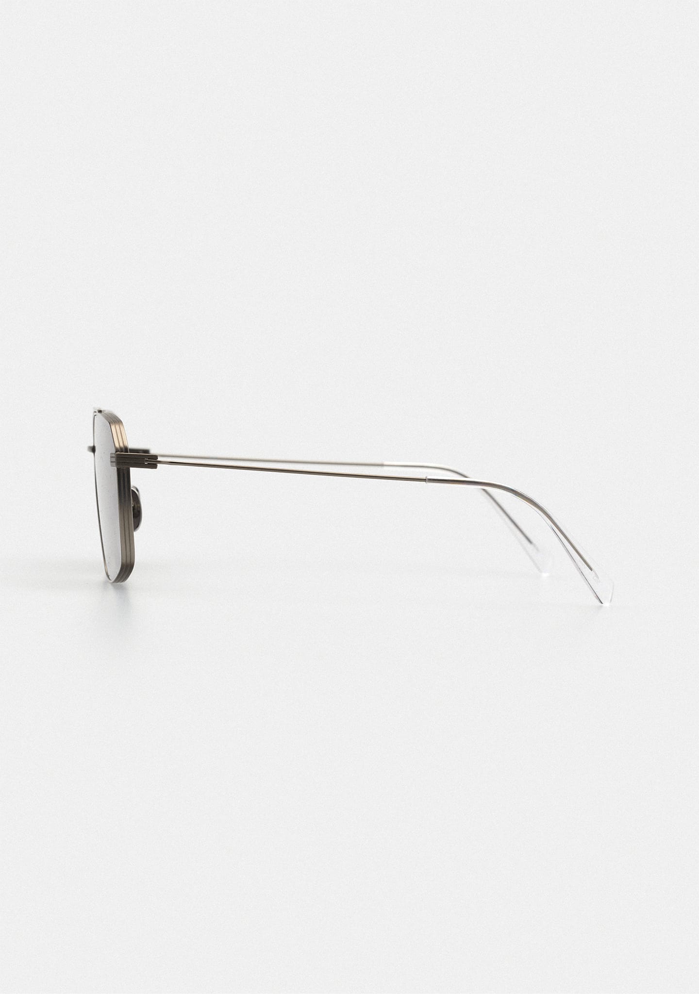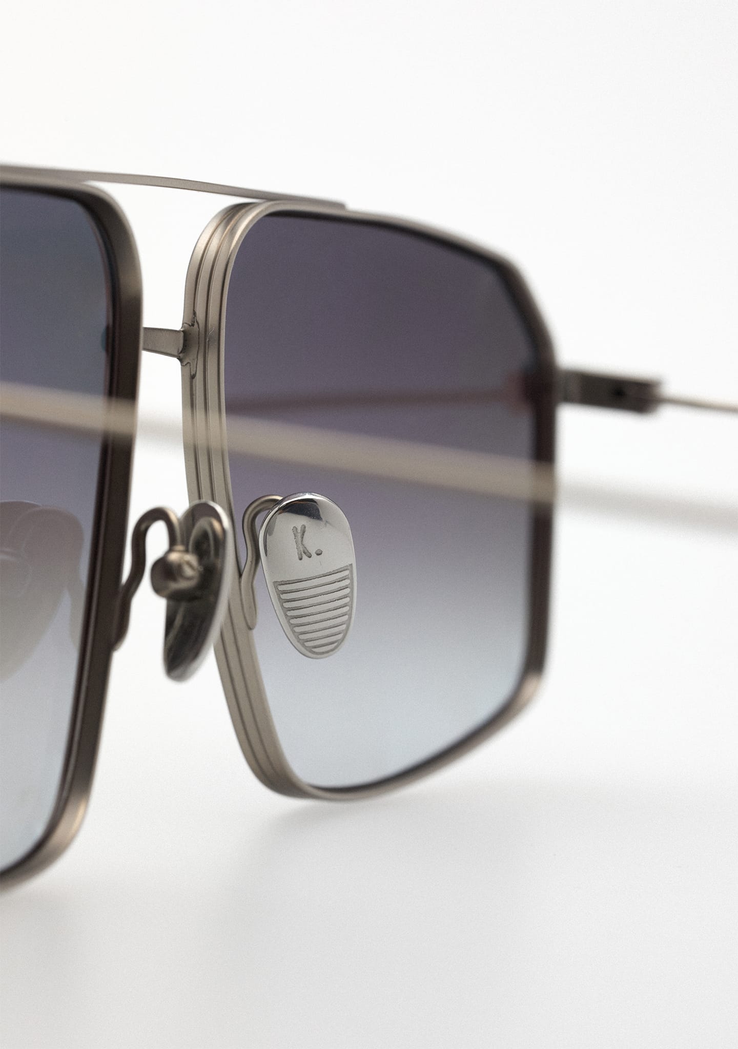 Sunglasses in silver-coloured matt titanium. Rectangular aviator style. Titanium end pieces with grooves. Flexible titanium temples and bridge. Temples with acetate tips. Maximum flexibility, lightness, durability and comfort. Grey gradient tint 2-base lenses with 100% UV protection and anti-reflective treatment. Adjustable titanium nose pads. Handmade.