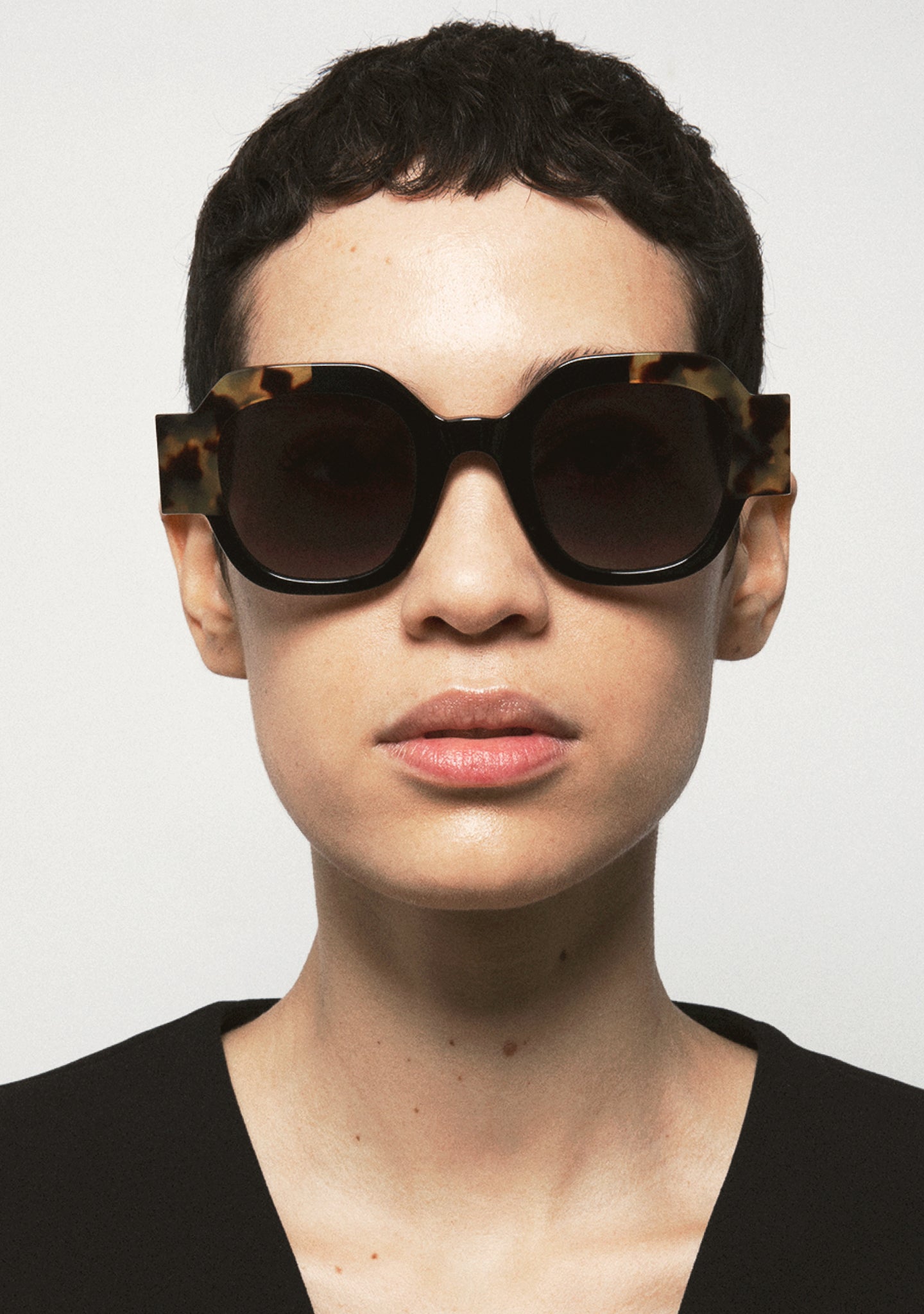 Square sunglasses. Frame front in black acetate with brown tortoiseshell laminate. Acetate temples in brown tortoiseshell with a distinctive stepped design. Black gradient tint base 2 lenses with 100% UV protection and anti-reflective treatment. Category 3 lenses. Built-in acetate nose pads. Handmade.