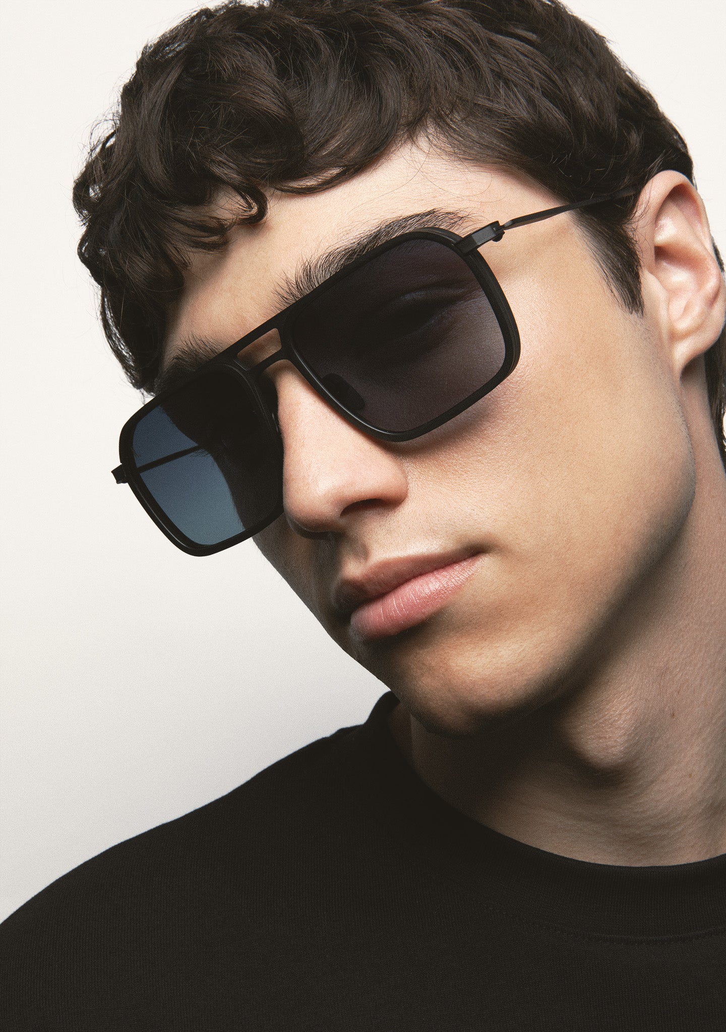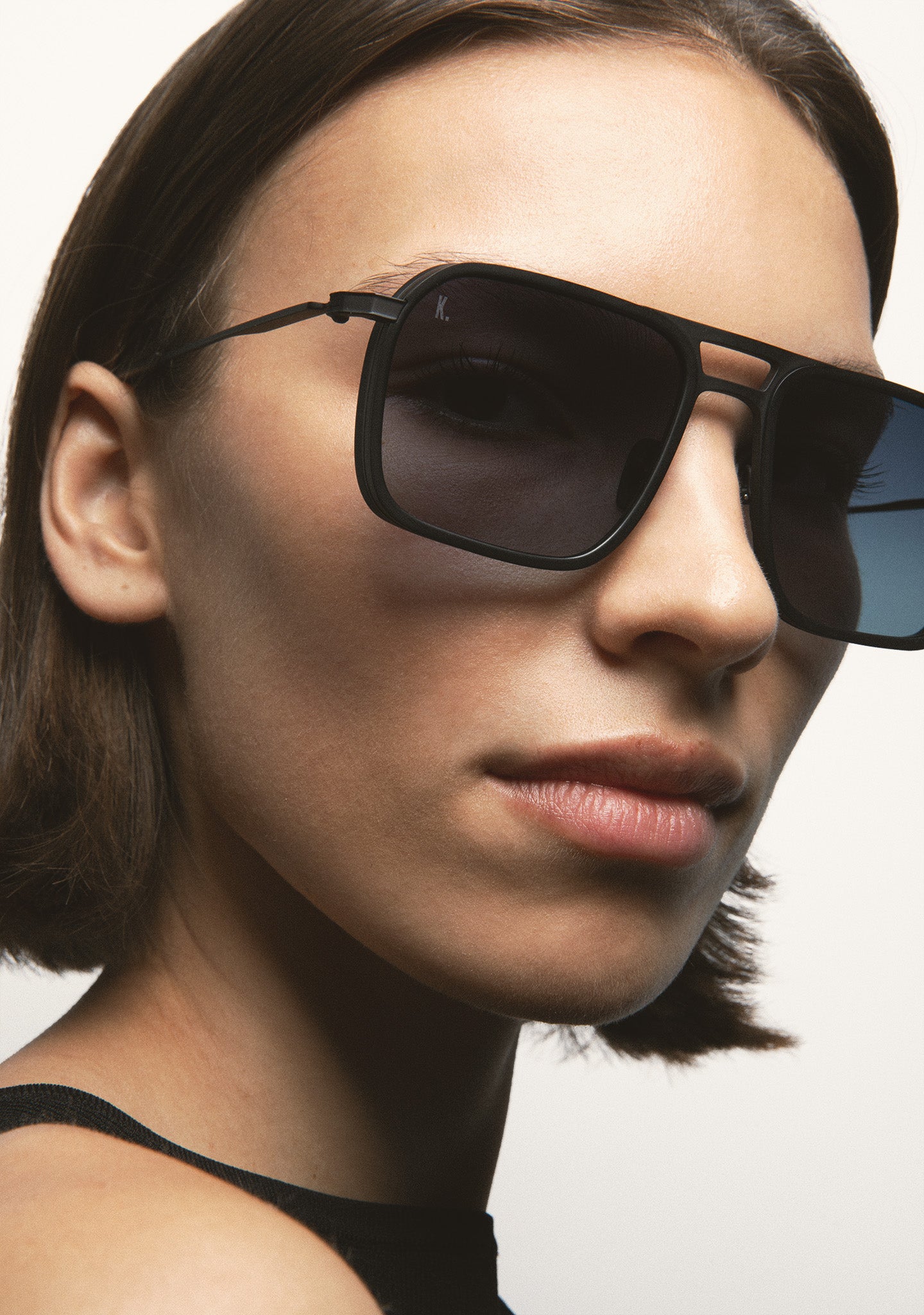 Square-shaped double-bridge sunglasses. Matte dark gray titanium front with dark gray transparent high-density acetate rim. Matte dark gray titanium temples and bridge. Dark gray transparent acetate temple tips. Green photochromic lens, base 2, with UV protection and anti-reflective treatment. Category 1-3 lens. Integrated acetate nose pads. Handmade.