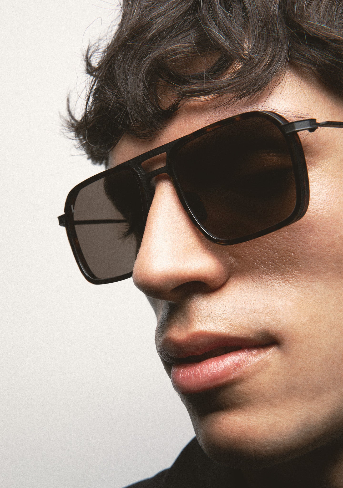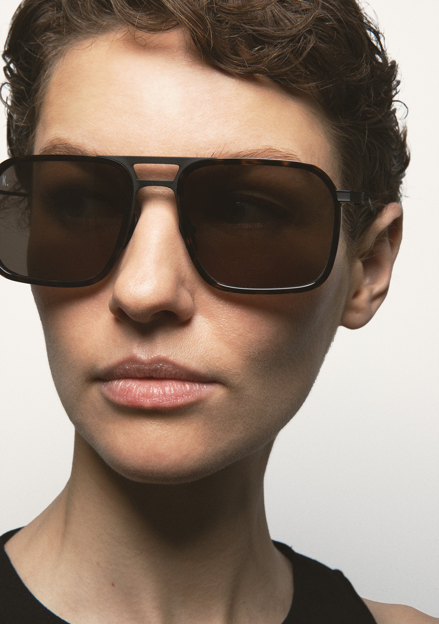 Square-shaped double-bridge sunglasses. Matte dark gray titanium front with dark gray transparent high-density acetate rim. Matte dark gray titanium temples and bridge. Dark gray transparent acetate temple tips. Green photochromic lens, base 2, with UV protection and anti-reflective treatment. Category 1-3 lens. Integrated acetate nose pads. Handmade.
