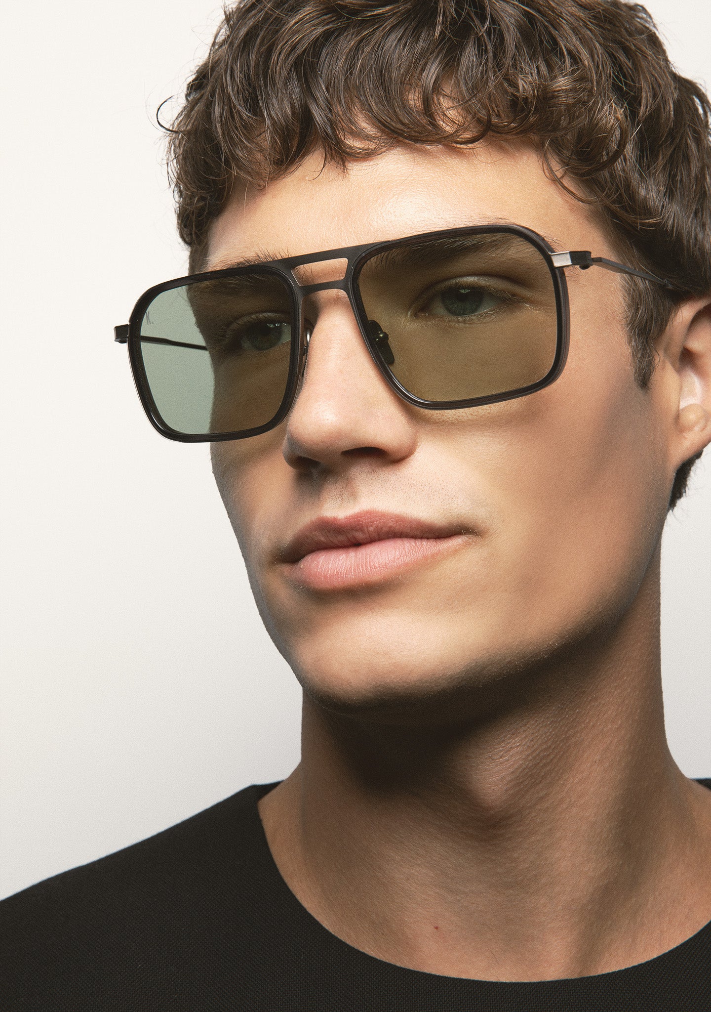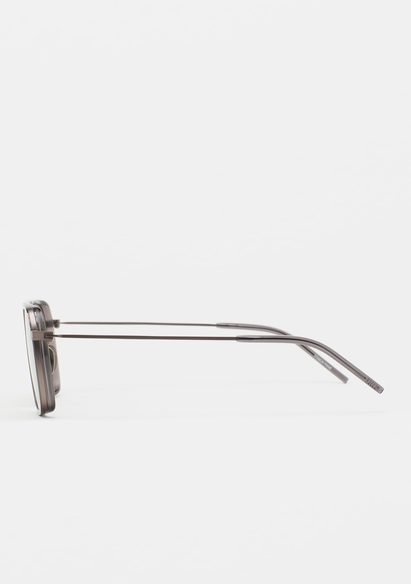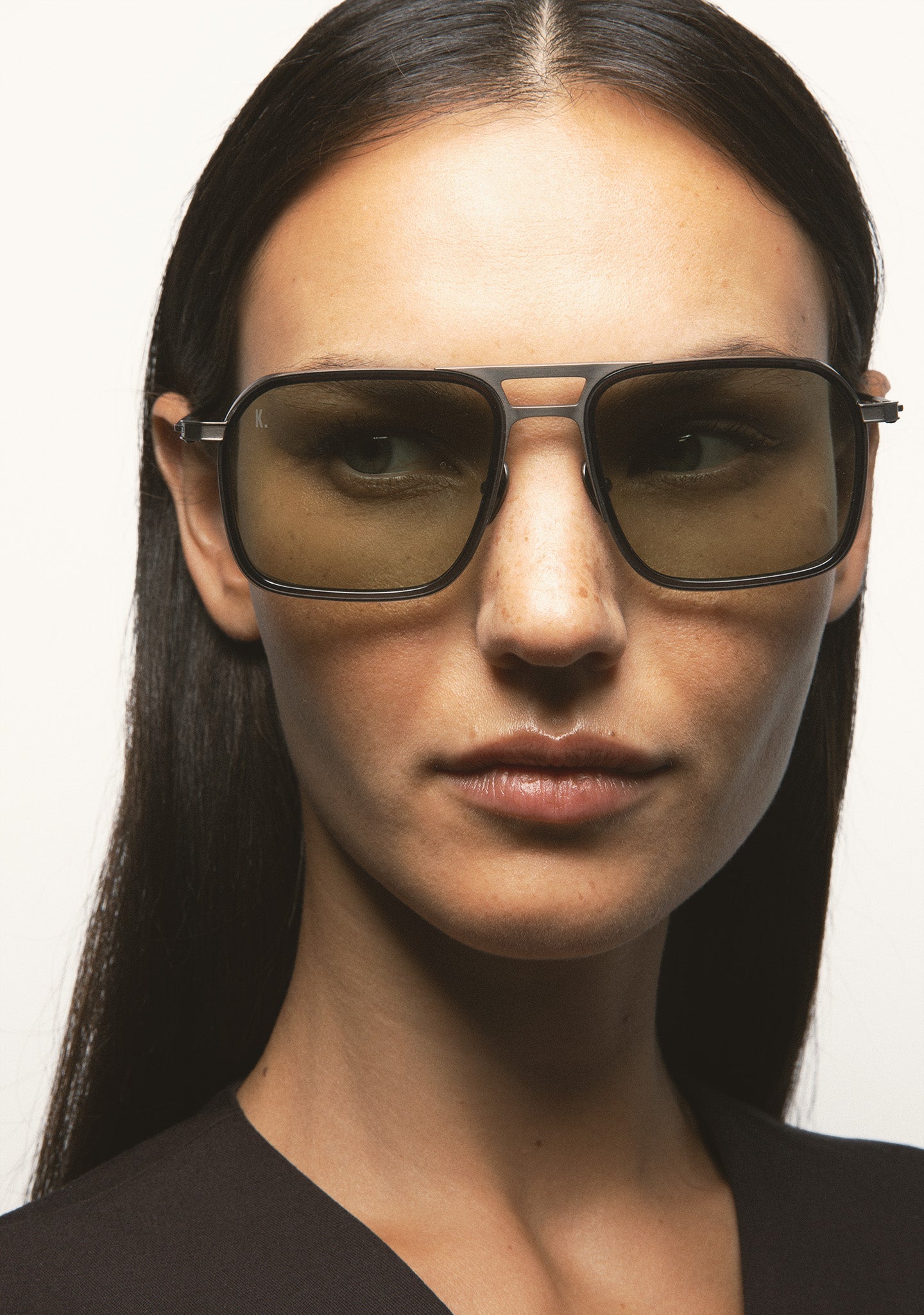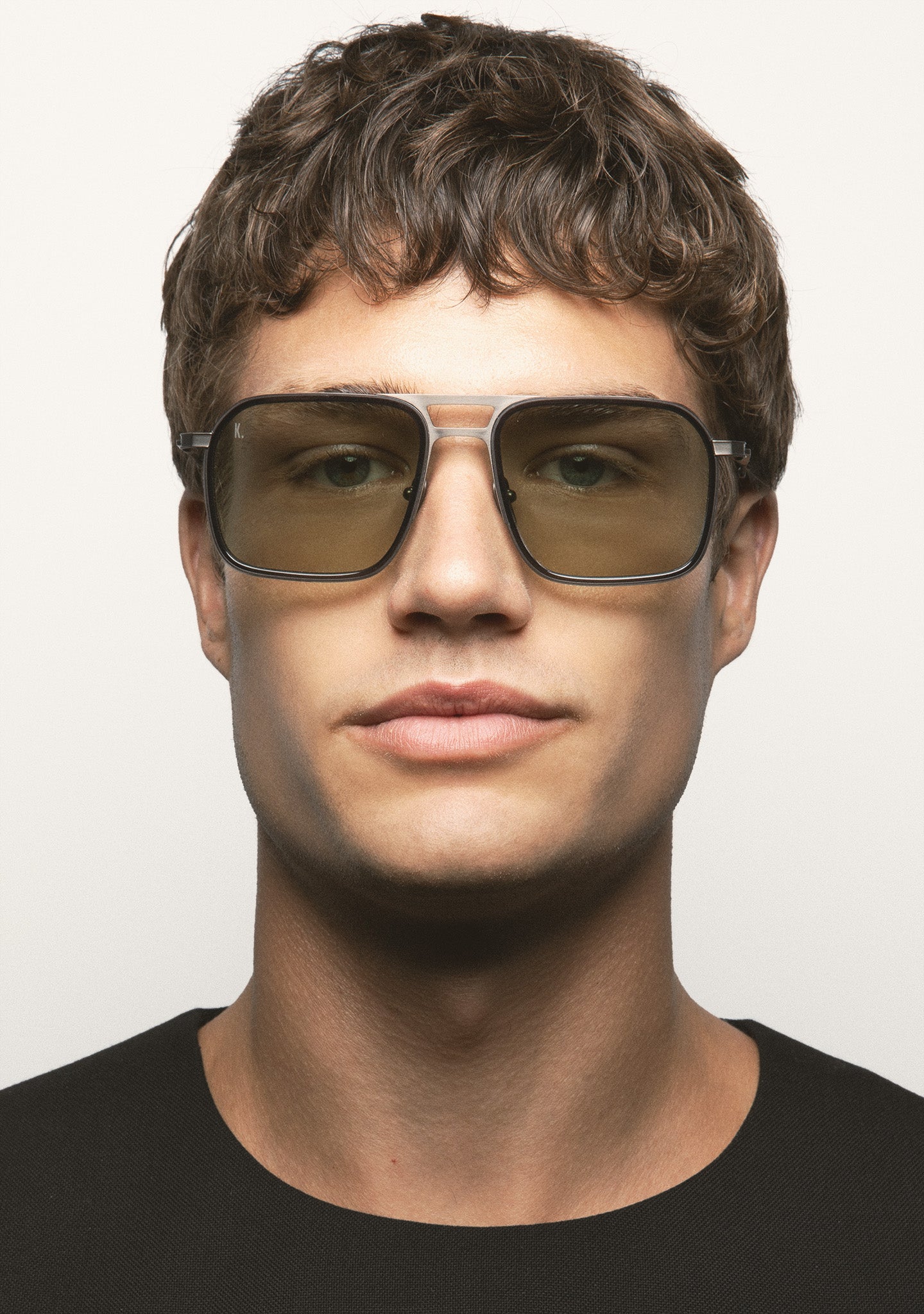 Square-shaped double-bridge sunglasses. Matte dark gray titanium front with dark gray transparent high-density acetate rim. Matte dark gray titanium temples and bridge. Dark gray transparent acetate temple tips. Green photochromic lens, base 2, with UV protection and anti-reflective treatment. Category 1-3 lens. Integrated acetate nose pads. Handmade.