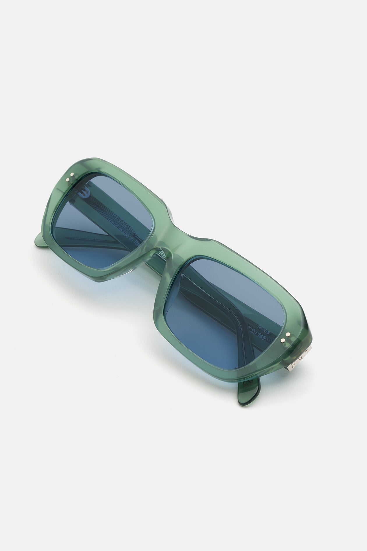 High grade Italian acetate in an elegant sage green acetate. Mounting playful blue lenses by Zeiss in base 2. Premium eyewear handmade in Italy.