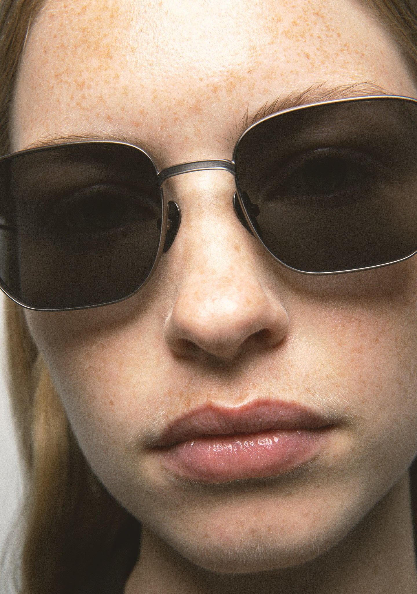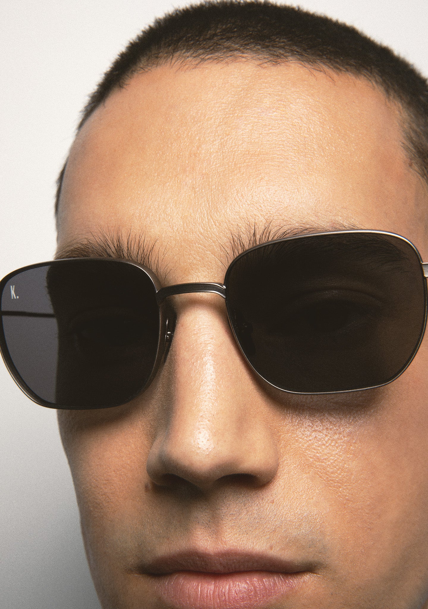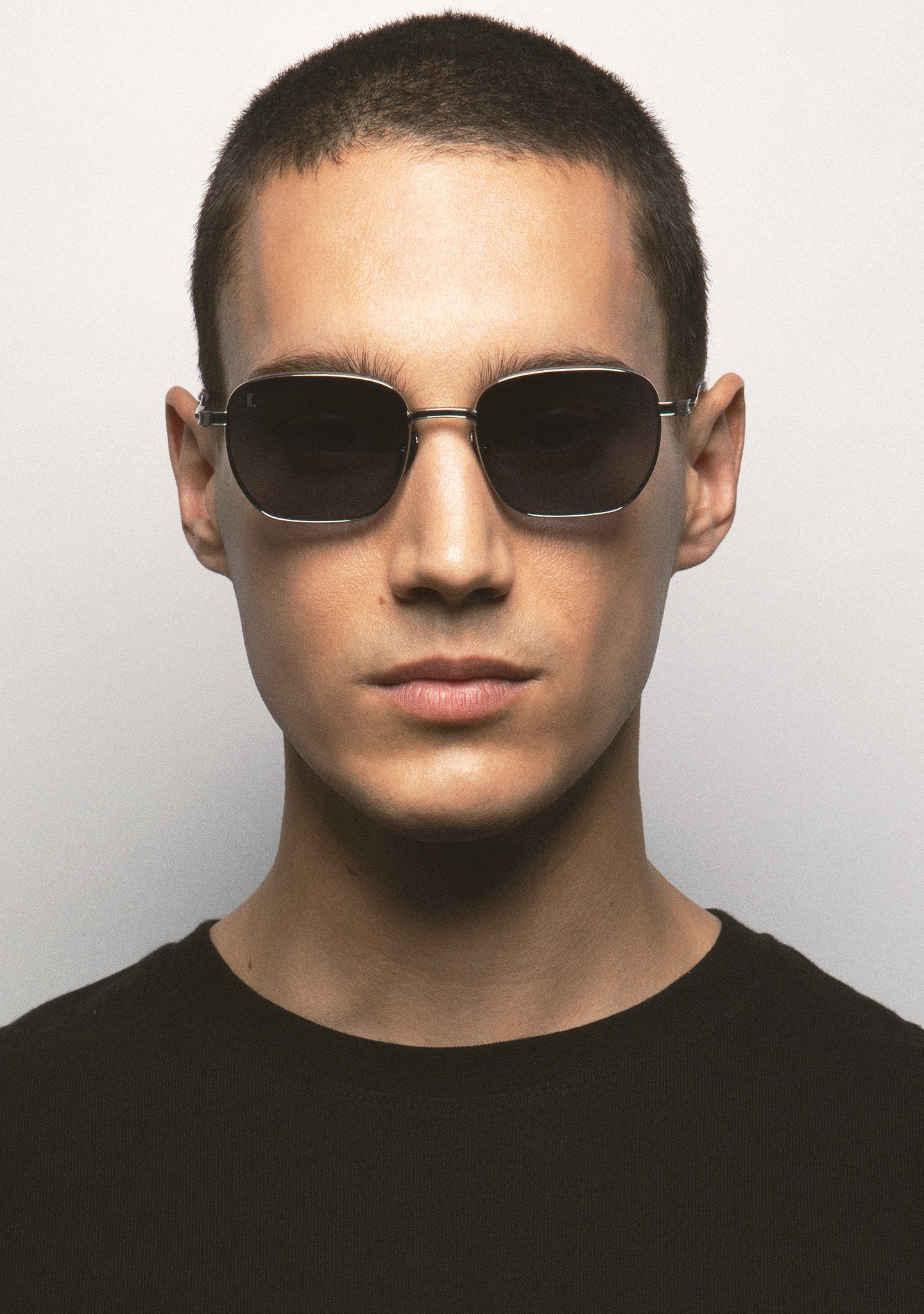 Rectangular-shaped sunglasses. Matte black titanium front and temples. Matte black acetate temple tips. Gray mineral 2-base lens with 100% UV protection and anti-reflective treatment. Category 3 lenses. Built-in nose pads. Handmade.