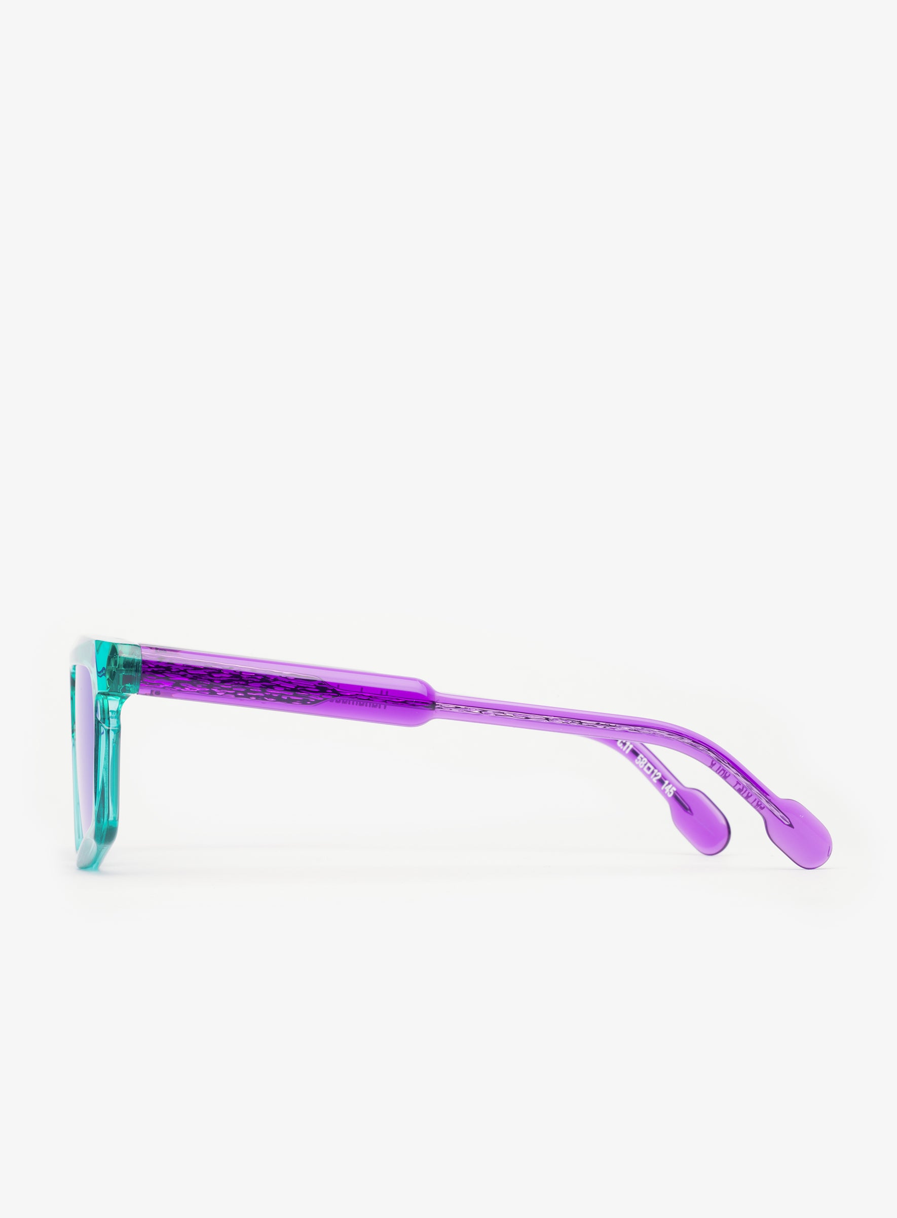 The balance between sharp and round edges and the colored acetate bonding by lamination in the temples are PORTRAIT staples. The hammered visible metal components and iridescent green-purple mirror lenses enrich the look of this piece.